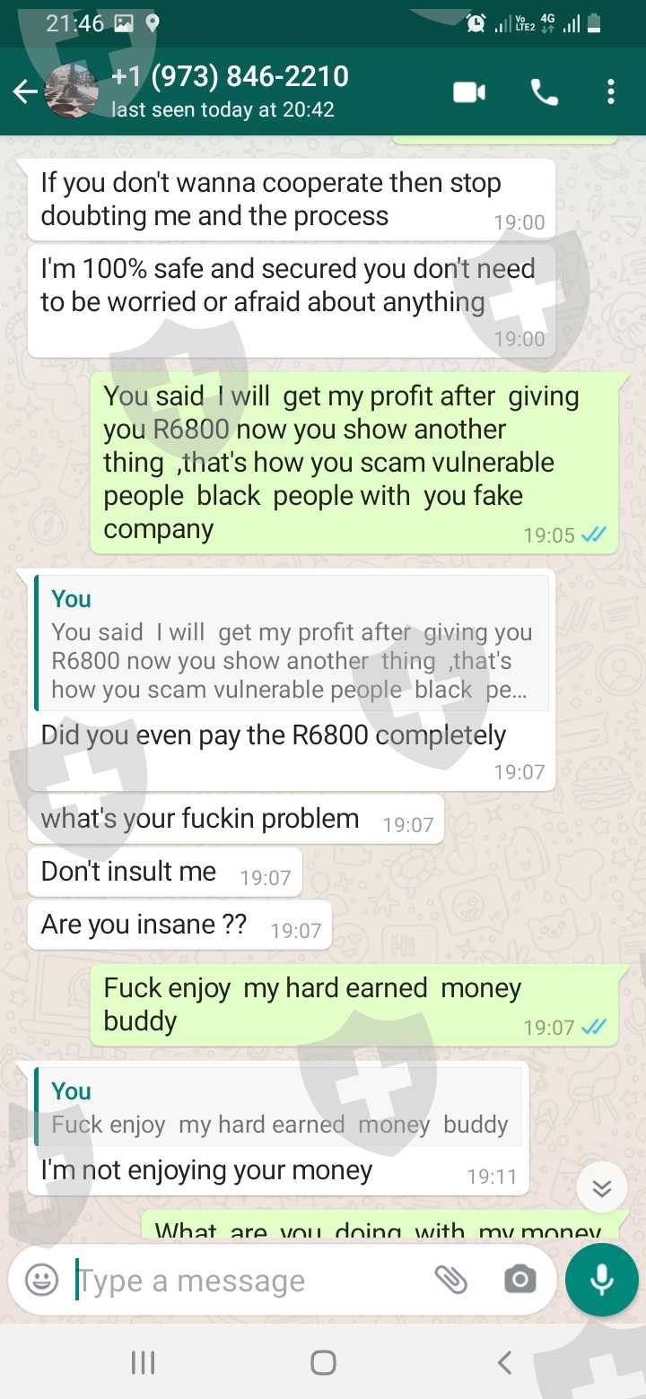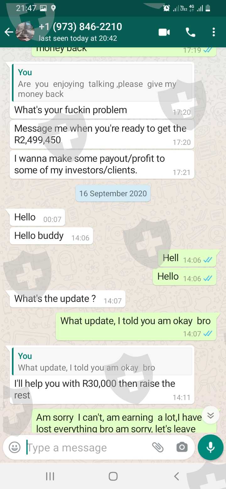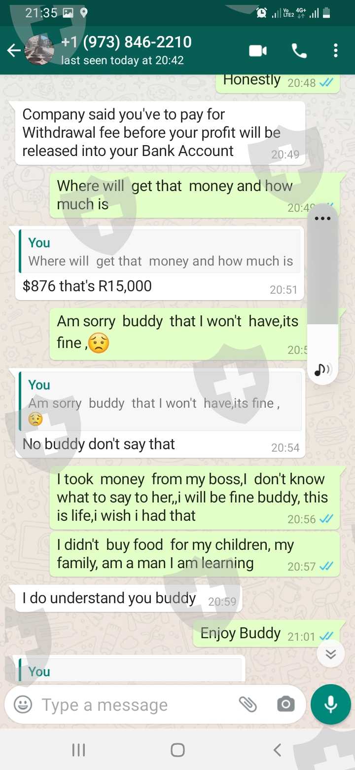 我叫Gabriel Molwantwa Masita,来自南非。我在公司投资,他们承诺利润,后来我发现是诈骗公司,所有关于利润的话都是骗人的。 他们甚至问我要钱,我付了4500兰特。这个叫Matthew Lawson的家伙自称是客户经理,其实是个骗子,和这家公司一样不能相信。从2020年开始,这人就在盈利方面对我撒谎,建议我贷款,现在我因为这家公司负债累累。让我经历这些骗局之后,他还让我给他公司推荐人,好让他诈骗更多人。请大家远离这家公司!他为所欲为因为觉得大家没有地方可以举报他!!
