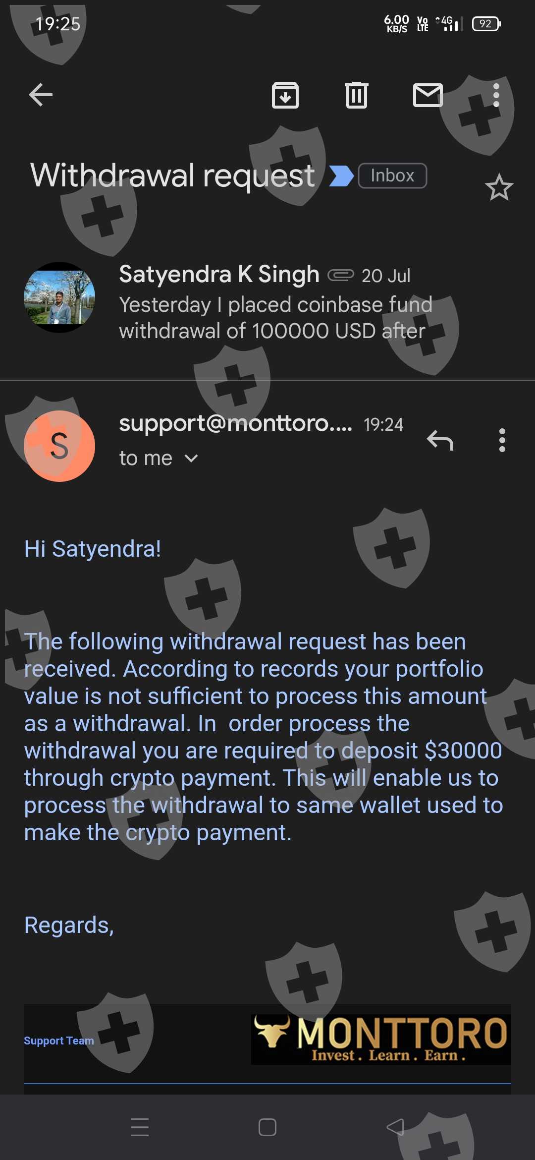 on 19 jul 22 my account manager told me to put 100000 use for withdrawal but 22 jul 22 I got mail from monttoro in order to proceed the withdrawal you are required to deposit 30000 use by crypto payment.