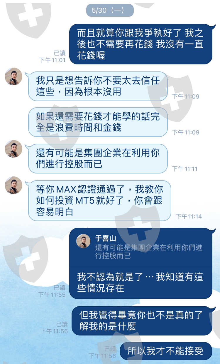 在IG上認識一個自稱新加坡的人,一開始正常聊天,後來陸陸續續透露可以幫忙投資,帶操作,平常採用數據計算的方式計算出黃金的買點,一開始要你註冊正規的MAX平台後來引導要在此平台註冊使用MT5交易,在我質疑平台的正規時也給我該平台的監管資料,讓我增加可信度,每天帶一次操作,漸漸的要我放大本金,因為之前有被騙過,所以有所警戒,不料明明真的有監管資料還是會被騙,在聊天過程中也有聊到之前被騙的經歷,利用我被騙的心理急於追討錢財而再次誘騙,真的相當過分