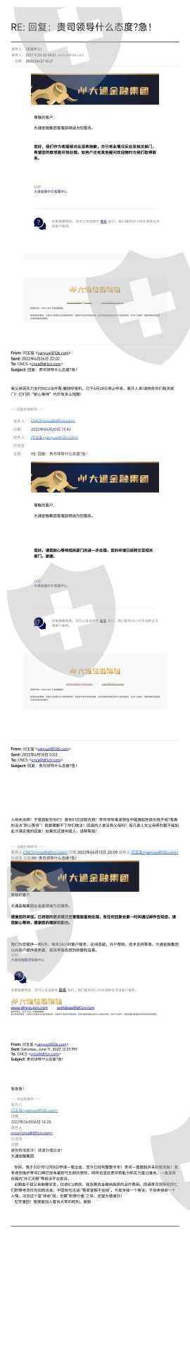 大通金融,账号:333514471。申请出金7个月,不予扣款出金!期间父亲突发脑卒中,抢救,住院,ICU病房急需治疗费!向大通金融说明情况并催促办理出金!但大通金融方面邮件敷衍搪塞!相关领导不顾我父亲死活!自6月3日住进ICU病房,苦撑22天,最后由于支付不起高昂的ICU住院费,断掉呼吸机,无奈放弃了治疗。这期间我与大通沟通过数次。大通相关员工也向他们的外籍领导反映过我的情况!可惜至今了无音讯!大通金融不仅保证不了国内客户资金安全!共同抵制大通金融CEO这种金融界的败类!