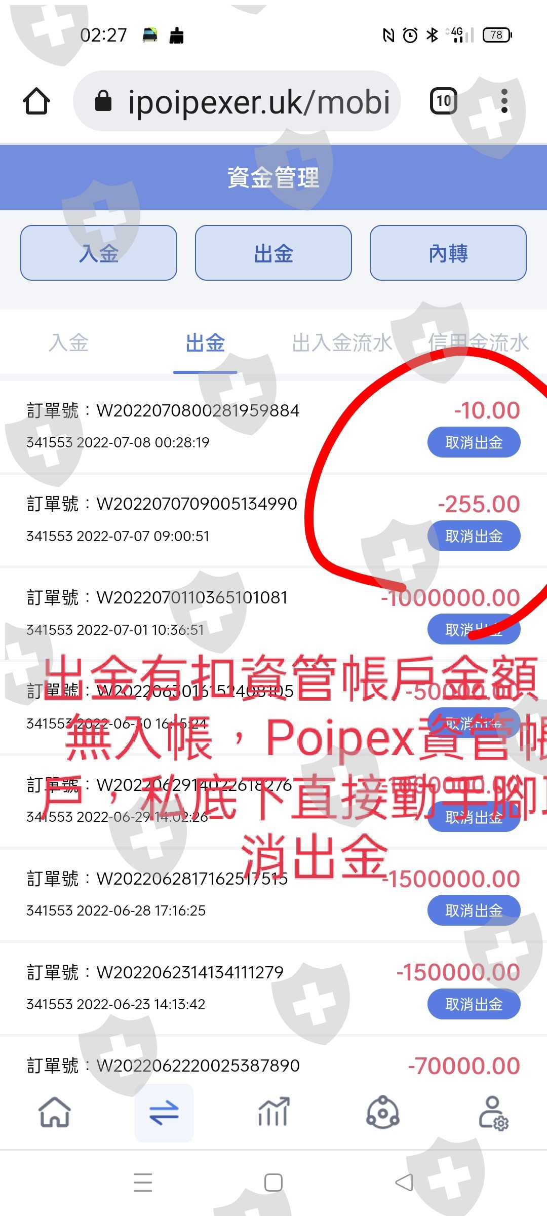 2.出金流水單從資管帳戶扣款,但出金處立即顯示 (取消出金),也就是錢沒入帳,出金的錢也被Poipex這公司動手腳系統中直接騙走了,這是完全沒信用的詐騙平台,