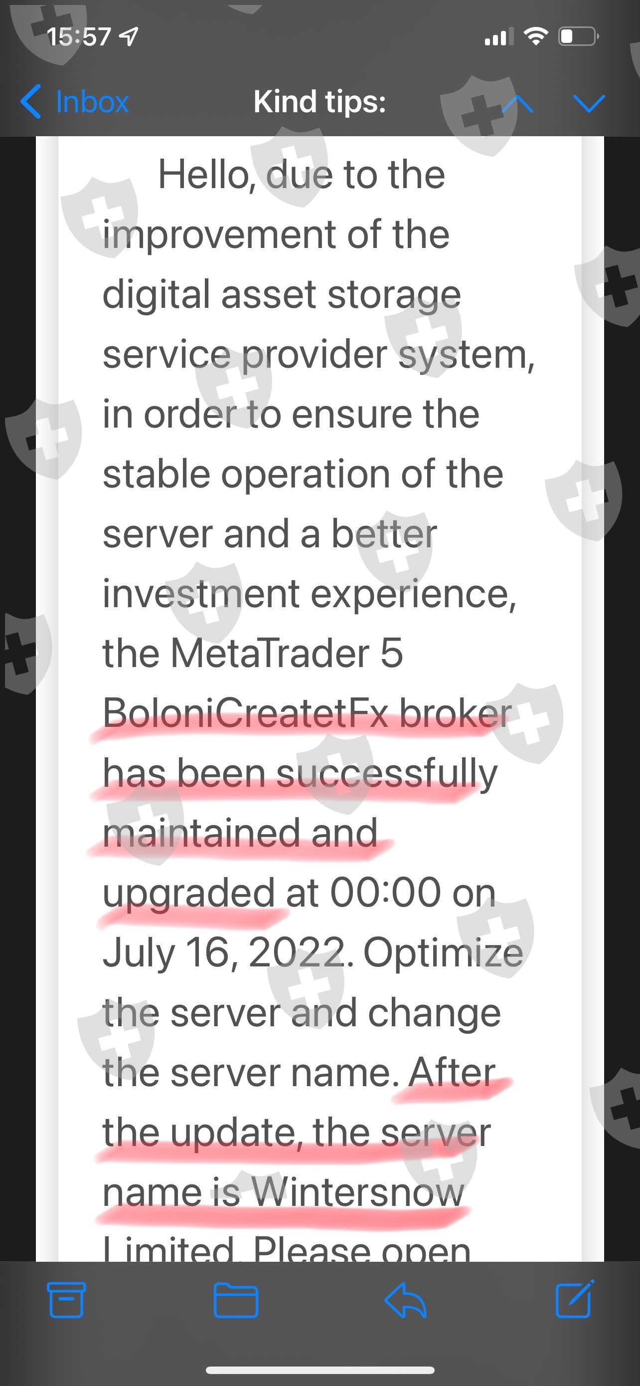第一次使用Trading服务时,我是在Boloni Created FX Co ltd注册的。(见附件1)使用该交易商一段时间后,他们发邮件通知我更换为Wintersnow(见附件2)之后那个,当我要求取款时,温特斯诺让我纳税(如附件 3,4),即使我按照他们的要求支付了一些,也没有发生取款。如果 Wintersnow 不是假交易商,他们应该进行正常的提款流程。