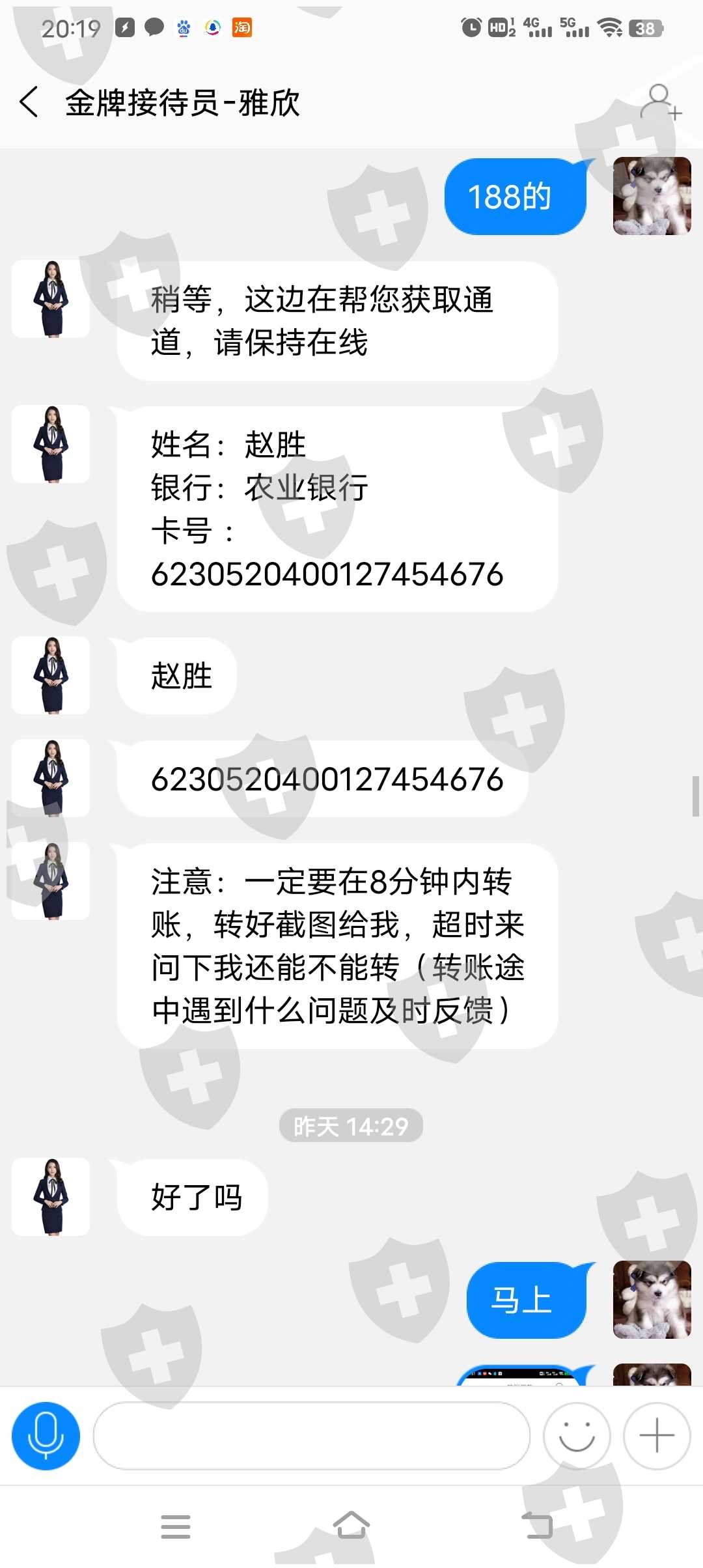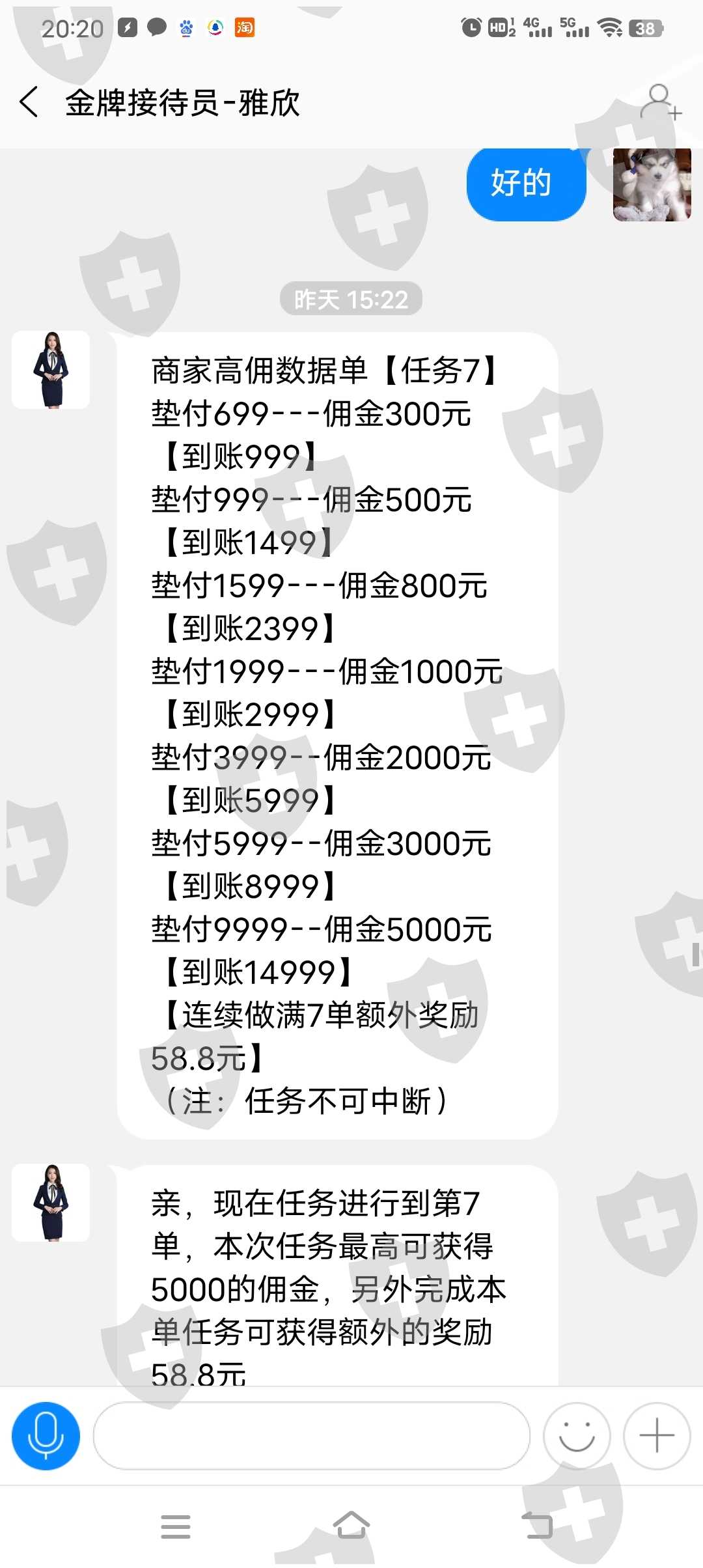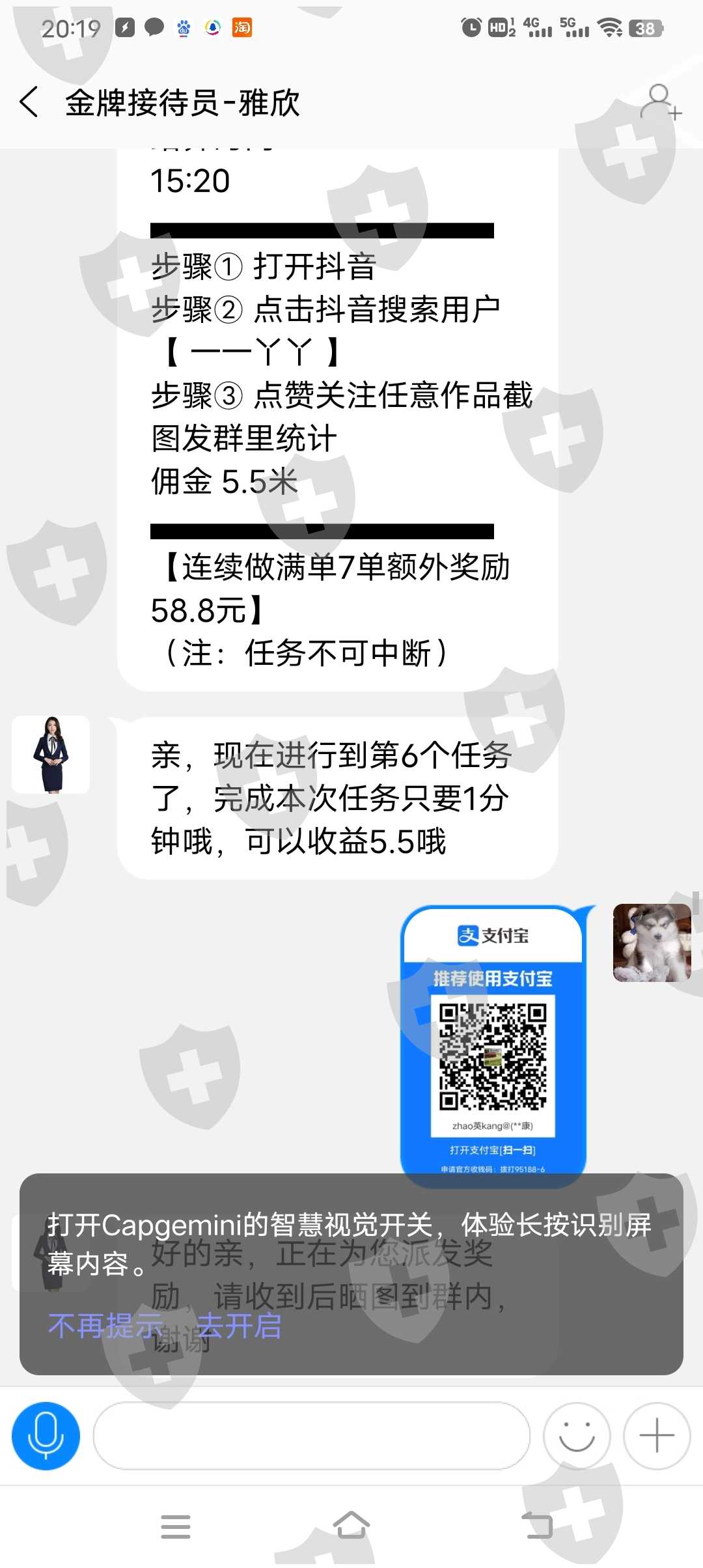 事情完整经过,28日上午莫名其妙被拉入一个 Q群名为如鱼得水11群的。刚开始没有理会,后面老是有人发信息就点进去看了一下。现已解散。然后说此群是为了给抖音号涨粉丝,关注抖音号给返现,五六块左右,让关注的有, 宋嘉儿、痞幼,闲不住的阿俊,爱偷吃的肥喵等等(没有恶意,就是实事求是写经过)之前刷抖音视频的时候就关注过有一些,想着肯定是为了涨更多粉丝,就没在意,之后群主就让下载一个app、凯捷,说之后的任务是在这个APP里面,先是让加了一个接待员,然后被拉进了一个群,看不了群成员,也不能私聊,还是关注抖音号,刚开始做了几单之后,然后就开始发布,一百左右的任务,但是 这些任务是要先垫付,佣金四五十左右,完成的就可以提现,刚开始不敢做,然后后面看群里面都在发完成任务之后提现的截图.我就心动了、就开始做准务,这个任务是接单员给银行卡号、转账之后,另外一个人带我们在一个浏览器网址上面下注福禄寿喜、完成之后提现、完成一单之后,后面金额越来越大;佣金也高,群里面的人都在夸,说挣的多,不知道怎么鬼使神差就跟着做了,这个是一千多的单,那个人把我们拉了一个小群.共五个人, 做完后他说这是优质单 ,需要再完成一单 才可以提现,然后从众心理,看着其他三个人都做了,就剩我一个人,然后那个骗子说大家都在等着我,然后也有点着急,就转进去了988,之后又说我们操作失误,商家需要重新做教据才可以提现,需要从新再投一单4288,就这样一步步被骗了了差不多六千快 现在为止不管怎么说钱都退不了。必须要支付19,800才可以全部提现 发现被骗,所以就没有转