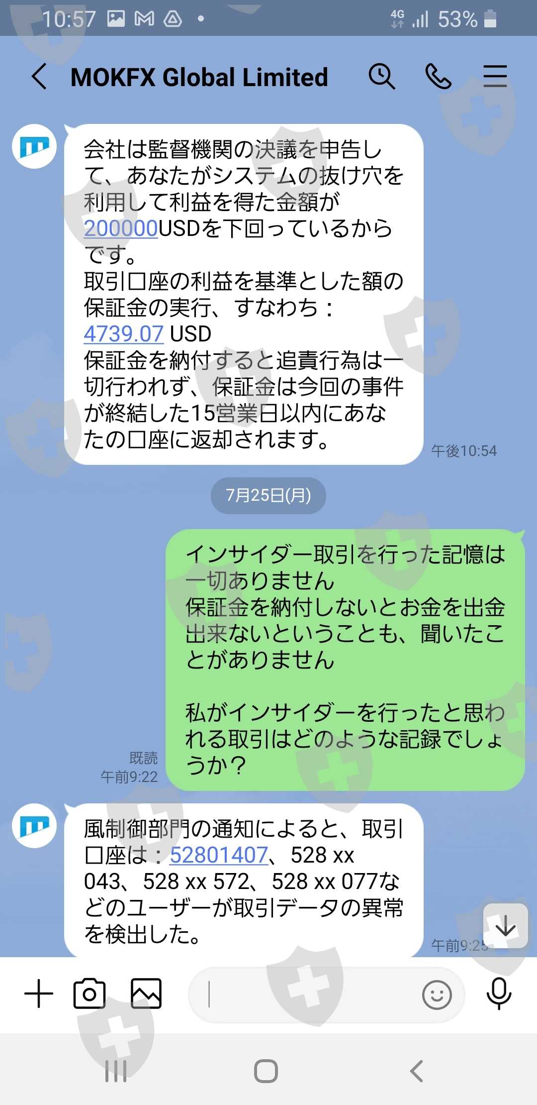 日本在住の台湾人女性からLINEで知り合い、彼女の叔父がFXの技術を持っていて、叔父の真似をすれば勝てると言われた。MOKFXは彼女から勧められ、全て彼女の言う通り口座を開設した。彼女が言う通り操作すると利益が出たので、彼女を信用してしまった。その後、彼女はどんどんお金を口座に入金するように求めてきた。利益を出せば入金する必要がないのでは?との問にも、早く利益を出すためには、元金が必要だからと回答される。ちょうどMOKFXに関して調べていたら、いくつか詐欺の事例を発見した。試しに出金してみようと申請すると、なぜか彼女からすぐに連絡がきて、申請を取り消せと言ってきた。明らかにMOKFXと彼女が繋がっていることが分かったので、カスタマーサポートにお金を引き出したいというと、不正操作だから保証金を払わないと口座を凍結すると言われた。口座に入金したお金だけでも返して欲しい。
