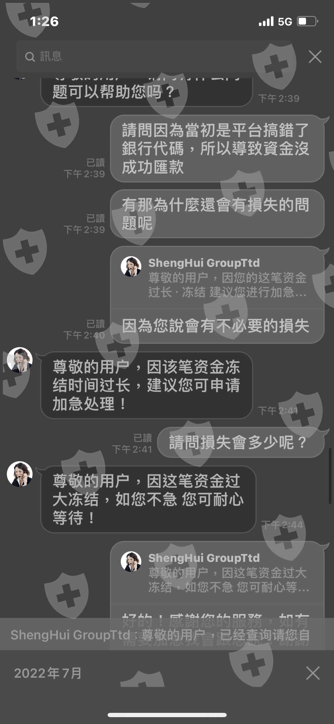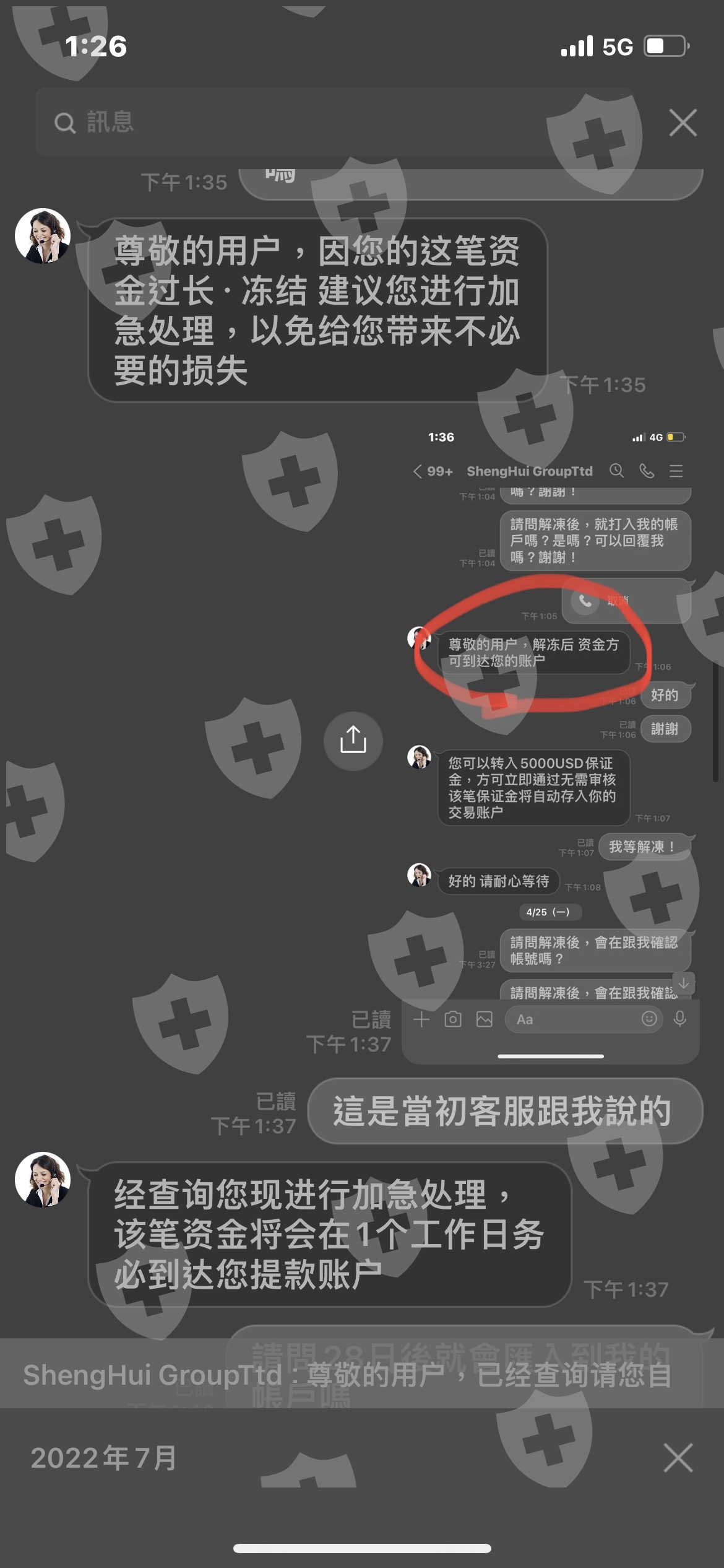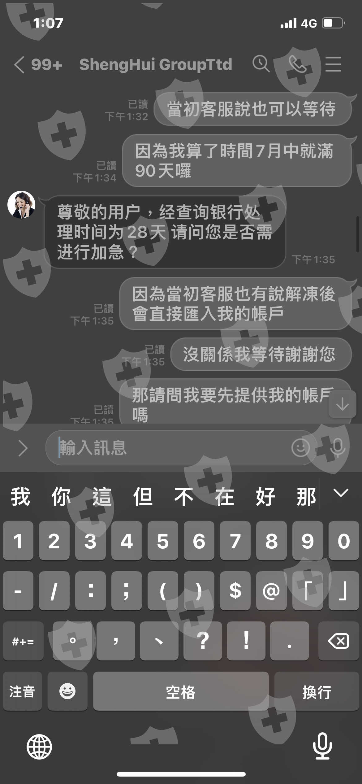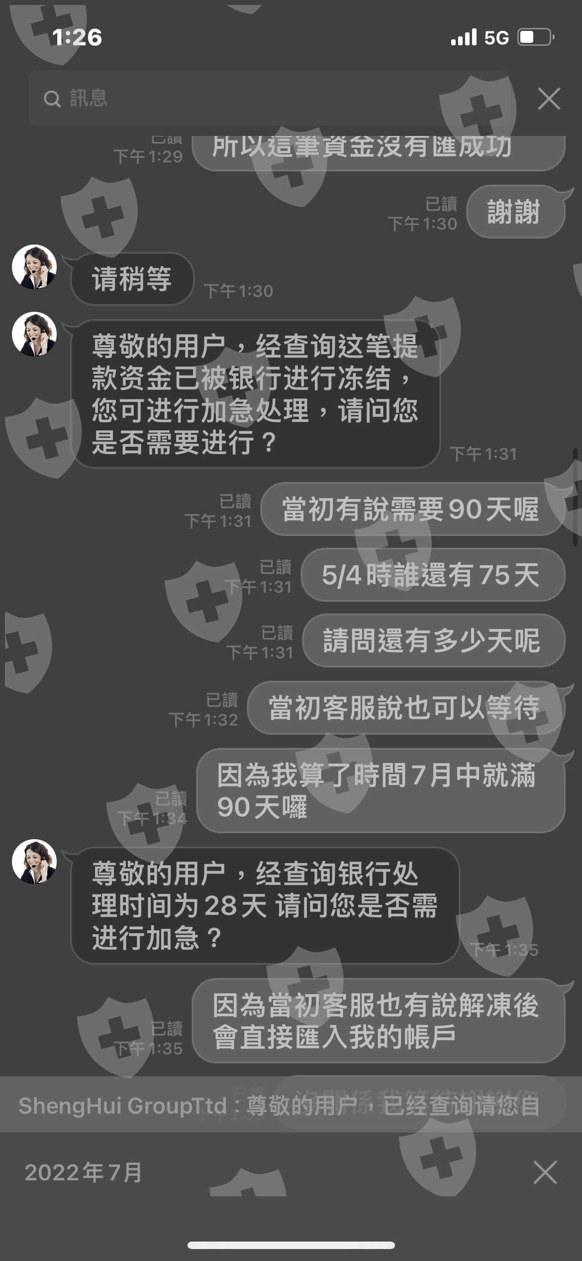 3/29號的時候,平台因為銀行代碼搞錯,所以資金匯款沒有成功,平台告知我資金解凍需要30~50天,到了5/4日我又在次詢問了平台,平台又告訴我還有75天,我當時詢問了平台不是說好30~50天嗎!平台告知我時限為90天!到了7/3號我又問了平台,平台告訴我還有28天,但到了8/1日平台告訴我說,因為受到我的訴訟,叫我自行查詢,但我根本沒訴訟!平台根本不想出金!