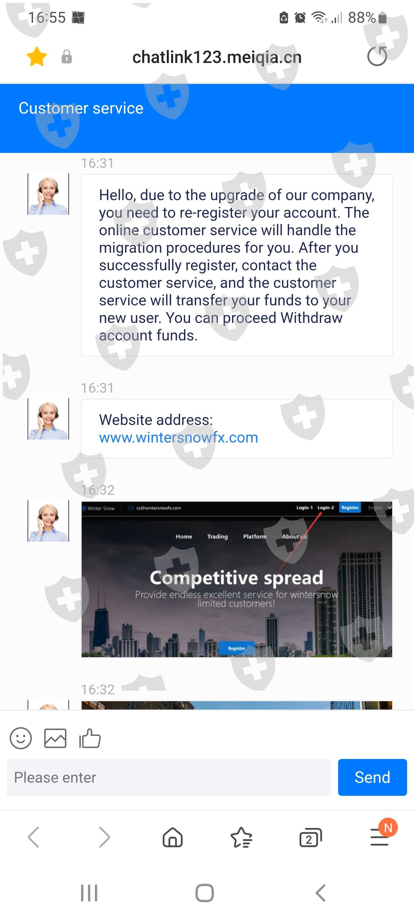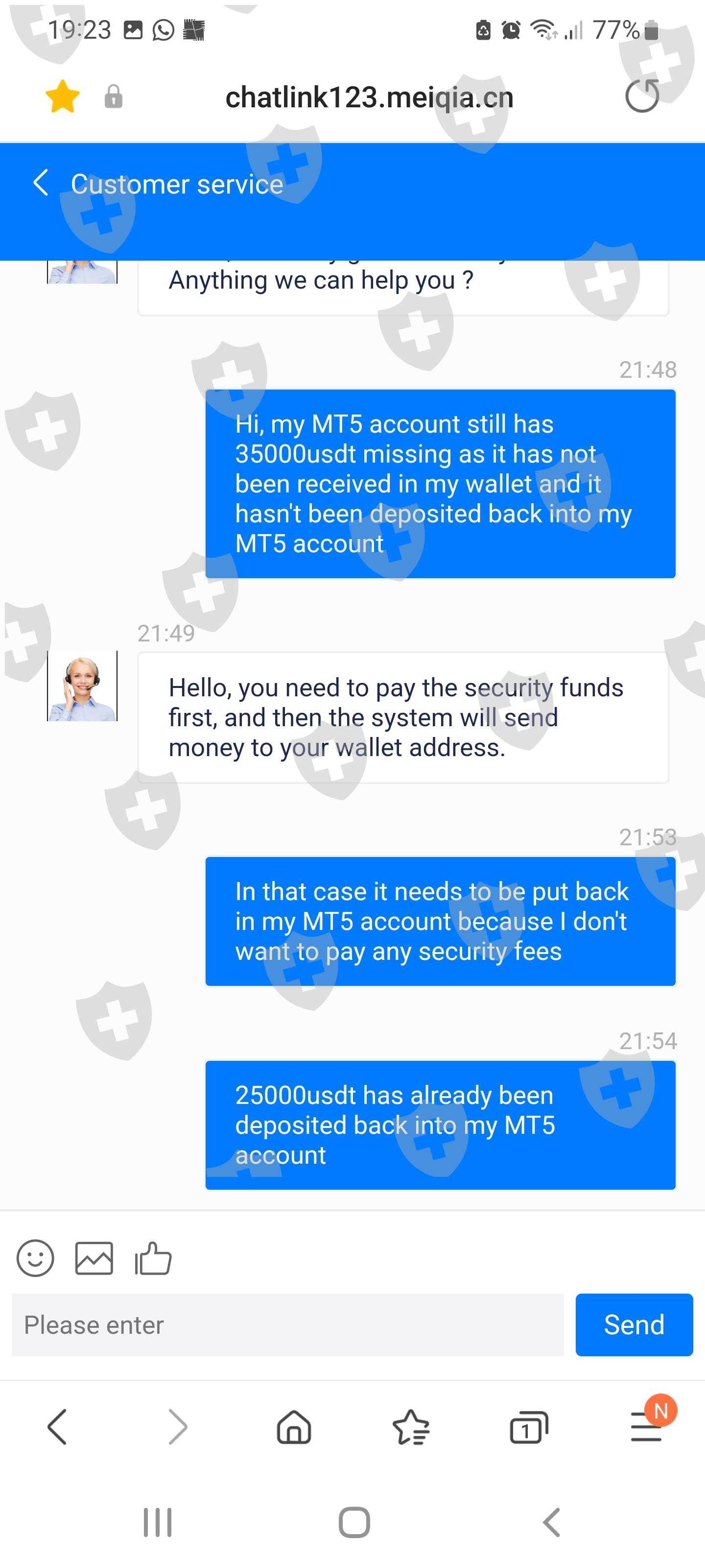 我在博华科技有限公司交易商处存入了 20,000 美元。我进行了许多加密交易,并且能够提取少量。当我想提取更大的金额时,他们拒绝了,客服投诉后禁止我,我的帐户被冻结了。我通过他们的网站 www.wintersnowfx.com 联系了 Wintersnow limited 经纪人并在他们那里注册。我告诉他们博华科技有限公司,他们不再使用 MT5 平台。 Wintersnow limited 说他们会从博华科技有限公司的经纪商那里迁移我的账户,并说我可以通过 MT5 平台进行存款、交易和提款。我试图提取 35,000 美元,但被拒绝。然后我尝试提取 25,000 美元,也被拒绝,然后我再次尝试 35,000 美元,成功,从我的帐户中扣除,但从未收到,也没有记回我的帐户。我联系了客服,客服说如果我支付了账户余额的 5% 以保证支付到我的加密钱包,资金将被释放。我相信 Bohua Technology ltd 和 Wintersnow limited 是同一个经纪人,他们允许人们存入资金、交易,但拒绝让人们在没有某种额外付款的情况下提款。请有人帮我恢复我的账户余额,如果成功,我愿意向某人支付我账户余额的 20%。附上截图作为证据