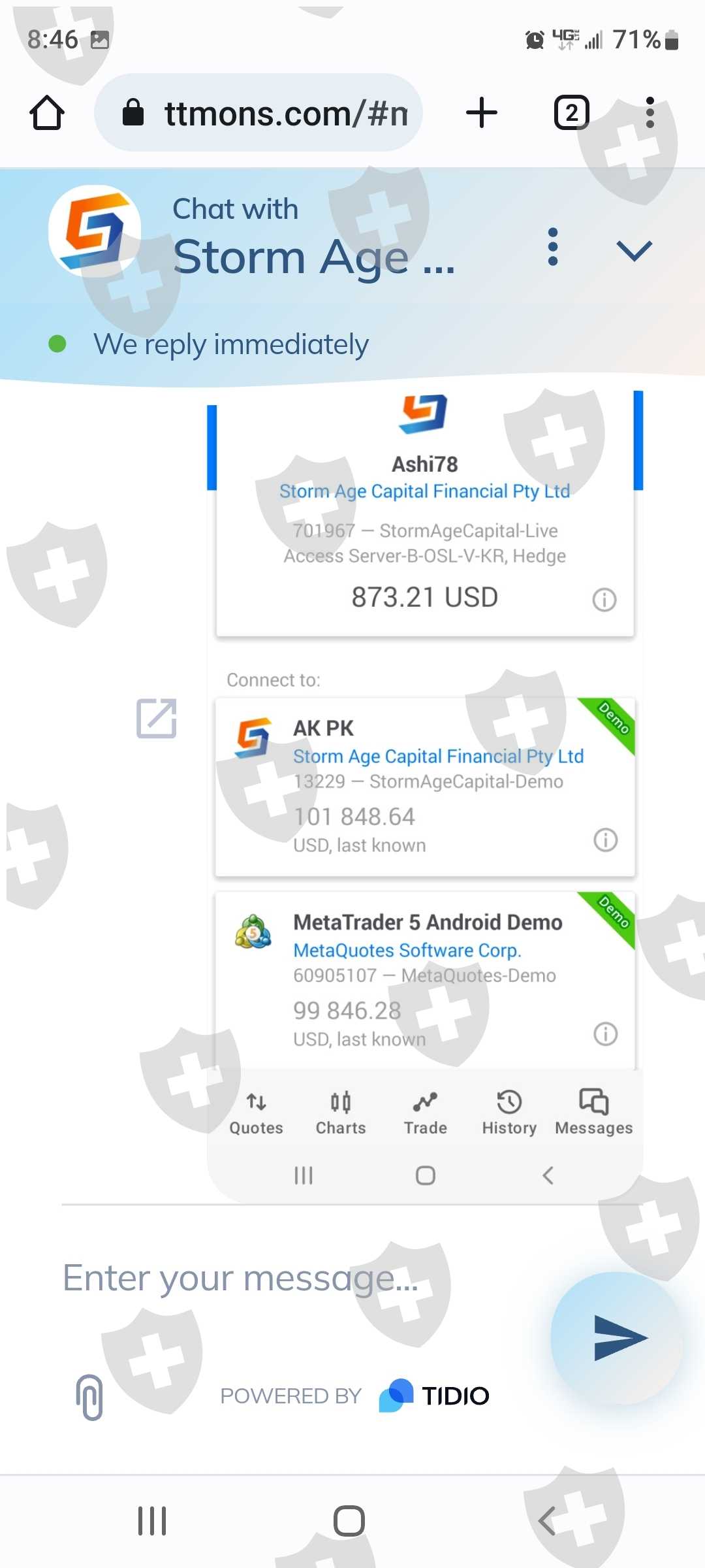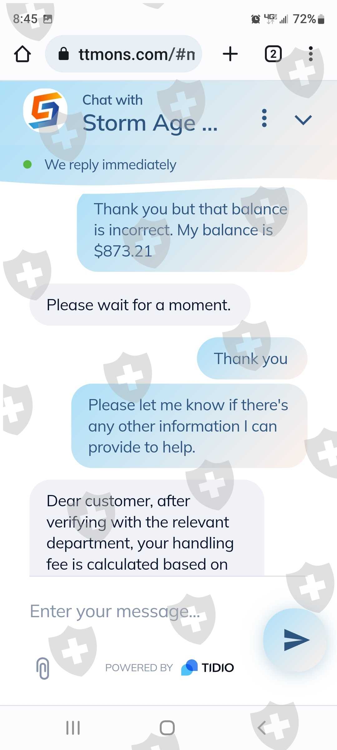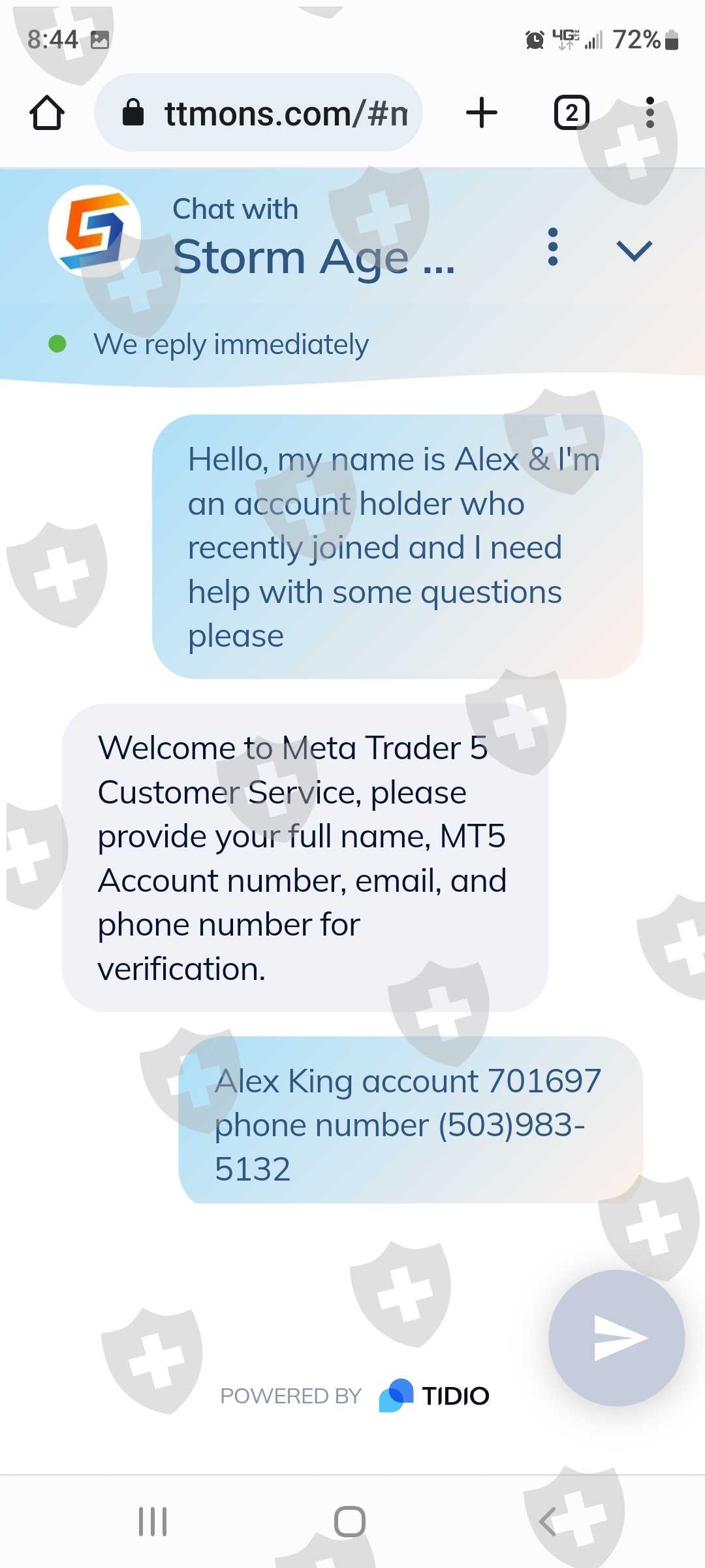 你好,我的名字是亚历克斯金。我被一个来自我在网上认识的人说服在STORM AGE CAPITAL建立一个帐户 。帐号是 701967。一切似乎都很正常,但根据我的判断,我加入了一个交易应用程序来积累资金。最近我发现说服我的人是个骗子。我非常担心我存入风暴时代账户的钱会丢失!我通过他们网站上的聊天选项联系了客户服务。我的谈话令人担忧。我需要多次尝试询问联系电话号码,现在回头看,他们甚至不知道自己的身份。我想关闭这个帐户,如果我能收回我的任何资金。我的口袋里只有 660.00 美元。如果您需要我提供任何其他信息,请告诉我。由于图片上传限制,我只能提供部分对话谢谢!