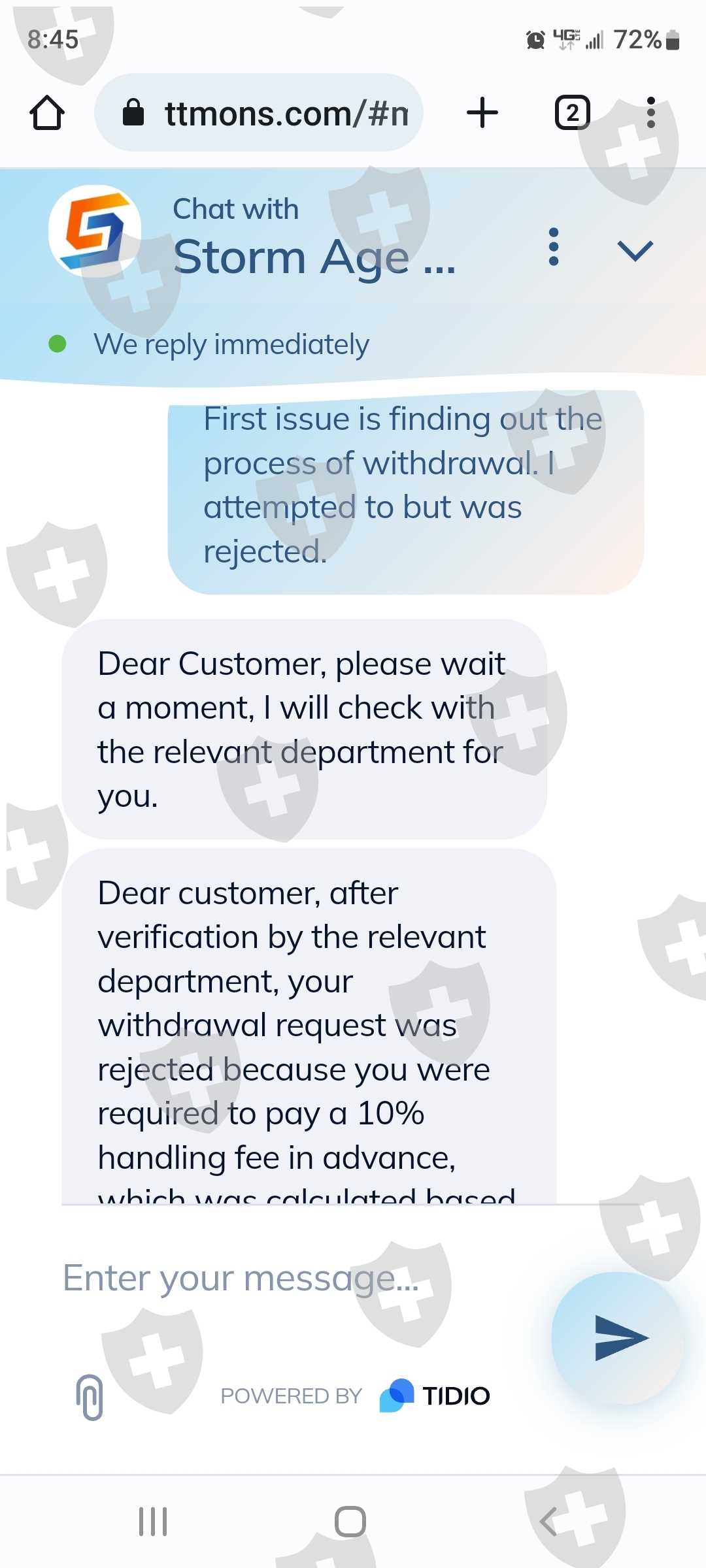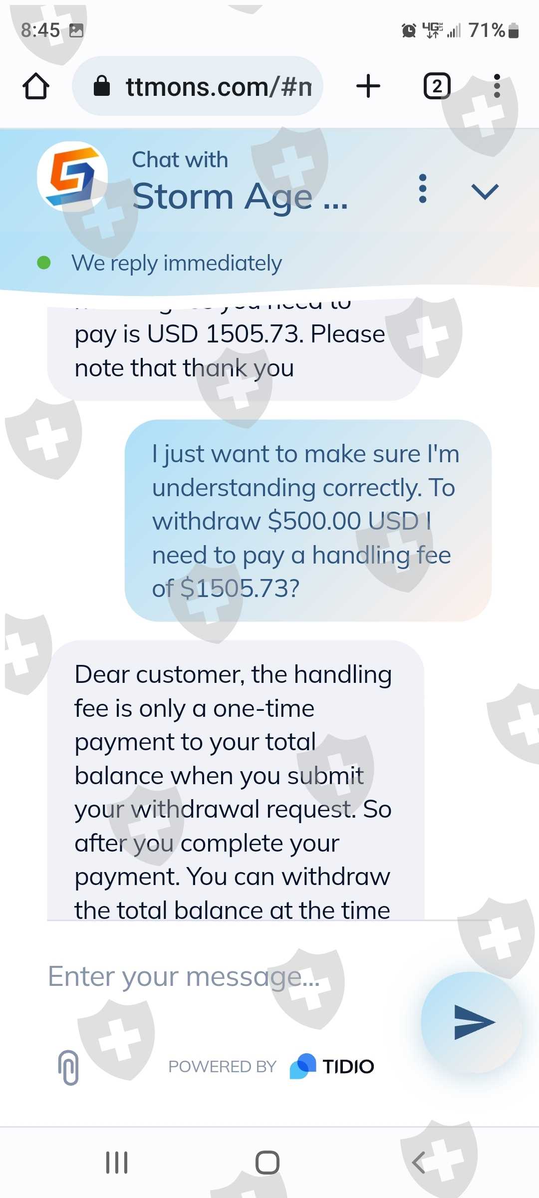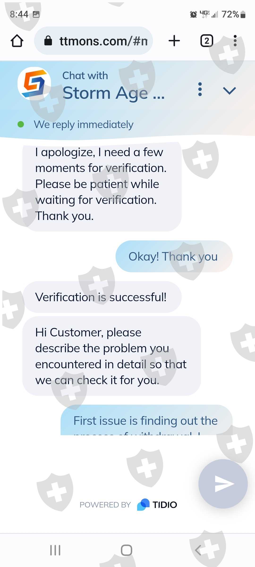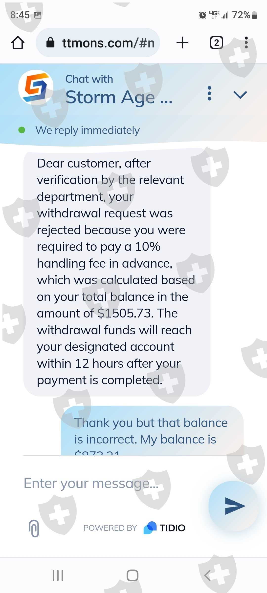 你好,我的名字是亚历克斯金。我被一个来自我在网上认识的人说服在STORM AGE CAPITAL建立一个帐户 。帐号是 701967。一切似乎都很正常,但根据我的判断,我加入了一个交易应用程序来积累资金。最近我发现说服我的人是个骗子。我非常担心我存入风暴时代账户的钱会丢失!我通过他们网站上的聊天选项联系了客户服务。我的谈话令人担忧。我需要多次尝试询问联系电话号码,现在回头看,他们甚至不知道自己的身份。我想关闭这个帐户,如果我能收回我的任何资金。我的口袋里只有 660.00 美元。如果您需要我提供任何其他信息,请告诉我。由于图片上传限制,我只能提供部分对话谢谢!