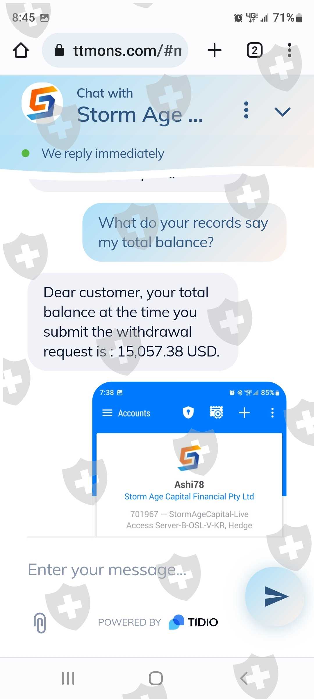 Hello, my name is Alex King. I was talked into setting up an account with Storm Age Capital from a person I met online. Account number is 701967. Everything seemed normal but against my better judgment I was into joining a trading app to build up money. Recently I found out the person whom talked me into this is a scammer. I am very concerned that the money I deposited into my Storm Age account will be lost! I contacted customer service through a chat option on their website. My conversation was concerning. It would take me multiple attempts to ask for Contact phone numbers and now looking back they don't even identify themselves. I am wanting to close this account and if I can recover any of my funds. I am out of pocket only $660.00. Please let me know if you need me to provide anything else. I could only provide part of my conversation due to picture upload limits Thank you!