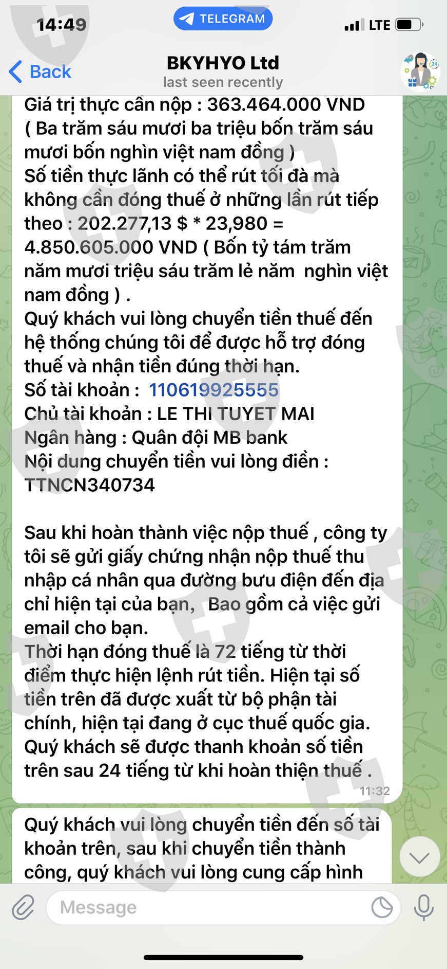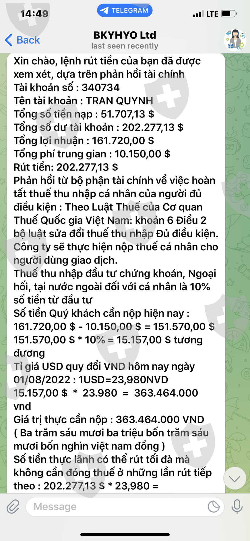 我联系了客户服务,他们要求我为超过 15,000 美元的利润支付称为个人所得税的税费,并且必须在提款前支付一次。这是非常不合理的,因为据我了解,越南法律不允许外汇经纪商经营,也不管理越南境内自营交易者的税收。此外,当企业盈利时,越南法律规定有两种纳税形式:用户在有利润时向税务机关申报纳税或将扣除个人所得税。用户提款。所以地板 BKYHYO要求我对利润缴纳10%的个人所得税是完全不合理的,不符合越南法律,也不能保证在我转账缴税后,交易所会将所有本金和利润转移给我。我看这个楼层有很明显的用户欺诈迹象!!!