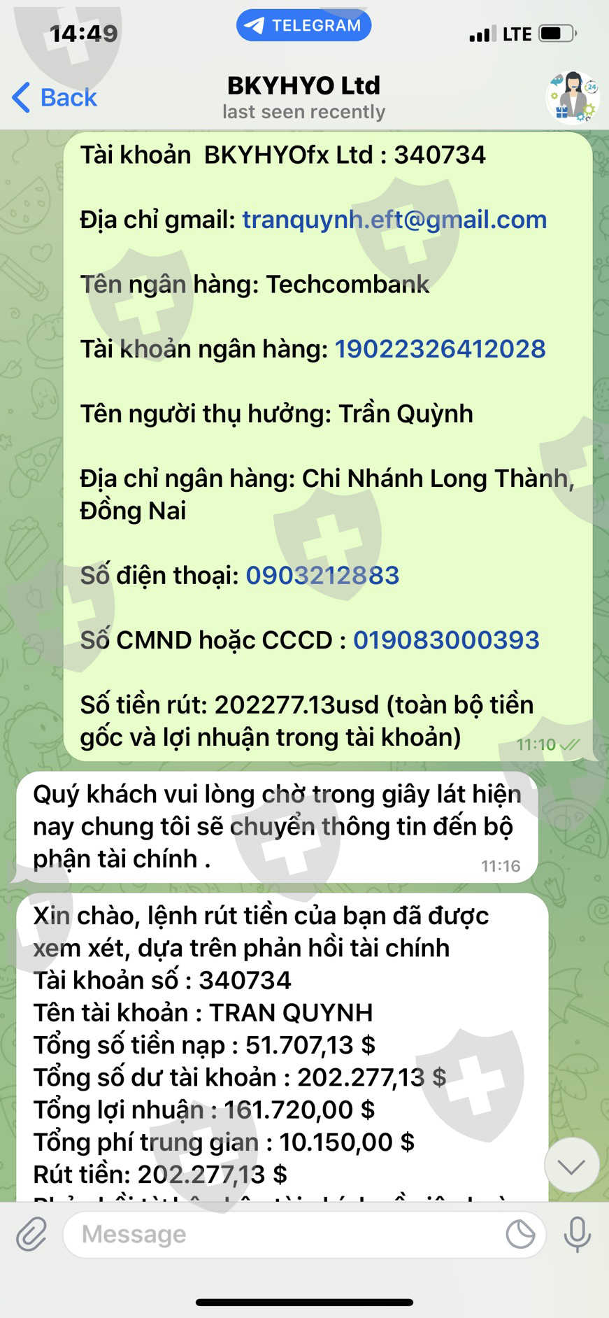 Tôi liên hệ với chăm sóc khách hàng thì họ yêu cầu tôi phải đóng một khoản thuế phí gọi là thuế thu nhập cá nhân trên lợi nhuận lên tới hơn 15.000$ và phải đóng luôn một lần trước khi rút. Điều này rất vô lý vì theo tôi tìm hiểu luật pháp ở Việt Nam không cấp phép cho các sàn forex hoạt động và cũng không quản lý thu thuế của người tự giao dịch trên lãnh thổ Việt Nam. Hơn nữa khi hoạt động kinh doanh có lợi nhuận thì luật pháp Việt Nam quy định có Hai hình thức nộp thuế là người dùng tự khai báo nộp thuế cho cơ quan thuế khi có phát sinh lợi nhuận hoặc sẽ khấu trừ thuế thu nhập cá nhân ngay trên số lợi nhuận mà người dùng thực hiện rút tiền. Như vậy sàn BKYHYO yêu cầu tôi phải chuyển khoản đóng trước 10% thuế thu nhập cá nhân trên lợi nhuận là hoàn toàn vô lý, khống đúng với quy định của luật pháp Việt Nam và cũng không có gì đảm bảo là sau khi tôi chuyển tiền nộp thuế thì sàn sẽ chuyển toàn bộ tiền gốc và lợi nhuận cho tôi. Tôi thấy sàn này có dấu hiệu lừa đảo người dùng rất rõ ràng!!!