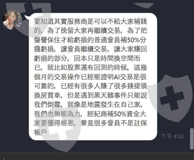 這平台7月間一夜詐騙了我 9萬多美金,說什麼AI交易遇到了黑天鵝,還要我們補損失金額的6成,才可以繼續交易和出金,不補繳金額就把我剔除平台,但這個平台還是一樣繼續在行騙