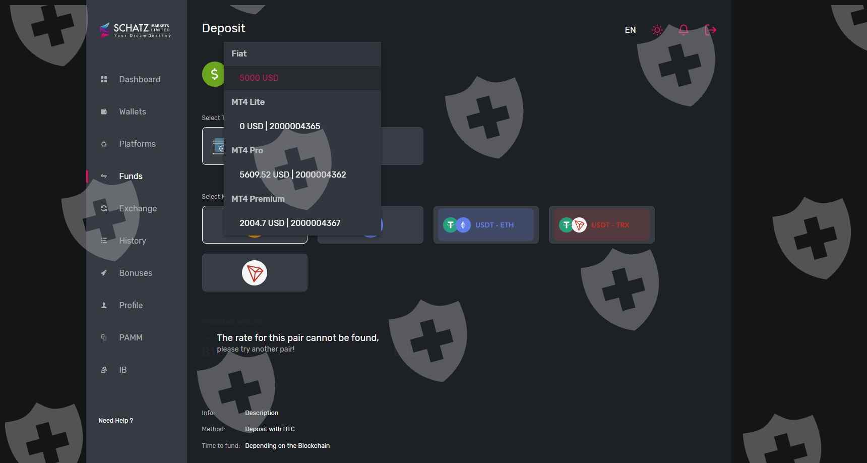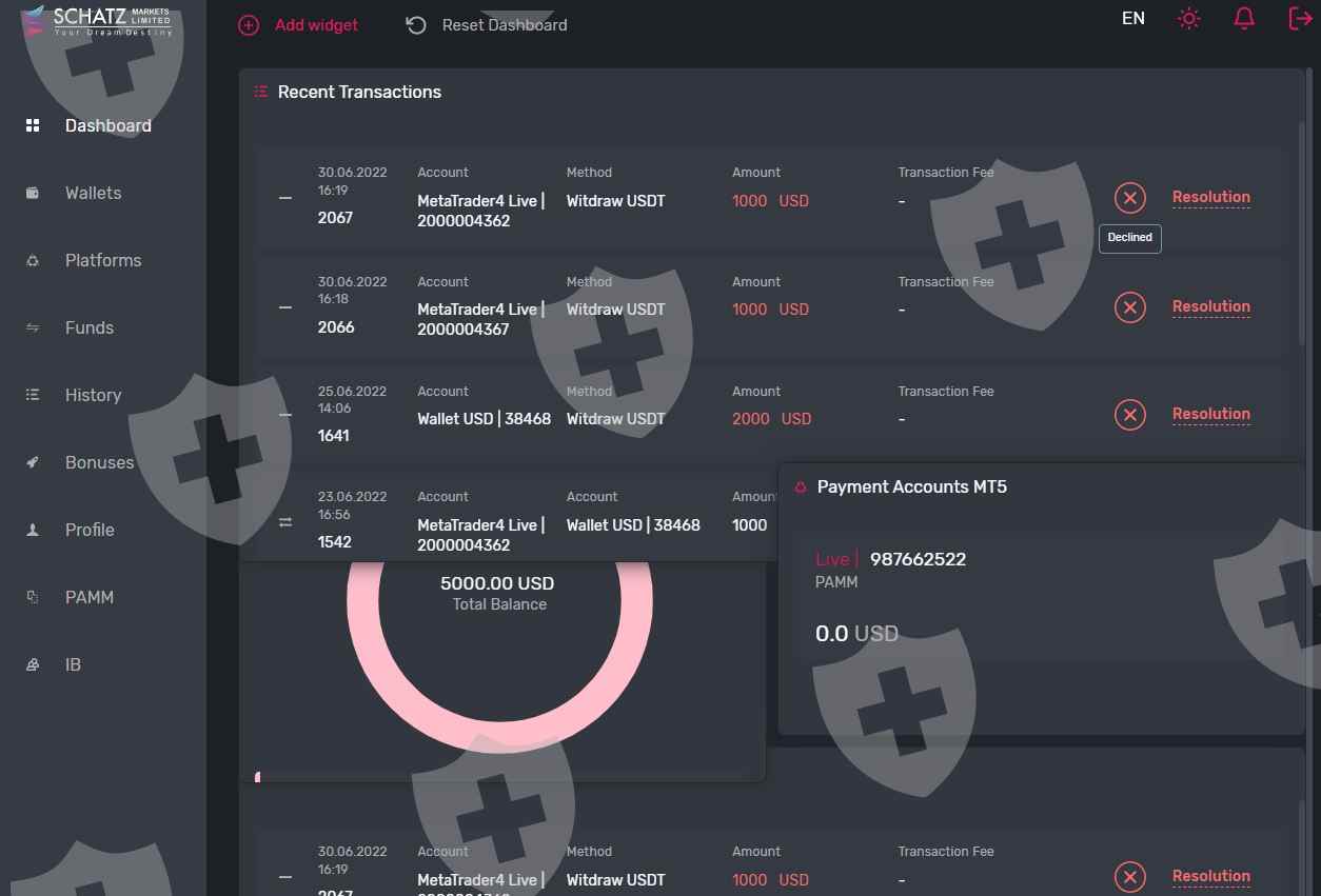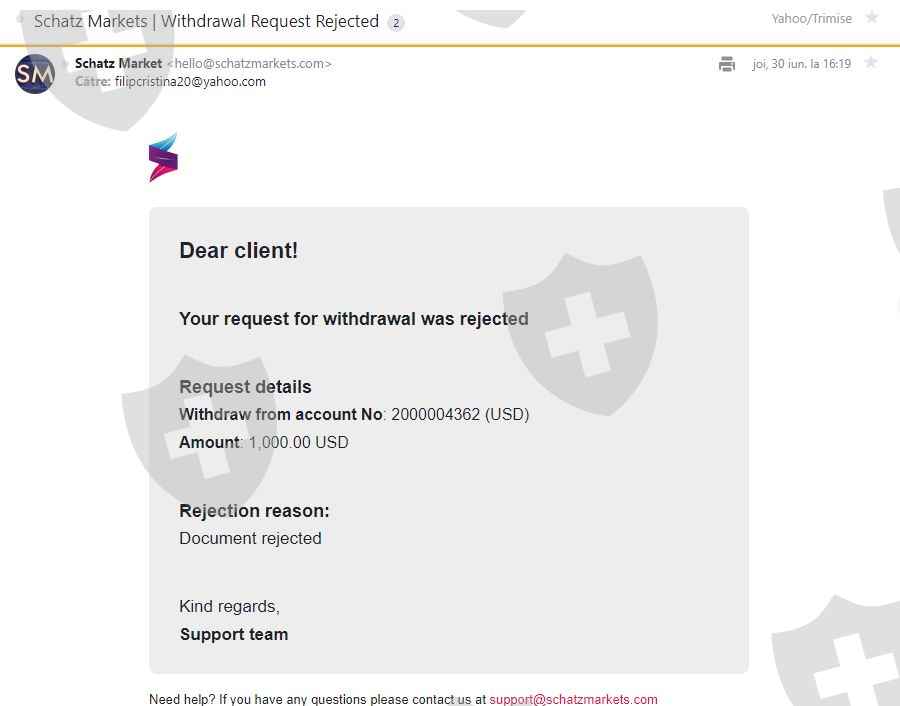I was opening an account with Schatz Markets in May 2022 and traded with them for a few months. When I wanted to withdraw some of my profits and submitted a few withdrawal requests they have been declined all the time, see pictures 1 and 2 with the withdrawal requests.Every time I was making a withdrawal request a rejection email got back but no reason for it, see pic 4 After a while, when I logged into my client portal a message showed that the rate for this pair can not be found when wanted to repeat the withdrawal, see pic 3.I emailed customer service a few times but have no answer back from themI still need to recoup around 12k from them but no one is replying to meAny form of help will be apreciated