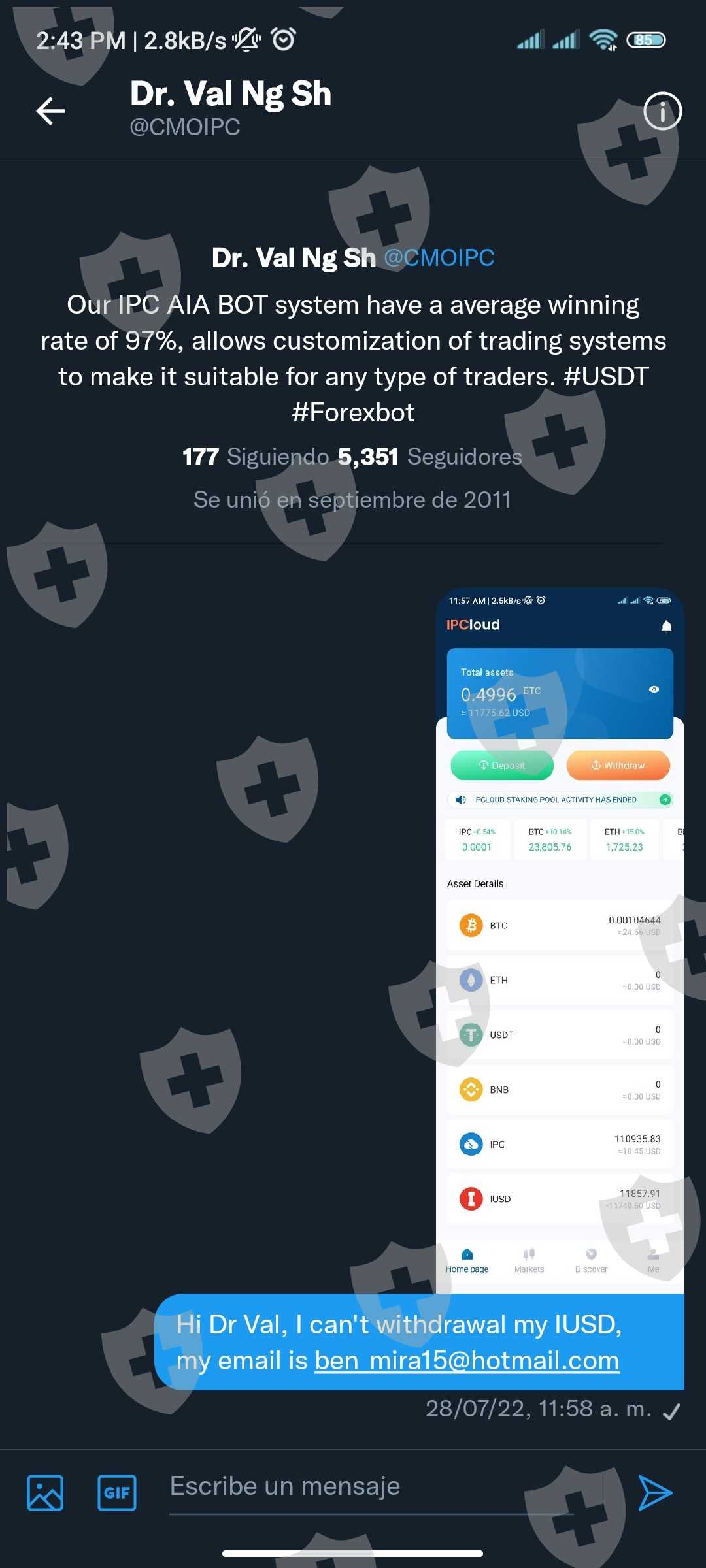 最初这个平台以智能资本的名称开始,这是一家外汇经纪商,通过其机器人提供相当有吸引力的回报并通过 metatrader4 工作,实际上我通过以下链接使用 myfxbook 对其进行了审计 https://www.myfxbook 。 com/portfolio/benjas/9464704 ,通过 member.iprimecapital.com 页面访问,目前无法再访问它,因为这样的页面不再存在,起初它工作得很好,可以毫无问题地删除。随着时间在 4 月过去,他们告诉我们,平台上存在黑客攻击,导致用户信息易受攻击,并且该机器人将在一段时间内不再工作,他们会将我们迁移到仅适用于加密货币的新机器人,通过4 月底,他们告诉我们,我们必须下载一个应用程序,该应用程序是一个钱包,所有来自 metatrader 4 的资金都从那里转移并迁移到一个名为 iusd 的稳定币,迄今为止无法提取或转移任何地方,也没有以任何理由交换(该按钮未在平台上启用),以及据称该公司如何在推特上发表评论,那些有提款问题的人应该联系他,这也是他们没有联系的日期,随着时间的推移,mt4 帐户不再允许我们使用凭据进入,现在它说平台的名称是 Billionext不再是ipc,所以我告诉你这个经验是为了防止所有人进入这两个平台中的任何一个,因为他们保留了人们的钱