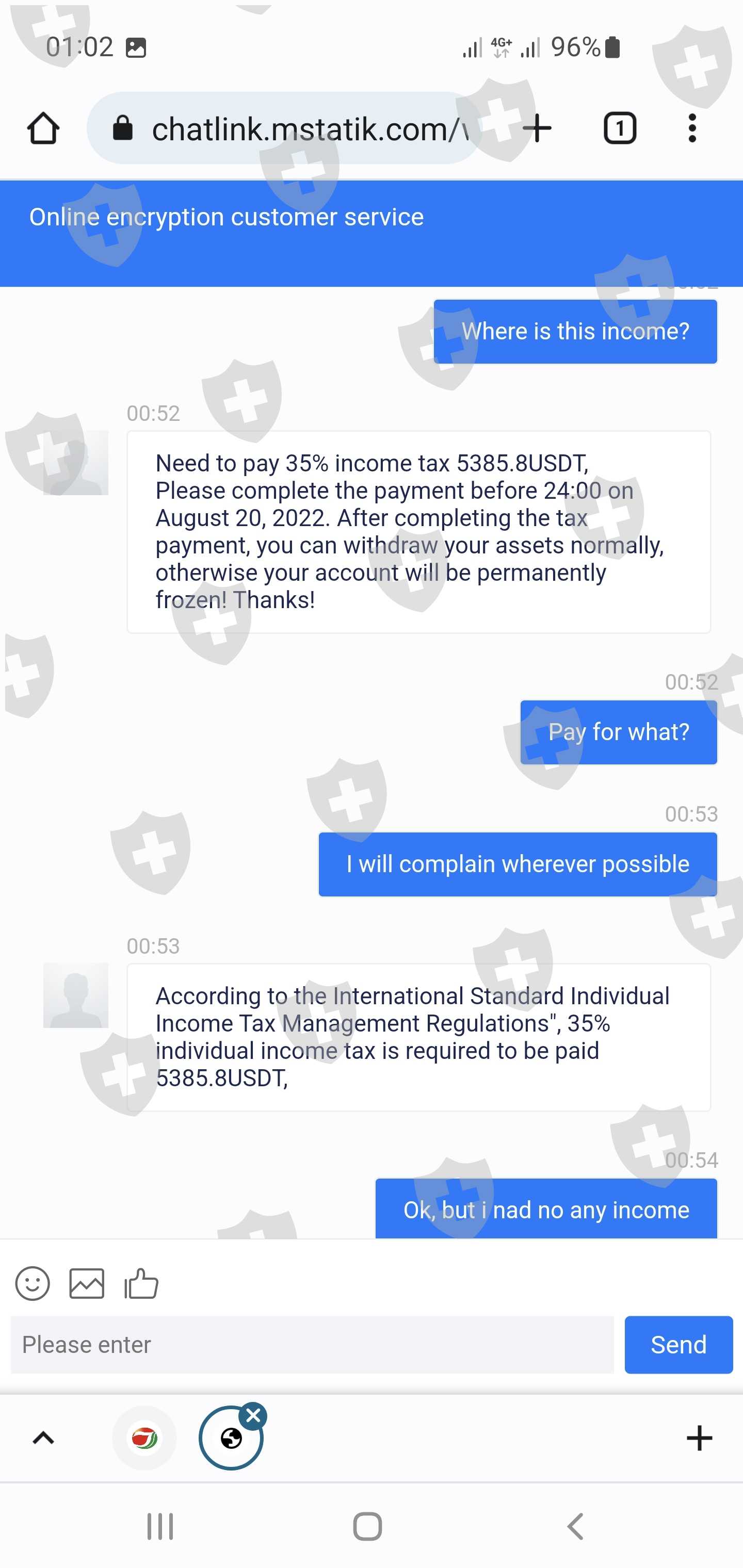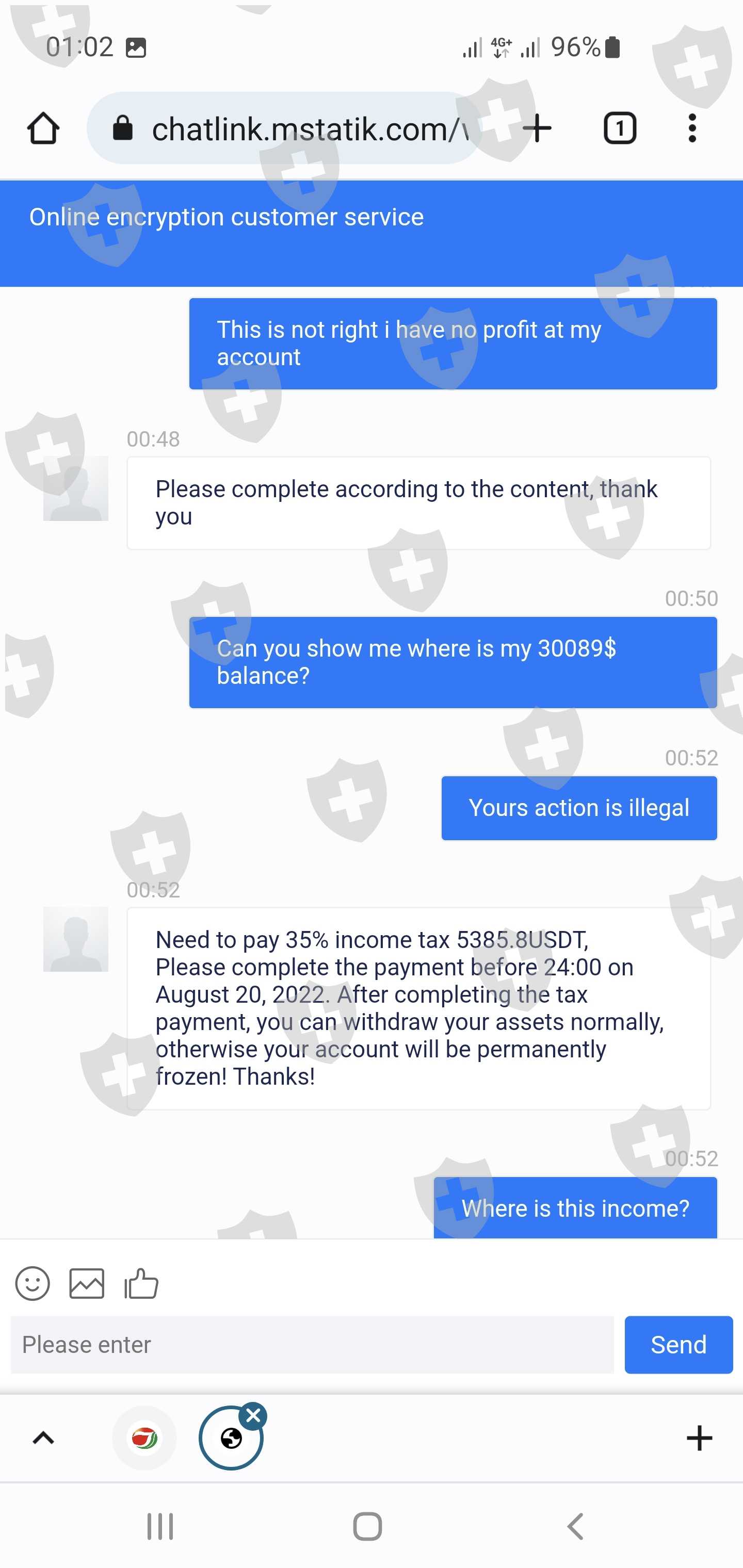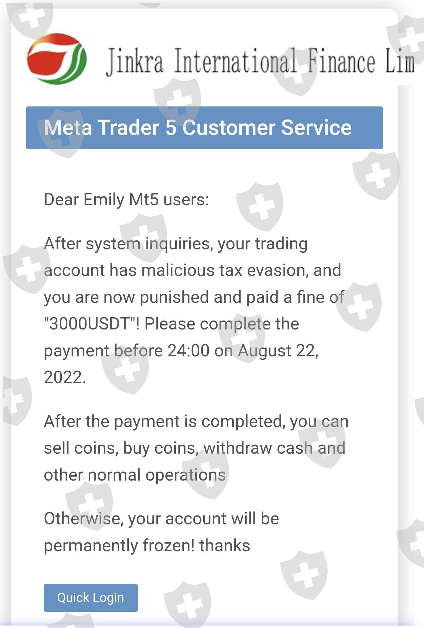 Hello everyone. I want to tell you about the unscrupulous broker Jinkraltd.com. This is a scam platform that does not withdraw funds. After you deposit funds into the platform and try to withdraw a small amount, they withdraw to show that they are working well. But then when you have a small profit, they begin to demand a tax of 35% on profits and do not withdraw funds. I started trading further and my profit became negative -1706$, after that I received a letter from the platform that I was fined 3000usdt and threatened to block my account. Technical support is currently not responding to emails or live chat on the site. Help me get my money back.