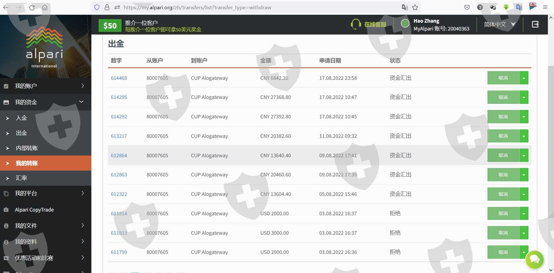 在Alpari平台申請出金共1万USD,分別在8月5號,8月9號,8月11號提交出金,截止到8月21號,沒有收到任何消息,請幫忙協調處理下,謝謝。