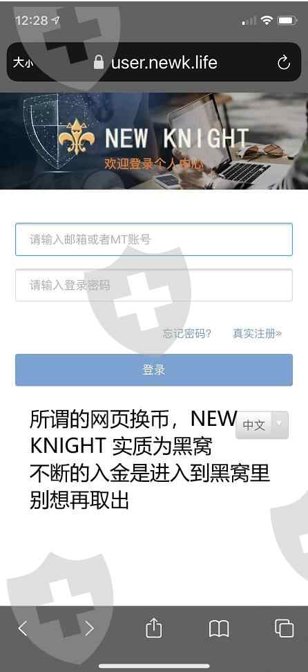 黑交易商NEW KNIGHT GROUP LIMITED 挂在MT5平台进行交易,利用换外汇入金,当申请出金时,严卡,网上唯一联络方式为一个LINE在线客服,该所谓的官网虽注册在澳大利亚,但无任何正规企业税号、营业地址及联系方式,唯一能联系的只有邮箱。根据在MT5捆绑的信息查询,是来自香港的一个网络公司地址,也就是APP可以随时高产量复制。所谓“推荐人”带你的时候根本不给你时间去搜寻资料,并且会淡化隐藏的黑交易商。仅仅告诉你NEW KNIGHT 只是个换币公司,实质所有资金都控制在NEW KNIGHT 账户里,而非MT5里。当申请出金额较大时,都遭拒,并告知要缴纳更多的保证金,才能解冻资金,无疑是个无底洞,黑户。遇到了骗子。当理清之间关系时,为时已晚,对于骗子手法不断更新的同时,要么不做,要做的还是得花时间好好鉴别。