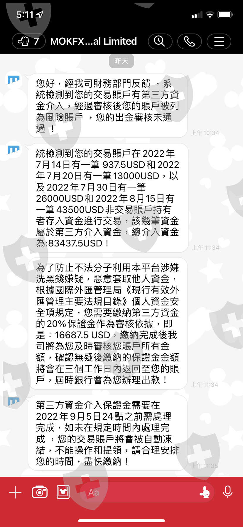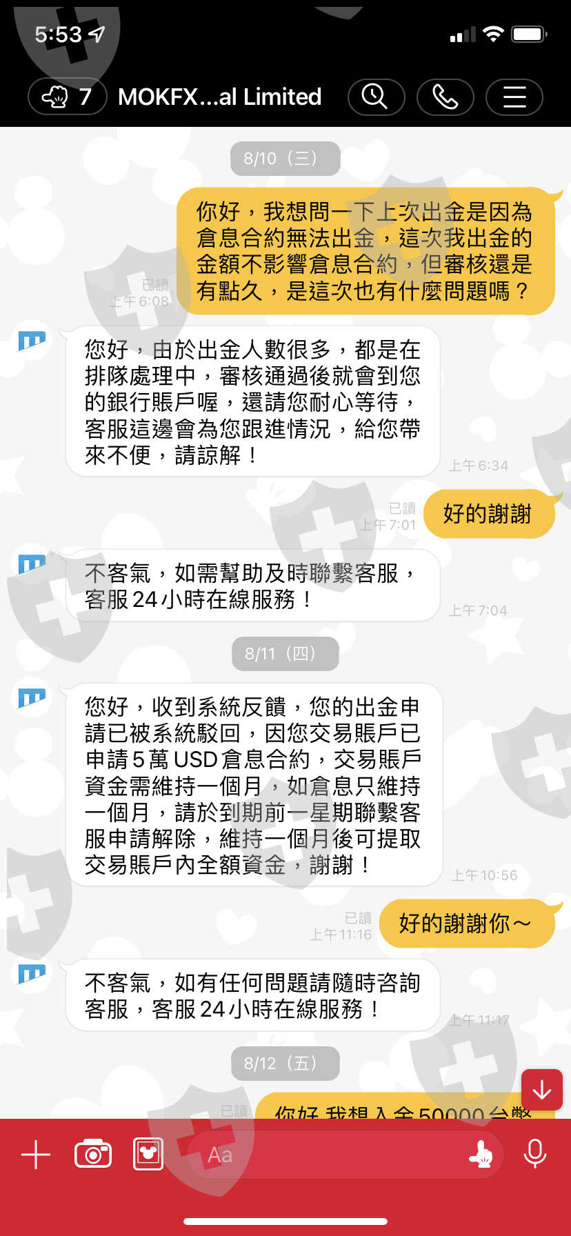 在網路交友結識一位男子,先是慢慢建立信任和感情基礎,再以結婚基金為由,說他的叔叔是這方面的專家穩賺不賠,屢次要求我擴大倉位,說我出一部分,剩下的他幫我補,第一次小額出金時隔天馬上收到,以此換取對平台的信任,後面陸續出金幾千美金都拖好多天再以各種理由不給出金,前幾天要出金的時候突然說我涉嫌洗錢,要求繳20%第三方資金作為審核依據,不然就要凍結我的帳戶無法再出金或操作,我現在只想把我投入的資金拿回來….