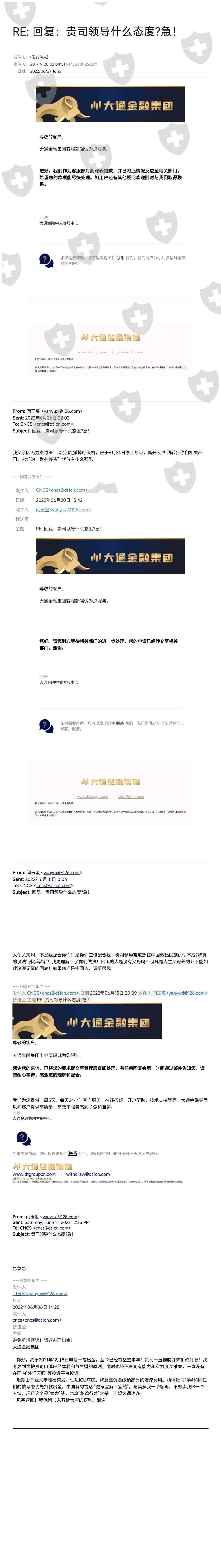 大通金融,交易账号:33553121。自从去年申请出金开始,便百般搪塞刁难不予办理!期间父亲突发脑卒中,抢救,住院,ICU病房急需治疗费!向大通金融说明情况并催促办理出金!但大通金融方面邮件敷衍搪塞!相关领导不顾我父亲死活!自6月3日住进ICU病房,苦撑22天,最后由于支付不起高昂的ICU住院费,断掉呼吸机,无奈放弃了治疗。这期间我与大通沟通过数次。大通相关员工也向他们的外籍领导反映过我的情况!可惜至今了无音讯!大通金融不仅保证不了国内客户资金安全!其管理层更是蔑视我父生命!这件事几经升级成“国仇家恨”!望国人,外汇界的同仁,共同抵制大通金融!共同抵制大通金融CEO这种金融界的败类!