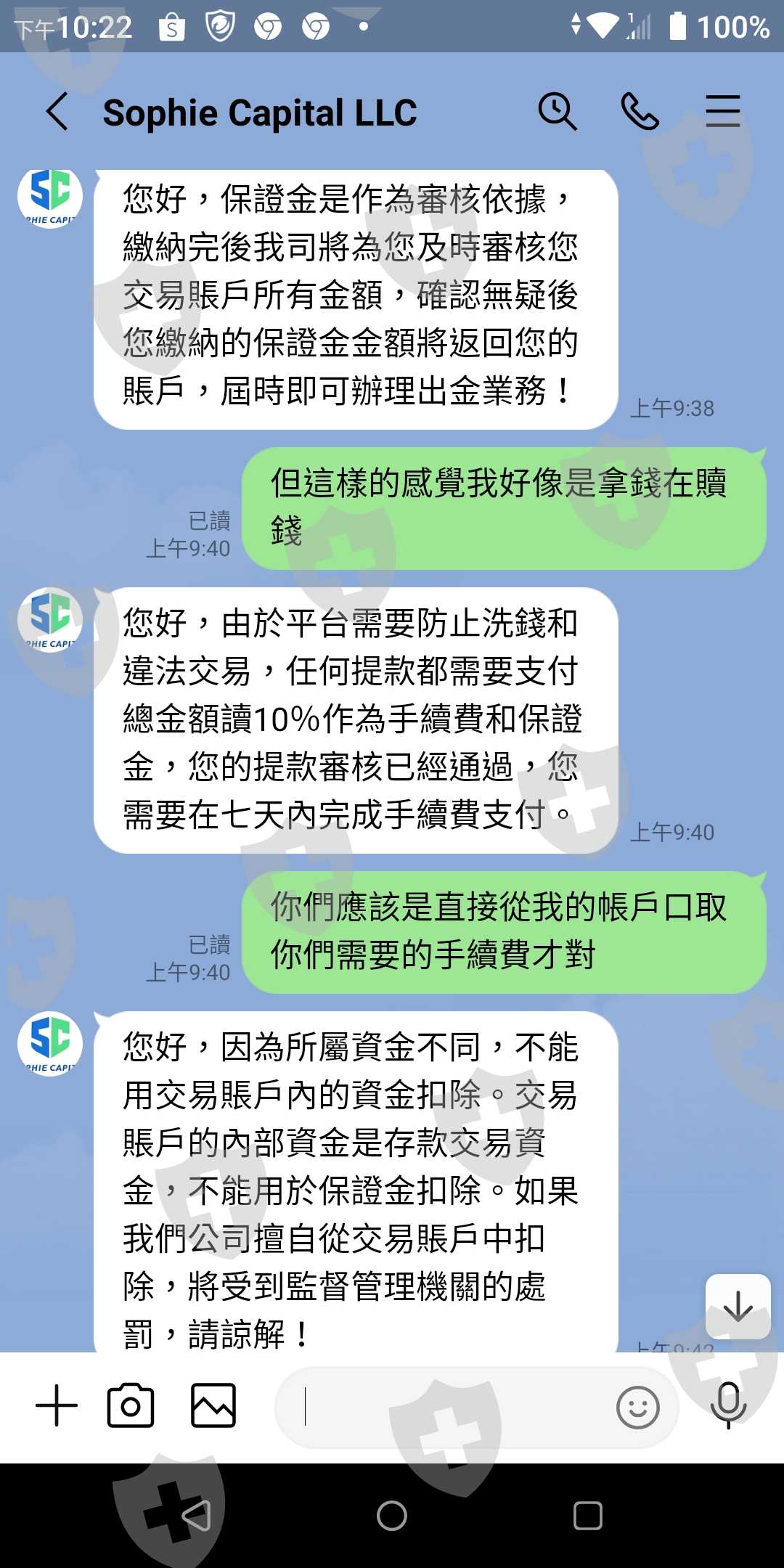 系統由MT4升級至MT5,MT5交易商SOPHIE CAPITAL 由MT4交易商MOKFX 推薦,升級後也註冊完成資金也平行移轉至新交易商SOPHIE CAPITAL ,做了第一次交易後要出金,SOPHIE 客服居然說要先繳費才能出金,是一筆手續費、保證金、金額是帳戶總金額的10%,這一切實在不合理,我已一筆審核通過6萬美金的出金金額,因這不合理的要求讓出金遲遲無法匯款,所有不合理原因如下: