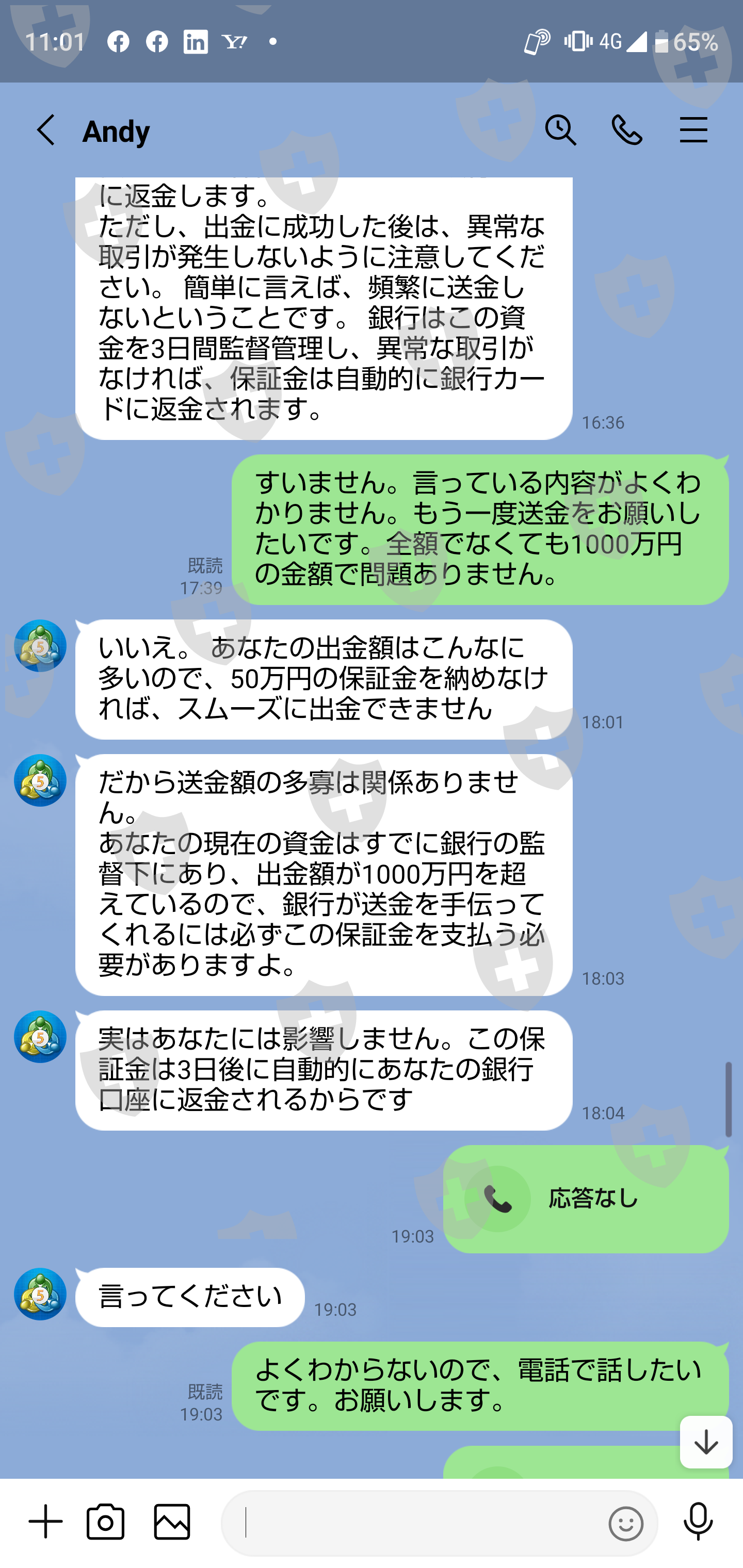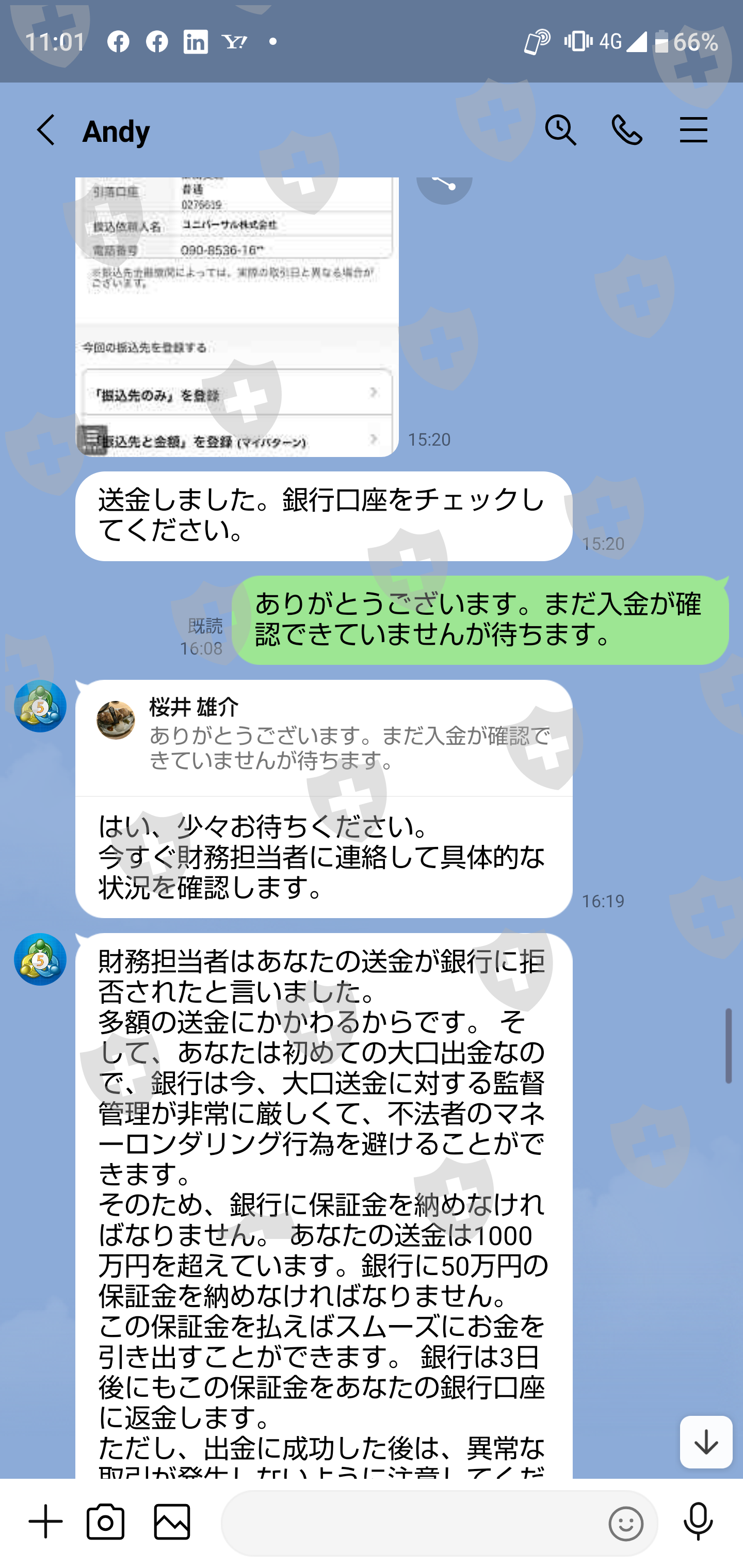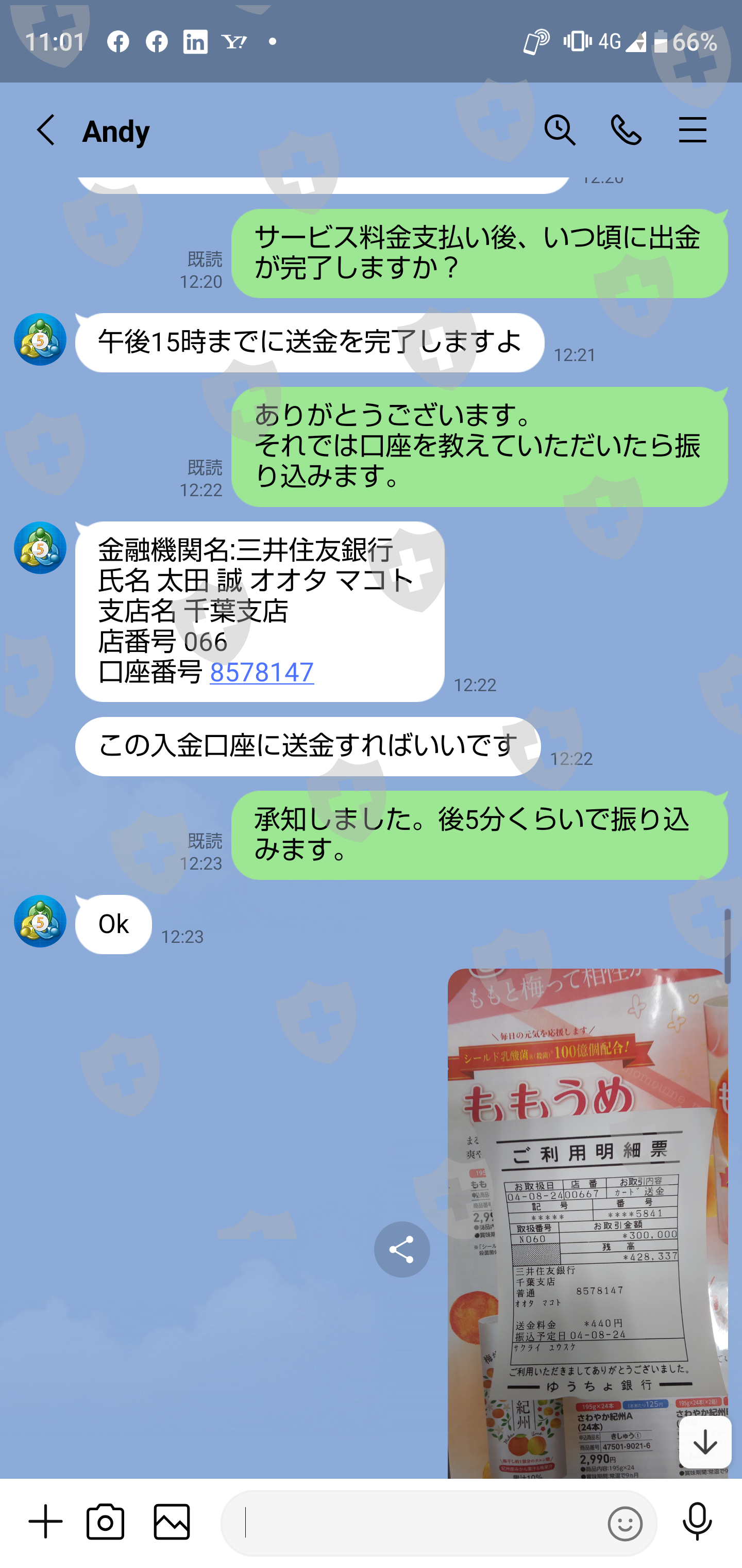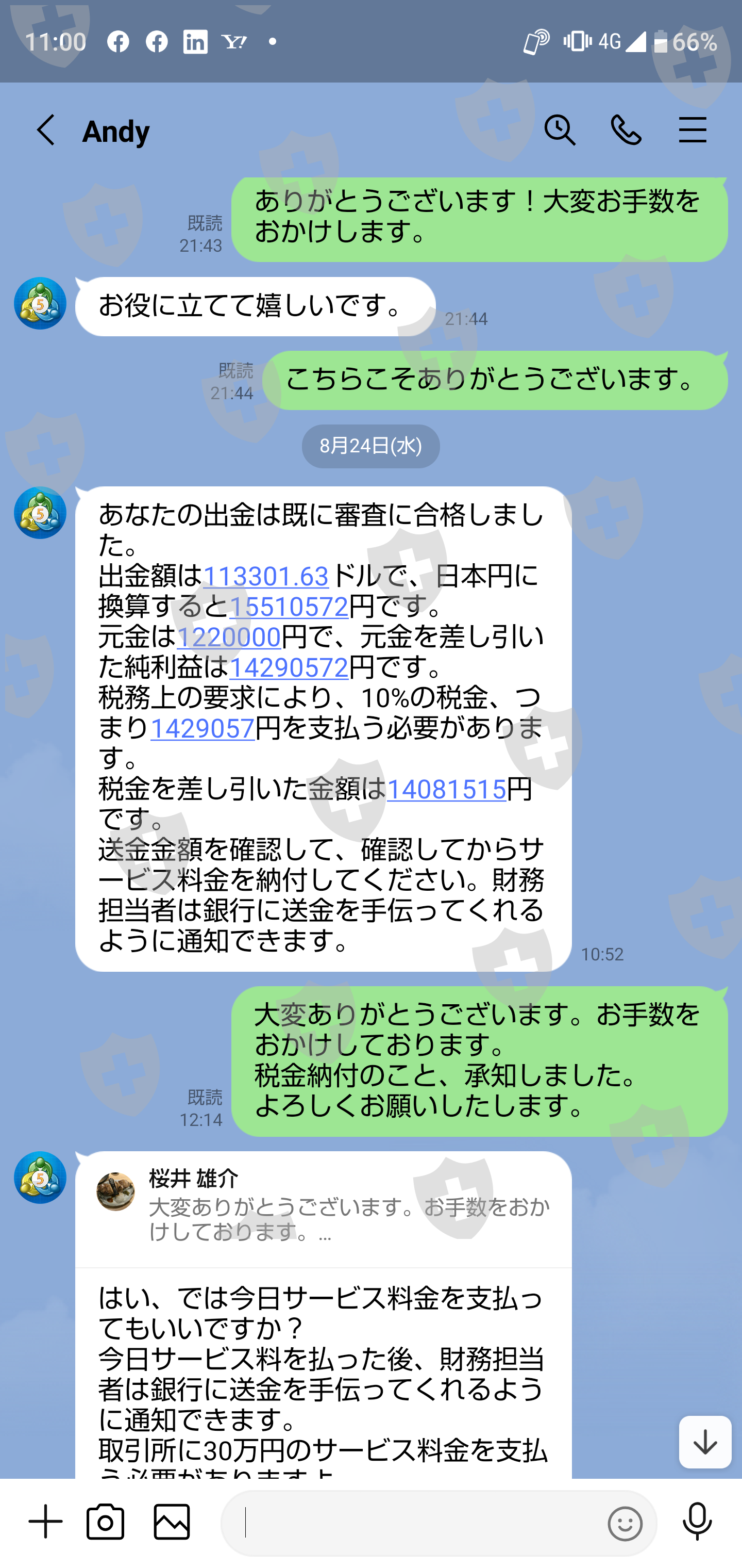 我通过匹配应用程序认识的一位女士的推荐在海外外汇交易所开设了账户,投入资金并开始交易。15,510,572日元),首先,我被联系支付300,000日元的服务费,然后才全额付款提款,所以转账30万日元后,通过了提款审查。当我被告知我这样做时,我松了一口气,但后来被告知提款超过1000万日元将构成洗钱,我必须支付500,000日元作为保证金。果然,我觉得很奇怪,还以为他们在用各种借口不让我取钱。我不能取钱,我很痛苦,所以我把它公之于众。损失金额(账户余额资金):113,301.63 美元(转入日本账户的总金额:700,000 日元)