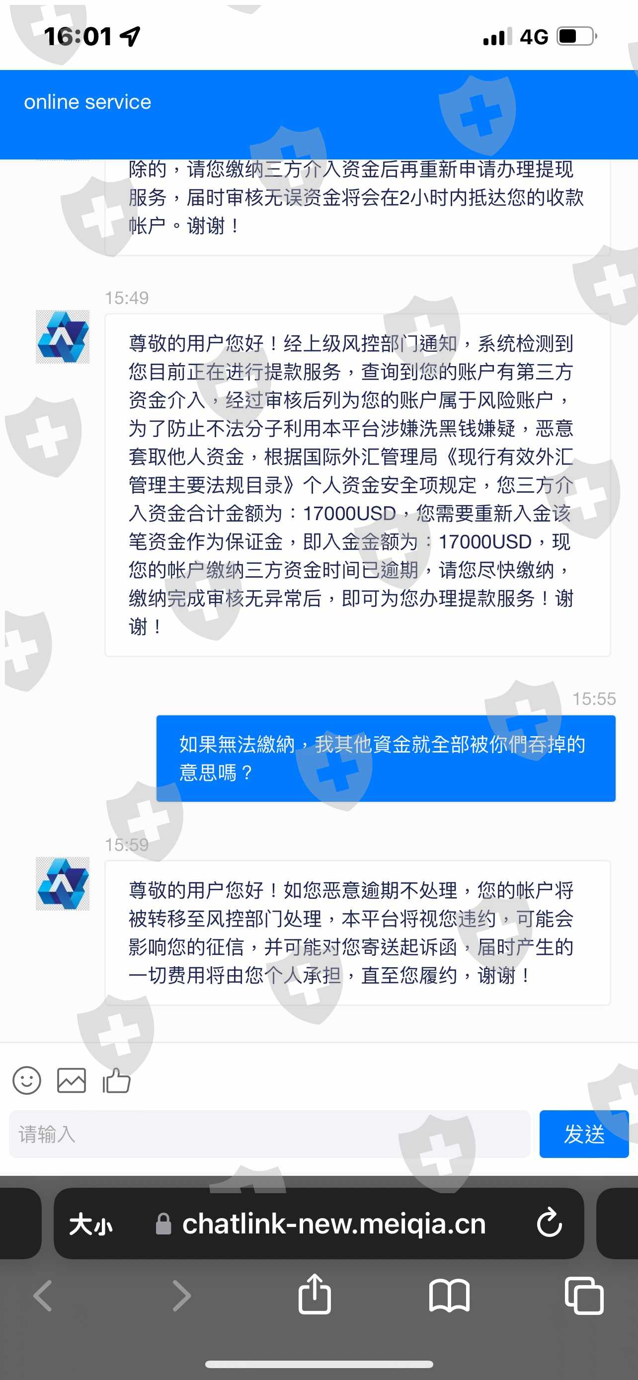 於是我參加了活動,中間也做了幾次有獲利的行情,最後活動期間還因為無法在時間内達成而申請延期,平台說需要繳10,000美金的保證金才能繼續完成活動,且這筆保證金不能算在入金的活動裡面,最後我差了7000美金,網友幫忙補上最後也達成活動。隔天回饋也入金了,中間還做了兩次行情的交易,沒想到後續就發生申請出金一直出現待審核,隔天中午直接出現審核末通過。詢問客服為何提領沒成功?說我的帳戶有第三方資金介入,屬於風險帳戶,有洗錢嫌疑,要我再補入17,000美元作為保證金後才能可以申請出金。