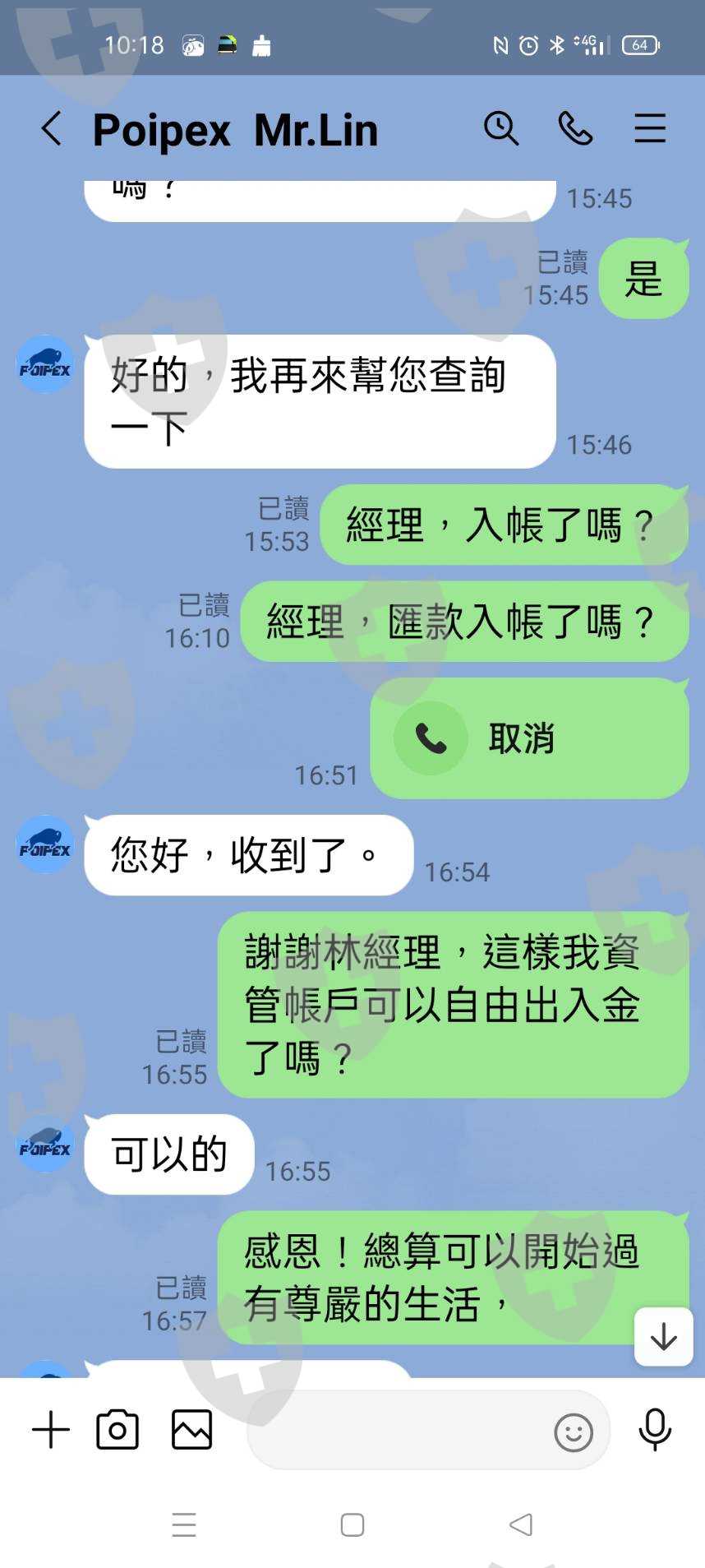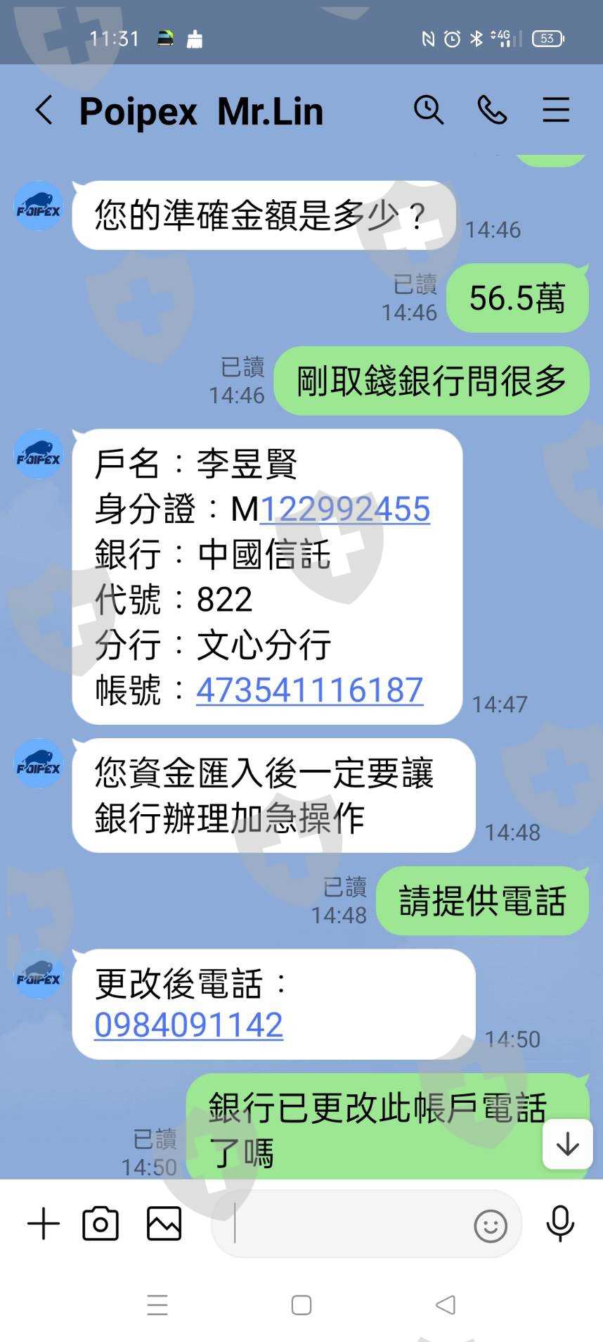 Poipex 8/12日回覆:排隊出金中了,請耐心等待,就沒下文了,8/26日詐騙團夥陳家榆和劉德盛兩位主謀,消失60天了,突然出現,說幫我處理出金問題,陳家榆說要繳高額保證金,才能入金,劉德盛要我信他,聽他指示,再一次繳交我在6/21日匯出的56.5萬金額,我出金被凍結是因為這筆金額入帳被Poipex 資管帳戶裡Mr. Lin給偷了,沒入帳,此人是Poipex 專管厚德載物工作室資金的, 說此筆金額被偷了,Poipex 總部不會承擔,我要入金必需重覆匯出56.5萬後,48小時內就能入帳了,我問怎麽繳總部,匯國外還是國內,他說匯國內,可以,但必需當面寫保證書後我在匯款,他說願意幫我是好意,他忙沒時間見面,要嗎聽他指示辦理匯款,我堅持見面保證再匯款,劉德盛就是不見面,