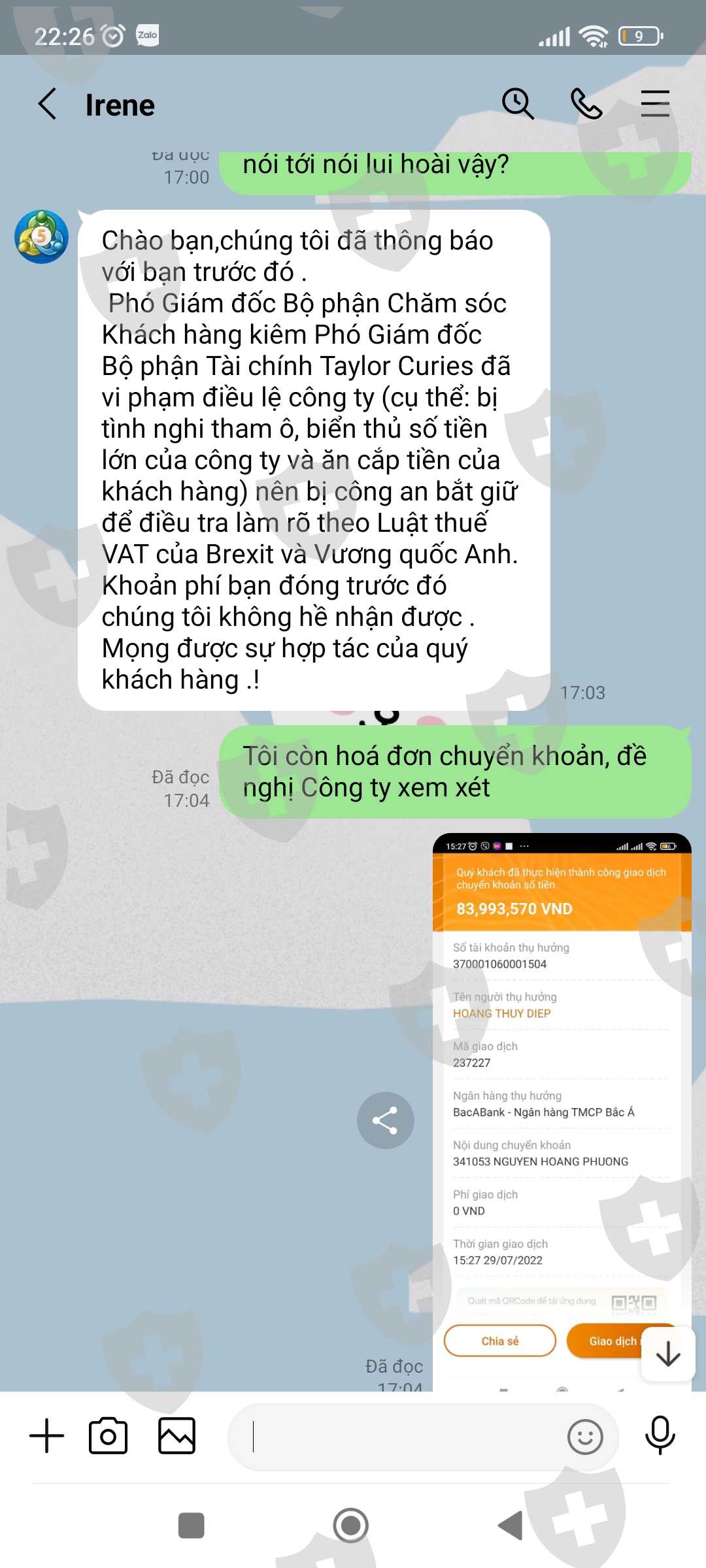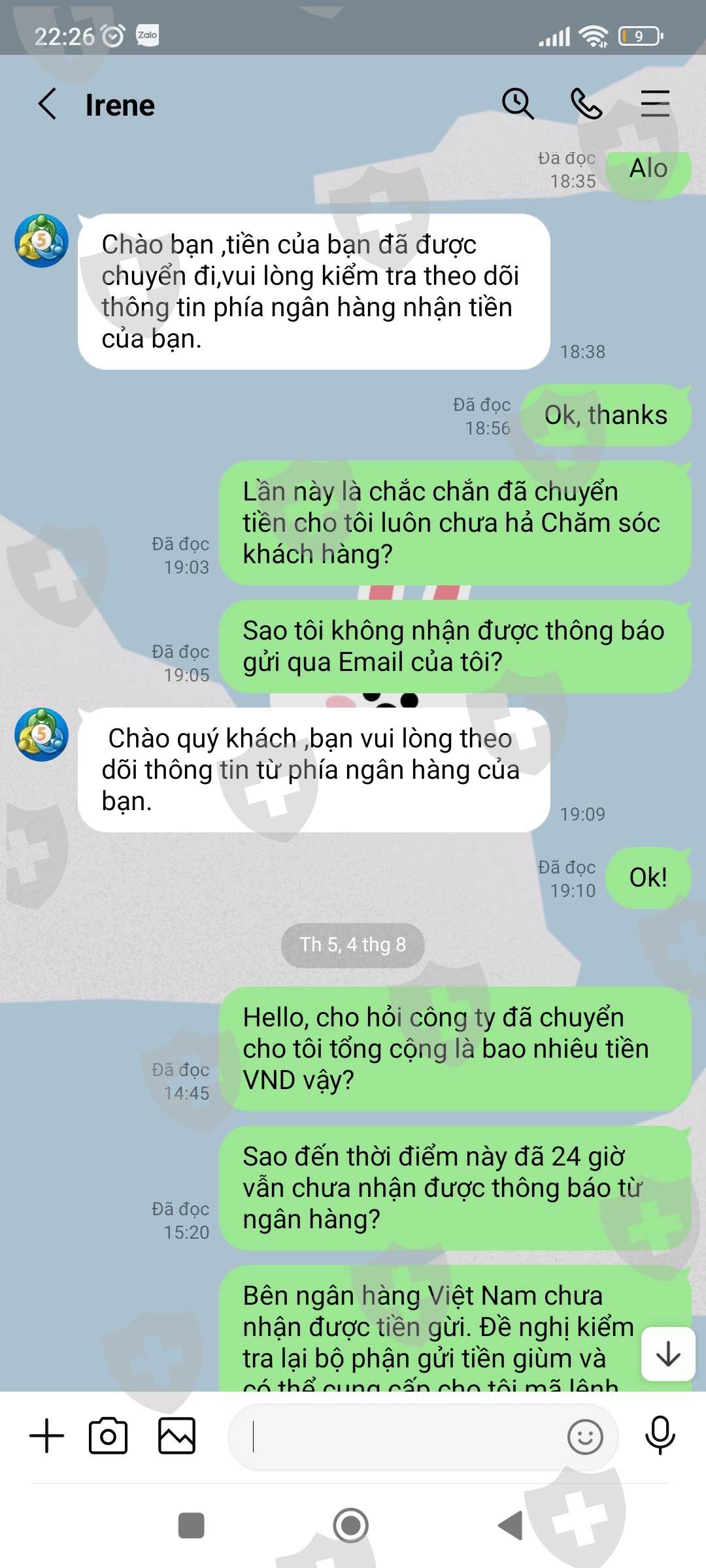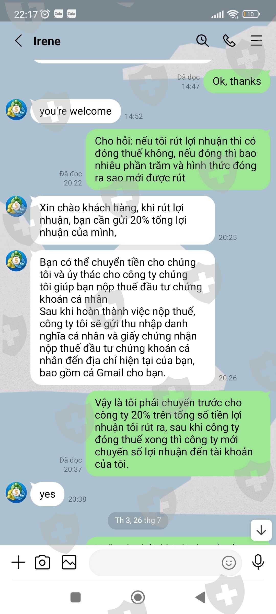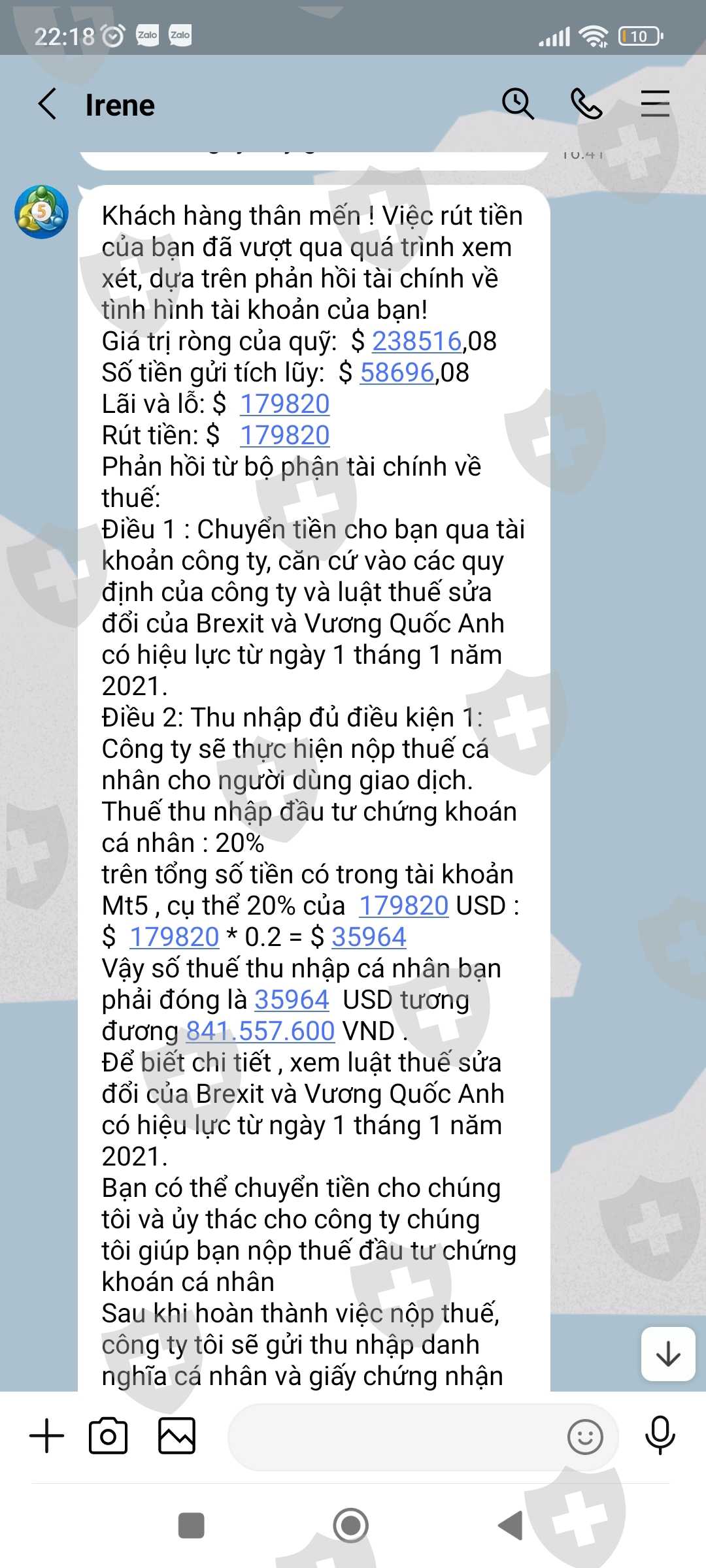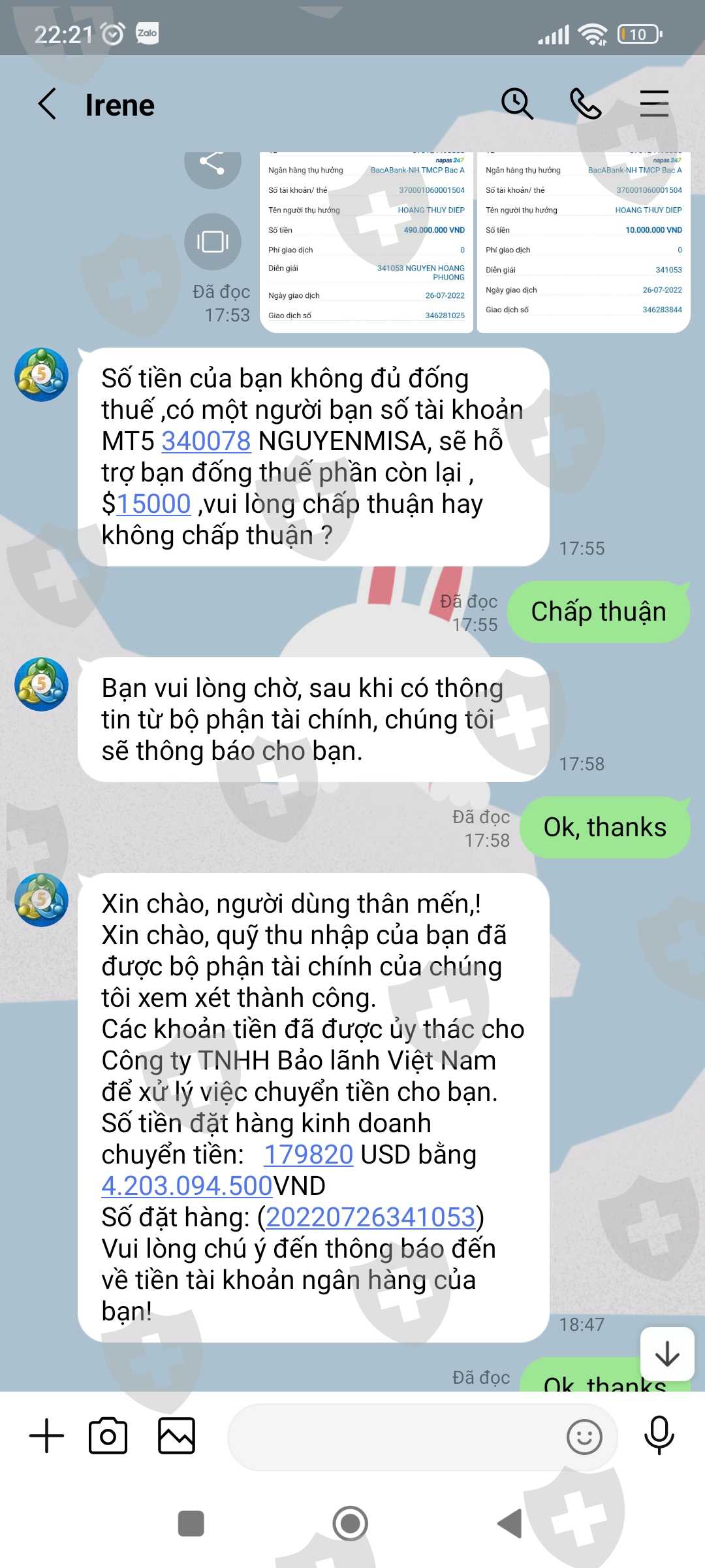 Tài khoản MT5 của tôi là 341053, Email: nguyenhoangphuongkl@gmail.com. Vừa qua tôi có đề nghị CSKH hướng dẫn tôi rút lợi nhuận với số tiền 179.820$, sau khi làm thủ tục CSKH hướng dẫn tôi rút tiền và đã thông báo tôi chờ nhận tiền nhưng đến giờ vẫn chưa được, CSKH đưa ra rất nhiều lý do nhưng không tư vấn cho tôi trước. Lần thứ nhất khi không thấy tiền về tài khoản, tôi hỏi CSKH thì nhận được thông báo tôi chưa đóng thuế 10% trên tổng số tiền tôi rút. Lần thứ 2: Sau khi tôi đã hoàn thành đóng thuế thì CSKH thông báo bạn đã được duyệt và chờ nhận tiền, chờ hoài không thấy tiền về tôi hỏi CSKH thì mới thông báo tài khoản bạn rút quá lớn không thể chuyển và đã bị đóng băng. Lần 3: sau khi tôi đóng phí mở băng và đóng phí chuyển nhiều lần vào tài khoản thì CSKH thông báo tôi chờ nhận tiền, đến khi tôi không nhận được tiền thì tiếp tục thông báo tiền tôi đóng thuế trước đó chưa thực hiện đóng thuế do Phó Giám đốc tình nghi bị tham ô tài sản khách hàng nên phải đóng phí ủy thác cho công ty đóng thuế giùm. Lần thứ 4: sau khi tôi đóng phí ủy thác thì CSKH thông báo chờ nhận tiền, đến khi tôi không nhận được tiền thì CSKH thông báo là do số tiền quá lớn không thể vận chuyển buộc tôi phải đóng phí lần nữa, vì phí tôi đóng trước đây công ty chưa hề nhận được, lý do Phó giám đốc bị bắt chưa chuyển cho sàn. Cho đến giờ vẫn chưa giải quyết cho tôi rút được tiền