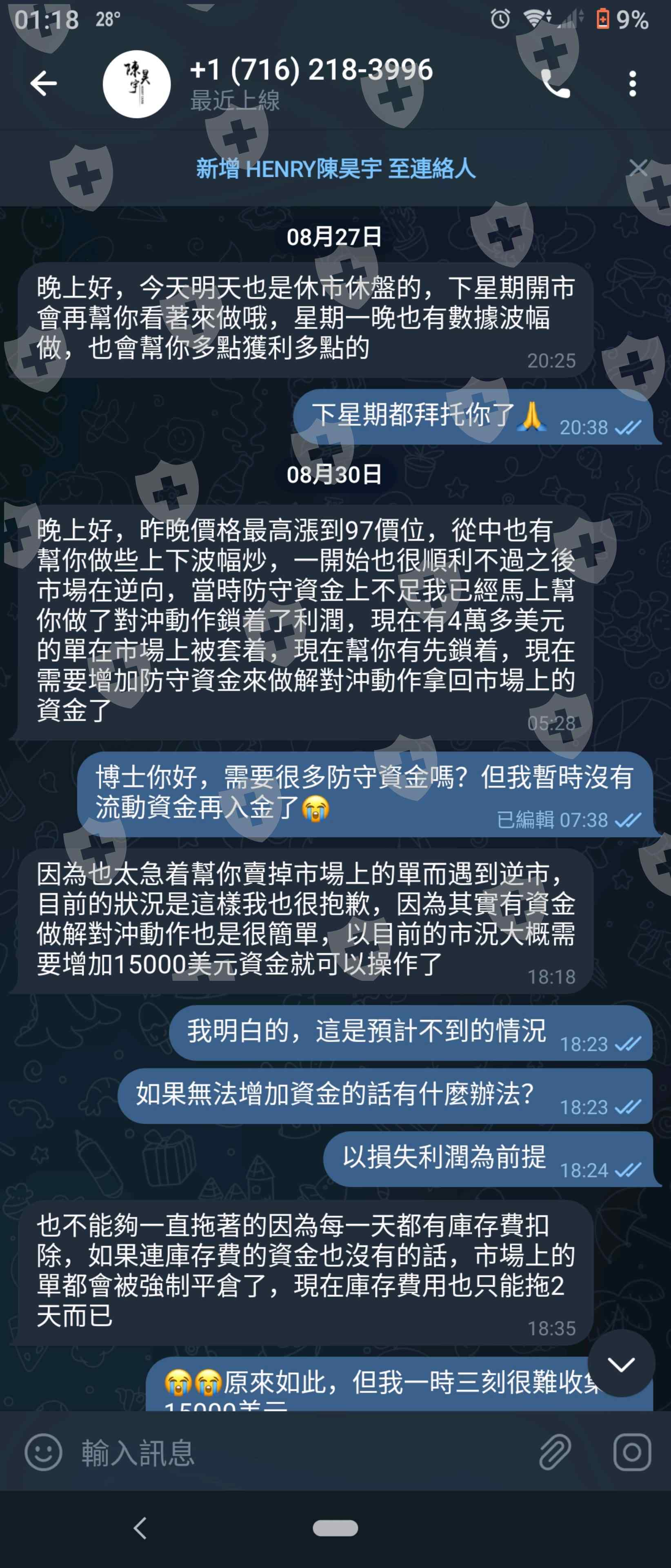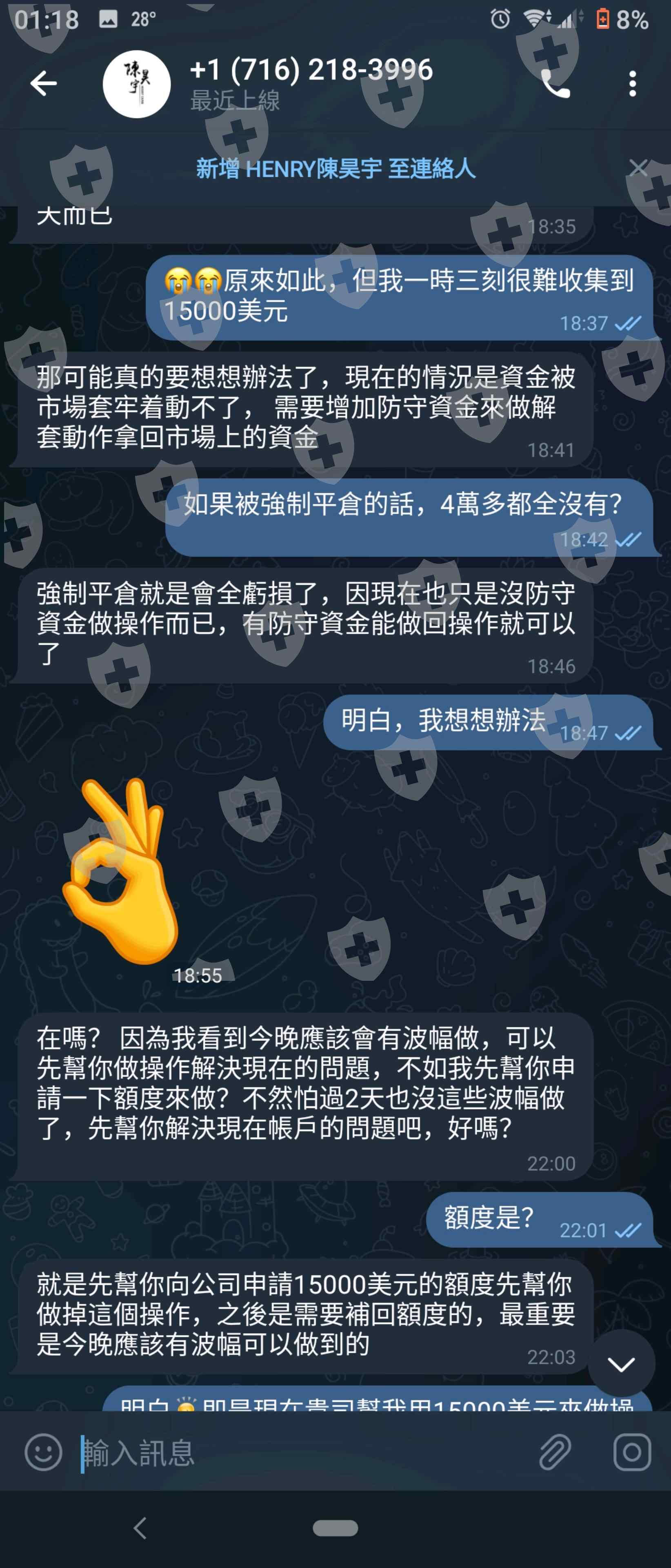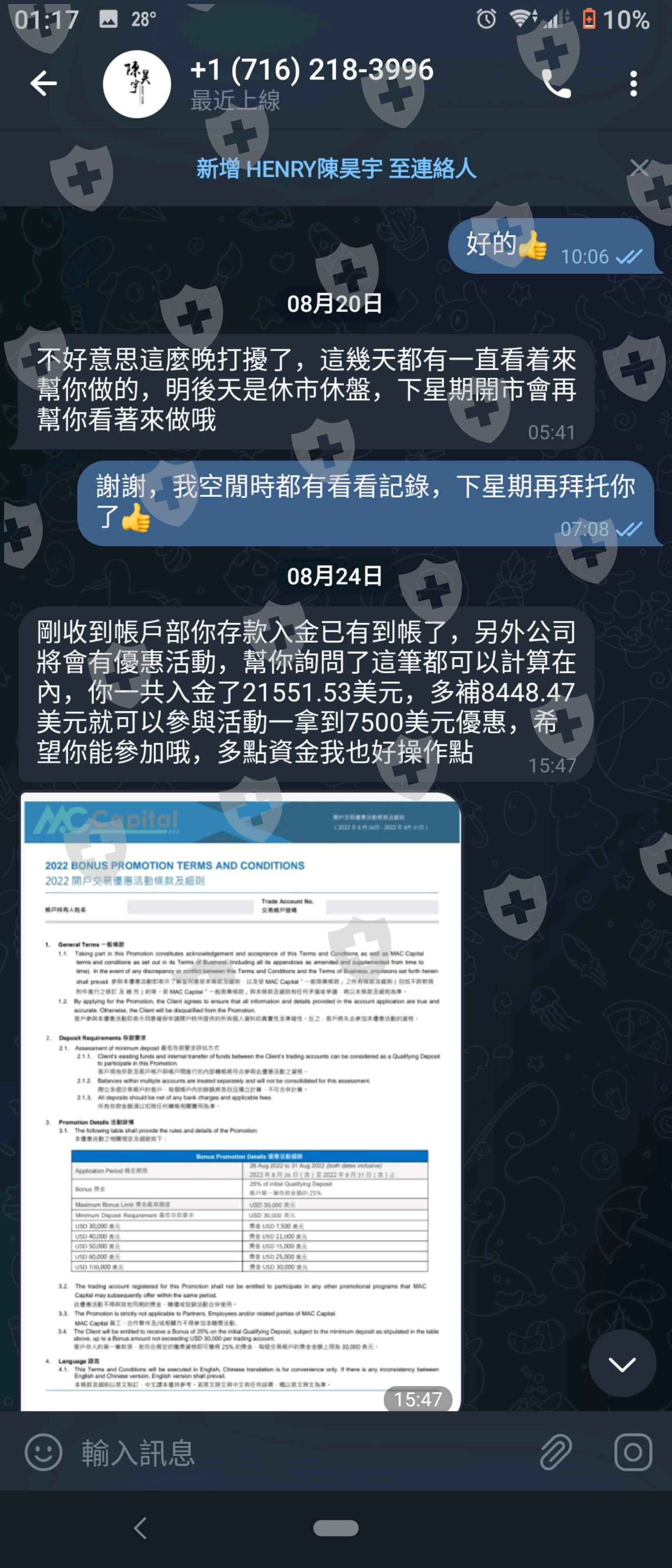 在交友app認識一位香港女性(852 46607673),再由她推介用MAC Capital去買賣原油,之後接觸了一位 "陳昊宇"投資師,(https://www.capital-mac.com/),網站中有顯示得到了ASIC監管號328214,所以就信任他。當初左他推薦的網頁上下載了MT4 1350版本,輸入了交易商"MT4-server",就登記完成。當初入了小量金額而的確有利潤賺了,之後就說有活動舉行,入滿$30000美金金額就會有獎勵金額,因本人不夠金額而交友 app的女子就幫我存入部份金額來完成獎勵。但到幾天後投資師陳先生就話因市場突發,做了對沖動作鎖了我戶口所有金額,要交上"防守資金"來作解對沖動作,之後我直接說無錢,他就說先幫我向公司申請額度來解對沖,要我限時存入$15000美金才能出金。交友app女子就不斷誘騙我去借錢,最後被揭發是假人假相。之後我用外匯天眼才發現原來是假牌公司和假的MT4 apps,用真的MT4 app 1353版本是找不到這間交易商,全部都是誘騙!