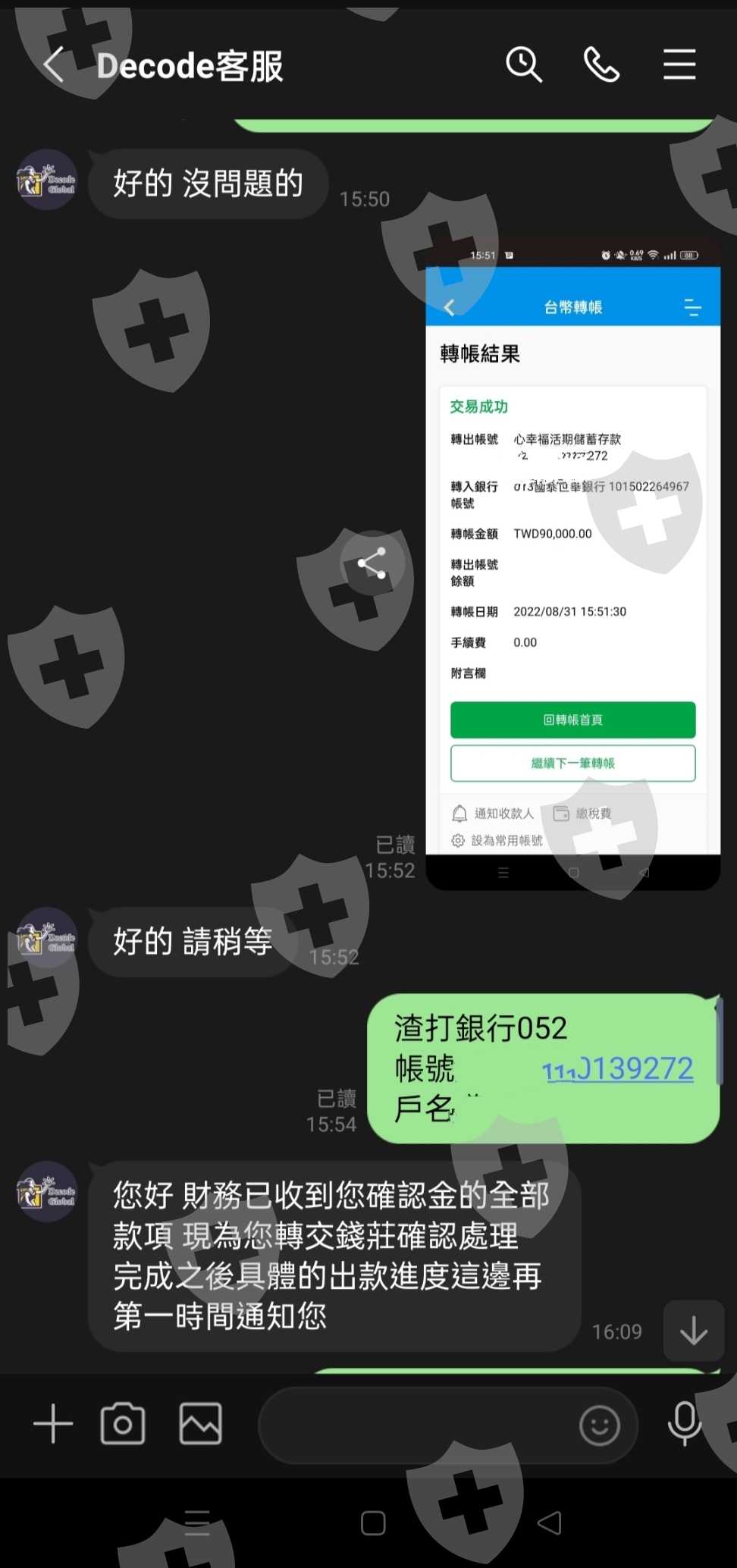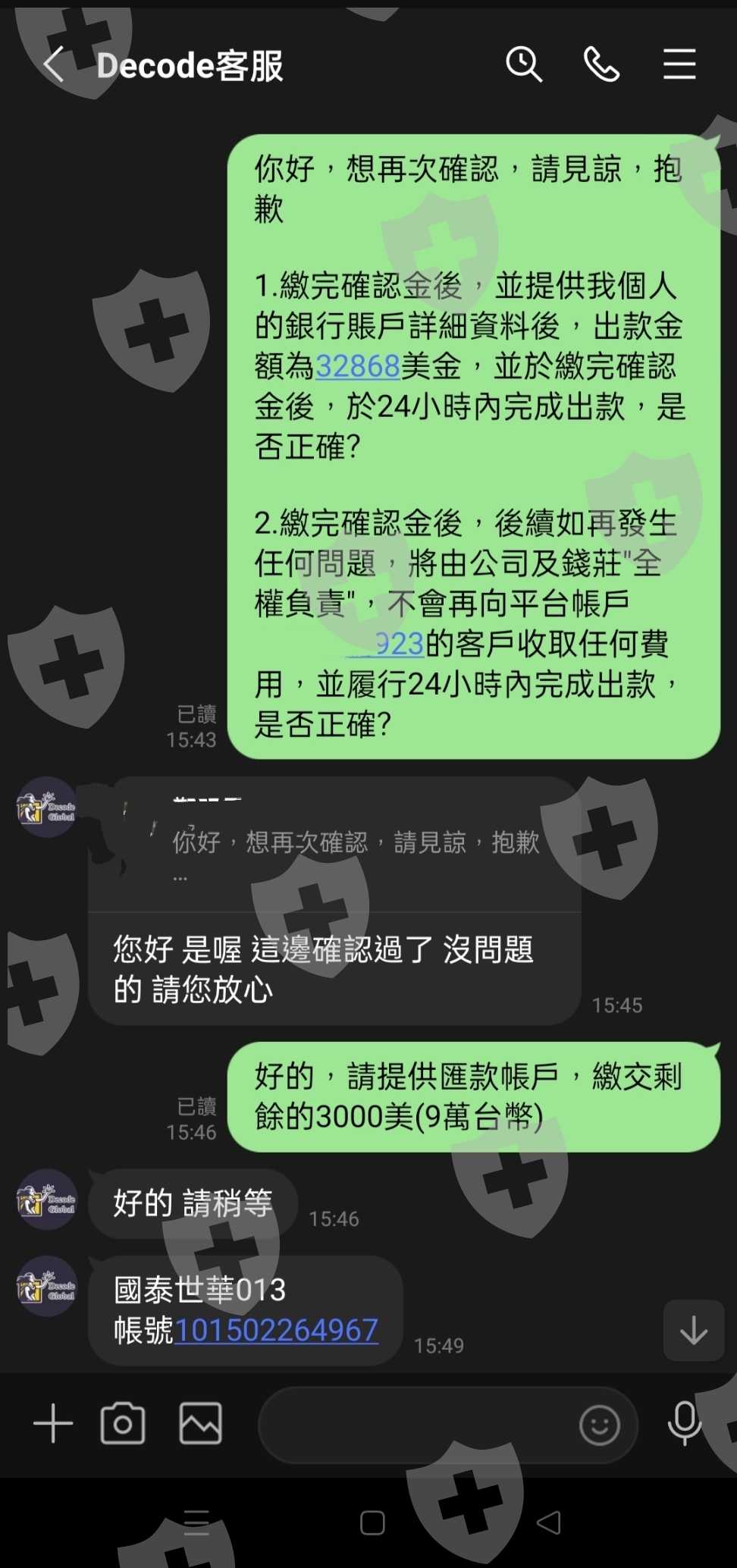 申請3萬2千美金出金,且再三確認不會再有任何異常,但最後又要解繳25萬台幣的擔保金,該客服自稱是Decode Global的台港服務平臺,來求證並退出。