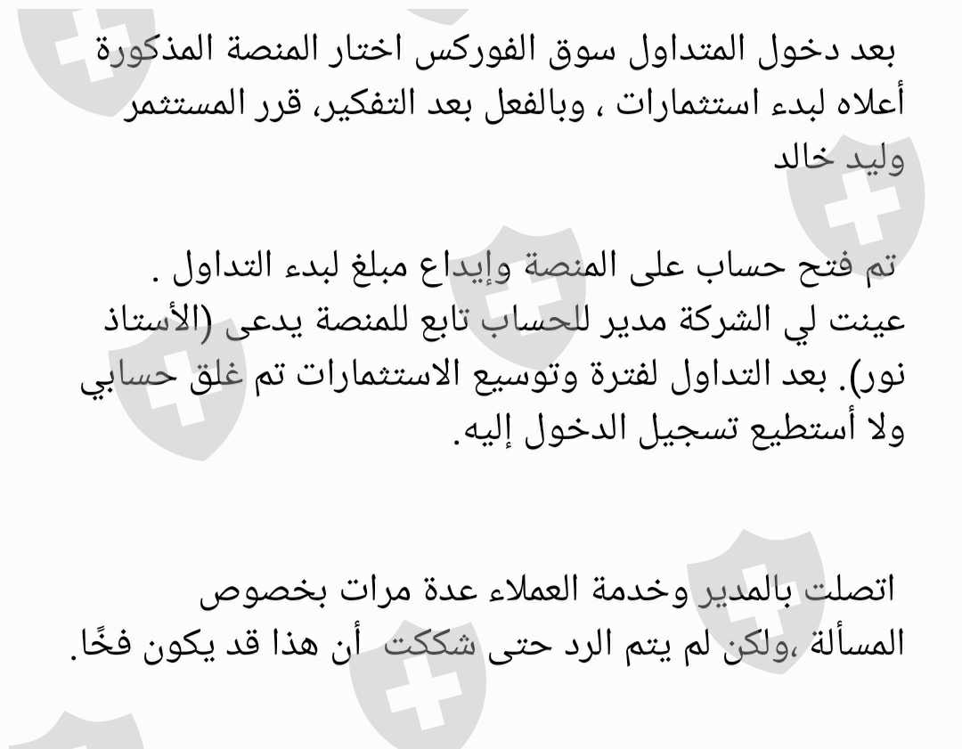 تم فتح حساب على المنصة وايداع مبلغ ثم قامو بتعيين مدير حساب لي يدعى أستاذ نور، بعد الاستثمار لفترة تم غلق حسابي ولا استطيع الدخول إليه. اتصلت بالمدير وخدمة العملاء عدة مرات لكن لم يتم الرد حتى شككت أنه فخ، التفاصيل في الصور المرفقة