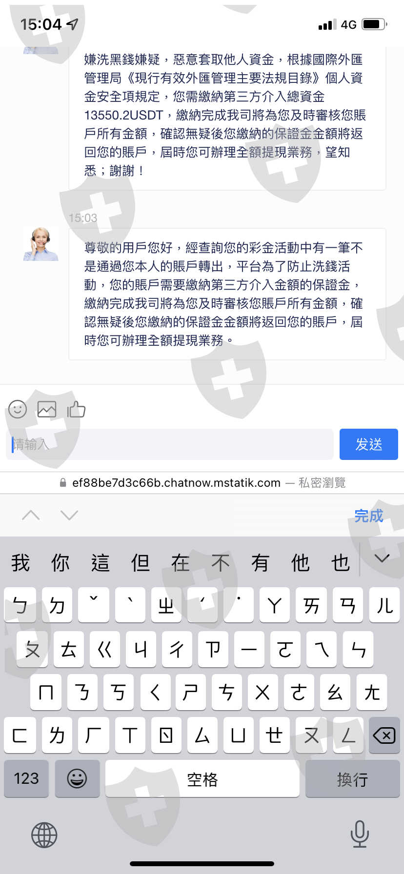 完成彩金任務無法出金,由於風控部門檢測到目前您賬戶有第三方資金介入,其中一筆為13550.2USDT,為了防止不法分子利用本平台涉嫌洗黑錢嫌疑,惡意套取他人資金,根據國際外匯管理局《現行有效外匯管理主要法規目錄》個人資金安全項規定,您需繳納第三方介入總資金13550.2USDT