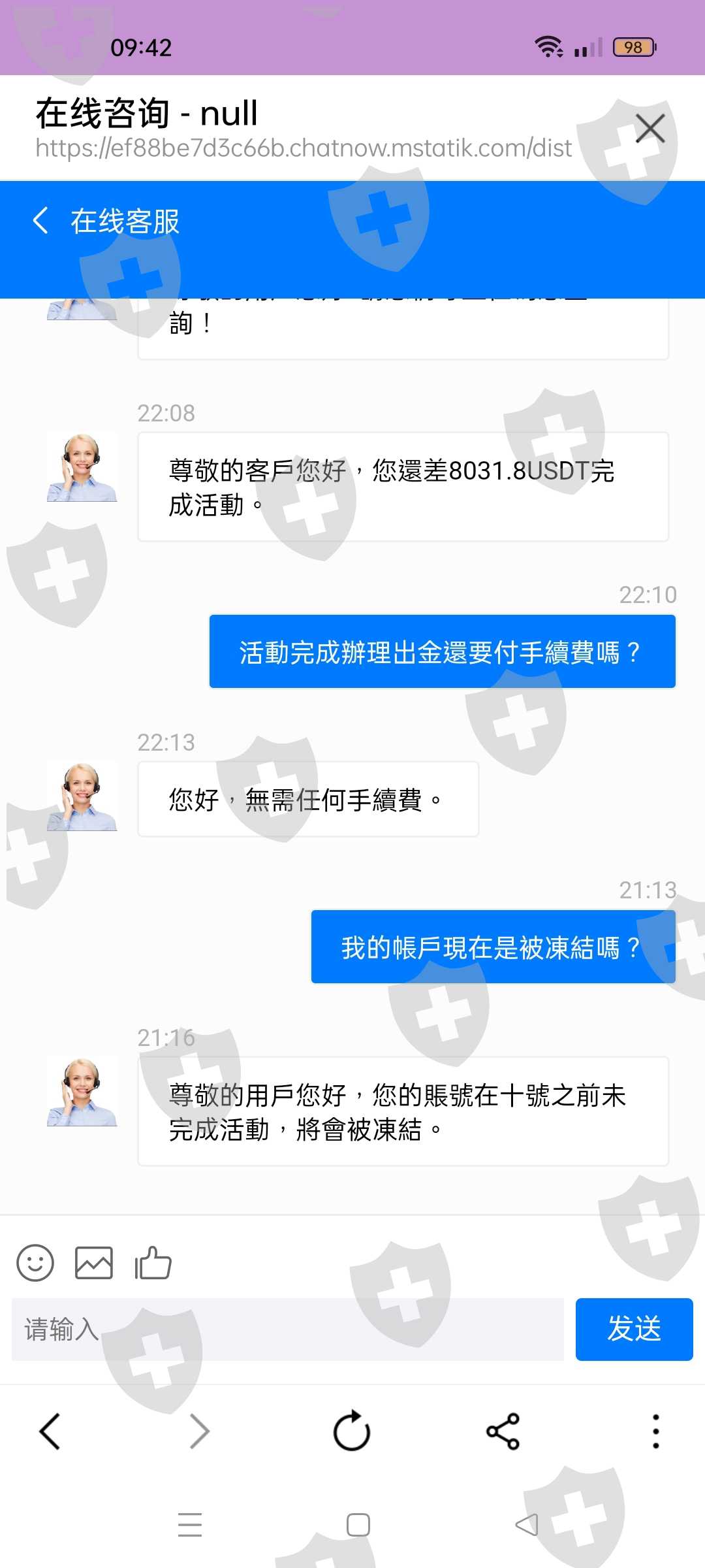 從要帶我賺錢,一開始有小賺,都是他教我怎么操作,之後就叫我參加盈利寶的活動,要入金58000USDT,他還先幫我入43000的USDT,剩下的不夠客服說沒完成不能出金,還會凍結帳戶