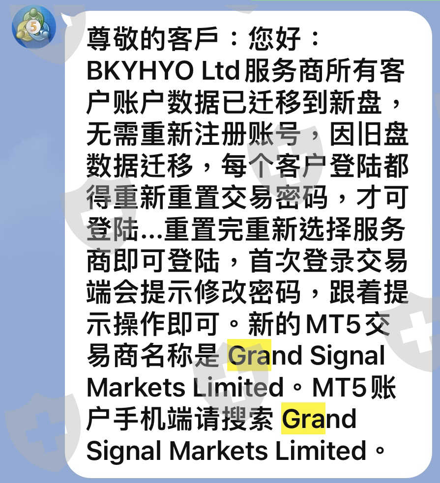 網友指導於BKYHYO註冊,此平台無預警遷移平台至GSM( Grand Signal Markets Limited),是個不受監管的平台,確認客服GSM將升級主標,再度入金, 後續驚覺不妥想要出金,客服卻告知有他人入金,屬違規操作,需要支付20%費用才能恢復帳號出金. 目前MT5帳號已經被停用, 遷移的新平台GSM無EMC管道,因此尋求幫助.