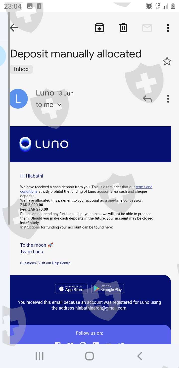 i try to trades with someone call her self Mary Thato and the other one is Andries Antonopoulos i deposit R5000 in my luno app she send to her adress on online trading after she told me to upgrade with R25500 i deposited than after she told me to deposit 10% for company before i received my profits i deposited after few days she told me i must pay for IMF CODE i refuse to pay now is busy massage me about payment of IMF Code all the money i deposited to her is R86500 and i need my money back i need help to get my money back im broke right now because of them