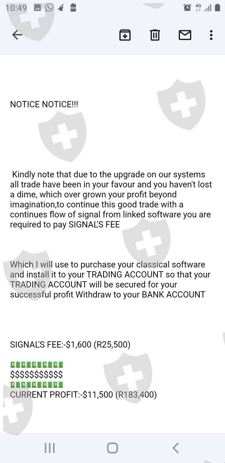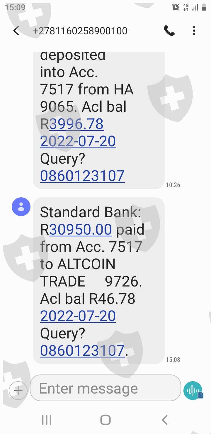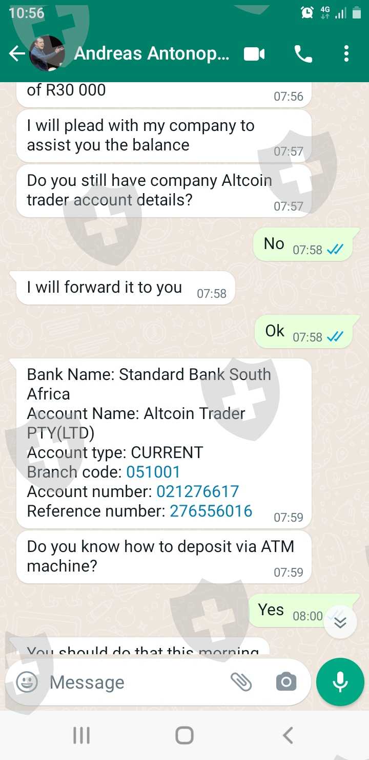 我尝试与一个自称玛丽-塔托的人进行交易,另一个是安德里斯-安东诺普洛斯。我在luno应用程序中存入5000兰特,她将其发送到网上交易的地址,然后她告诉我用25500兰特升级,我存入后,她告诉我在我收到收益之前为公司存入10%。几天后,她告诉我,我必须支付国际货币基金组织代码,我拒绝支付,现在她正忙着劝我支付。我一共入金了86500兰特,我想要把钱拿回来,我需要帮助让我的钱回来,我现在因为他们已经破产了。