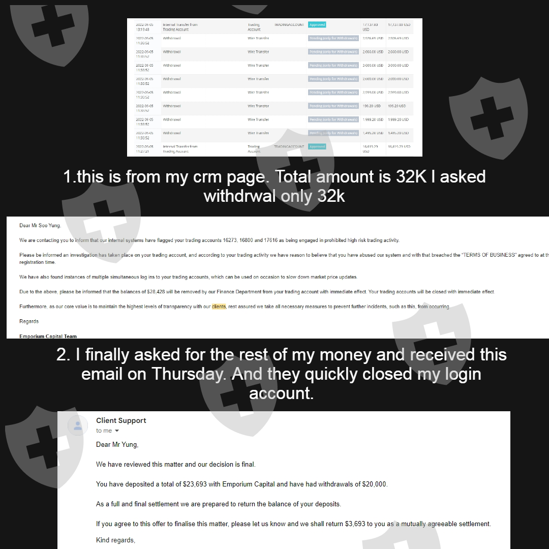 I didn't receive 32K from emporiumcapital its a very dangerous broker. My manager cheated on me and coveted the deposit of customers and their deal is for B-book. and they closed my client account and trading accounts. so i can't show from client page