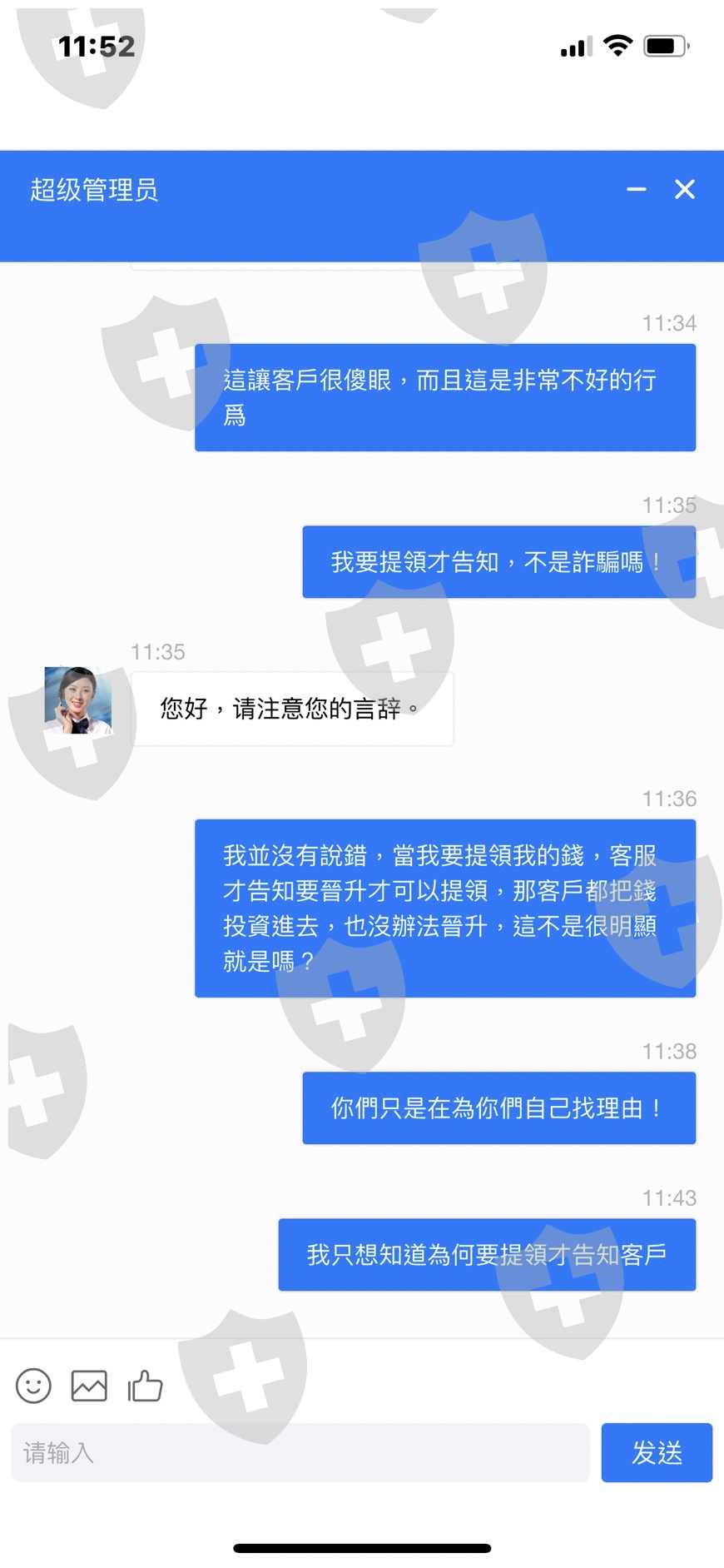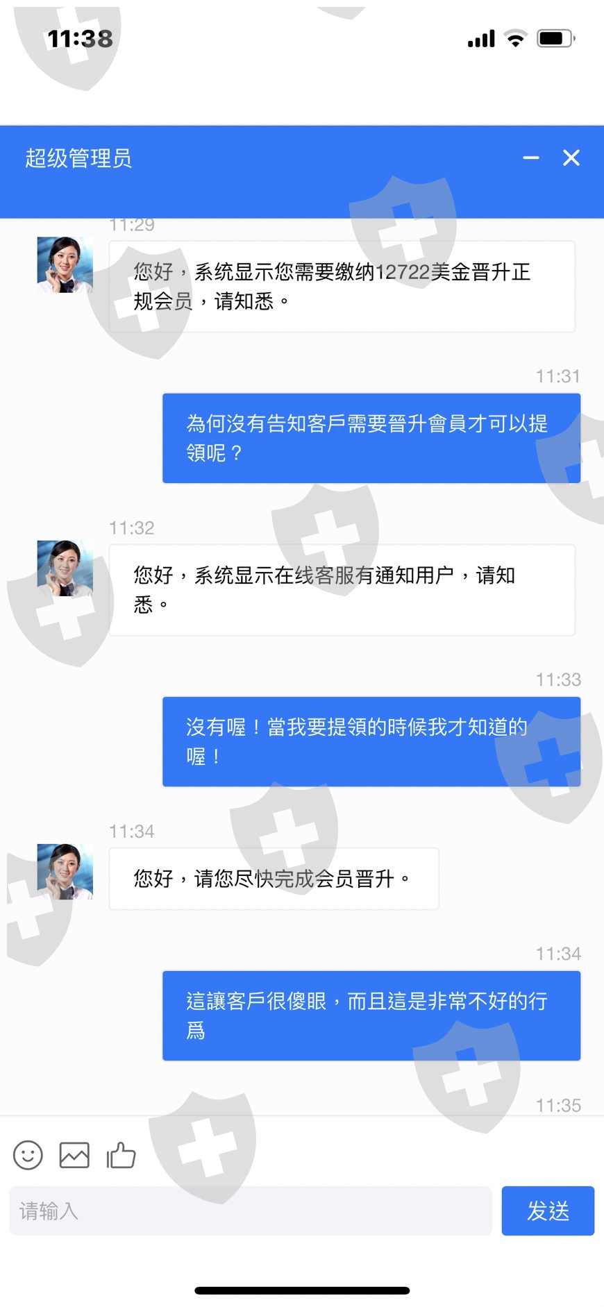 我的帳戶遭凍結,客服說我長時間沒有處理我的帳戶,所以逾期導致被凍結,客服說我需要再三個工作日內完成我的帳戶會員的晉升,我必須要繳納12722美金晉升正規會員,才可以提領.客服從頭到尾都沒有告知會員要晉升才可以提領,等到我要出金才告知,還要繳納12722,這不是詐騙的行為嗎。這根本就不合理。我只想拿回我的本金。