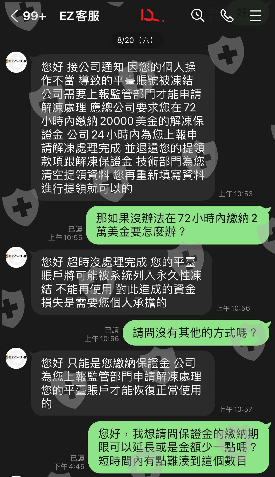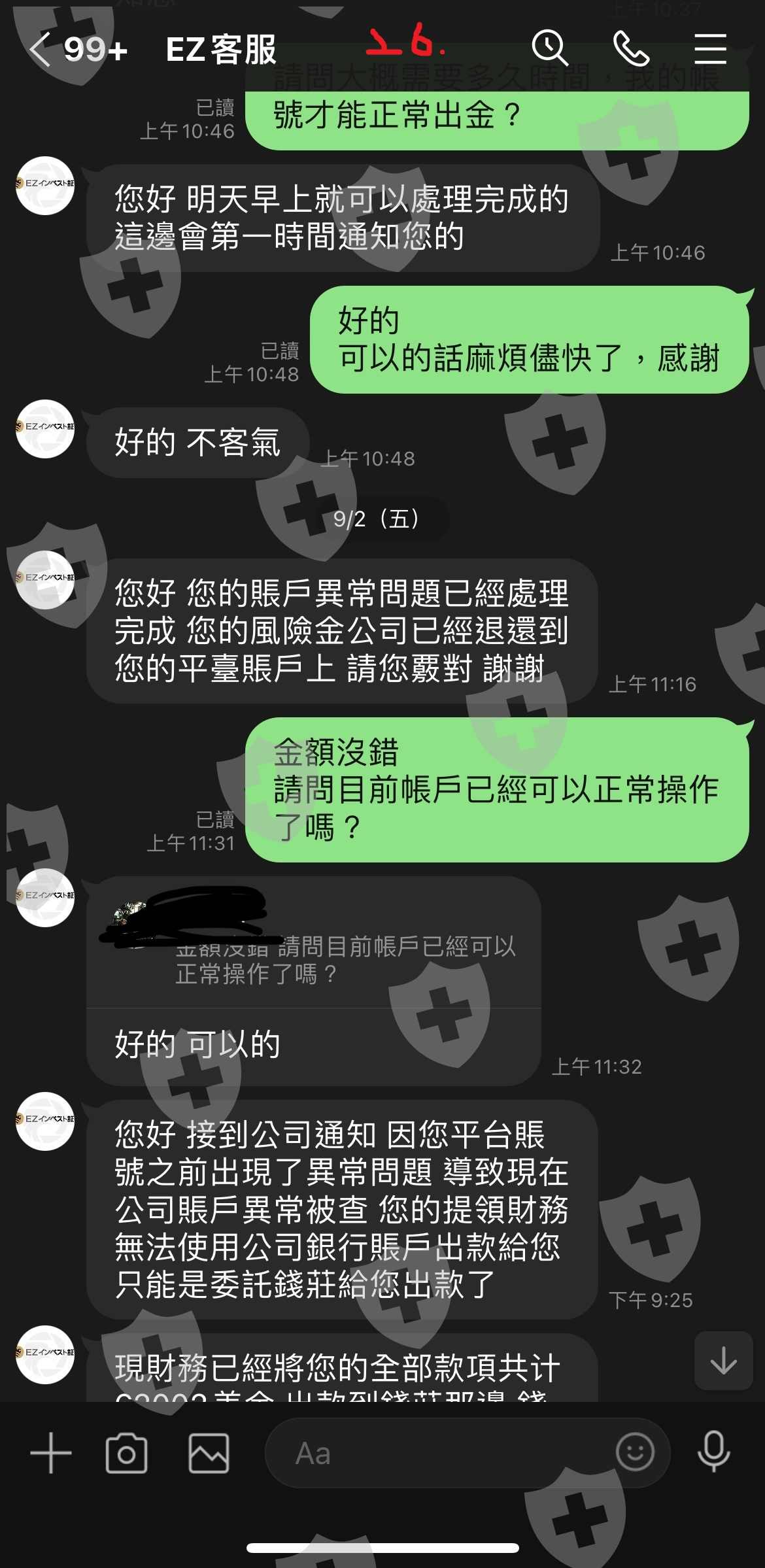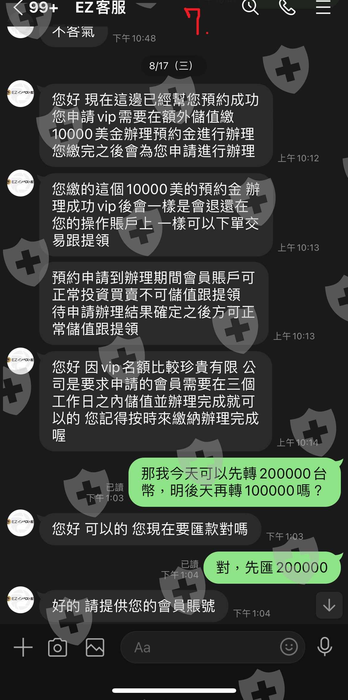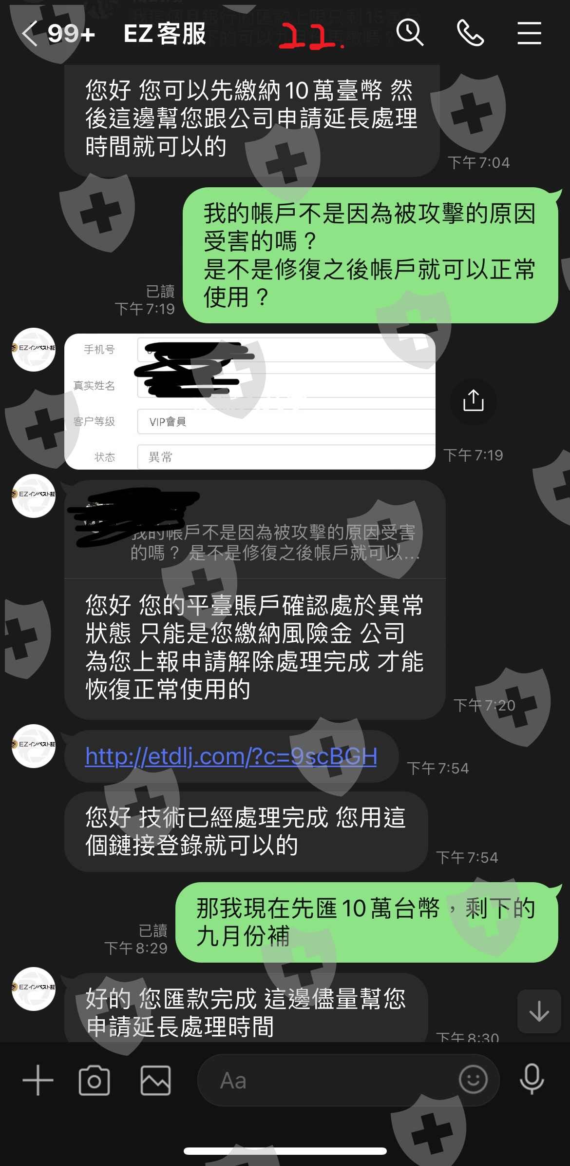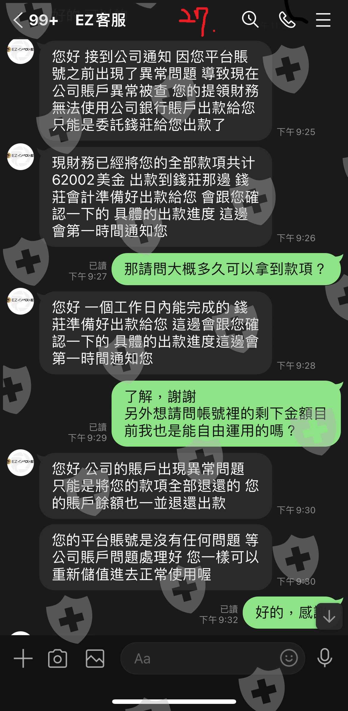 最初因為申辦帳戶VIP及解決凍結帳戶問題已繳一大筆錢,之後又說是我的帳戶有問題無法出金我所需要的金額,需要先出清所有帳戶內款項並擅自交由錢莊匯款,後來又說錢莊要求繳交確認金才能匯款,最後詢問繳交問題卻都已讀不回