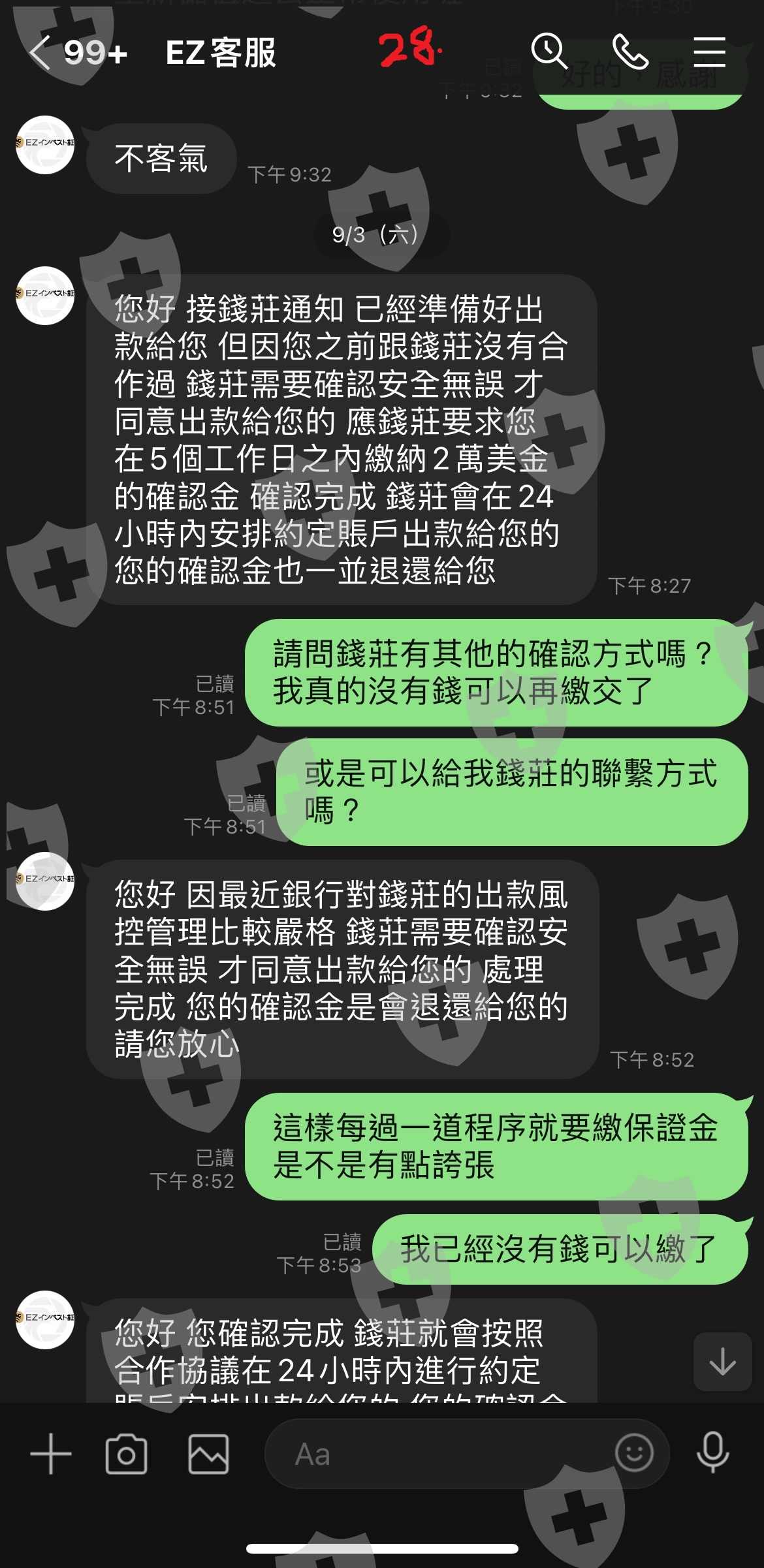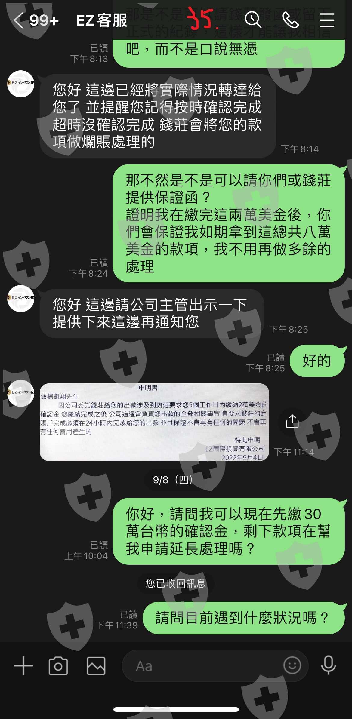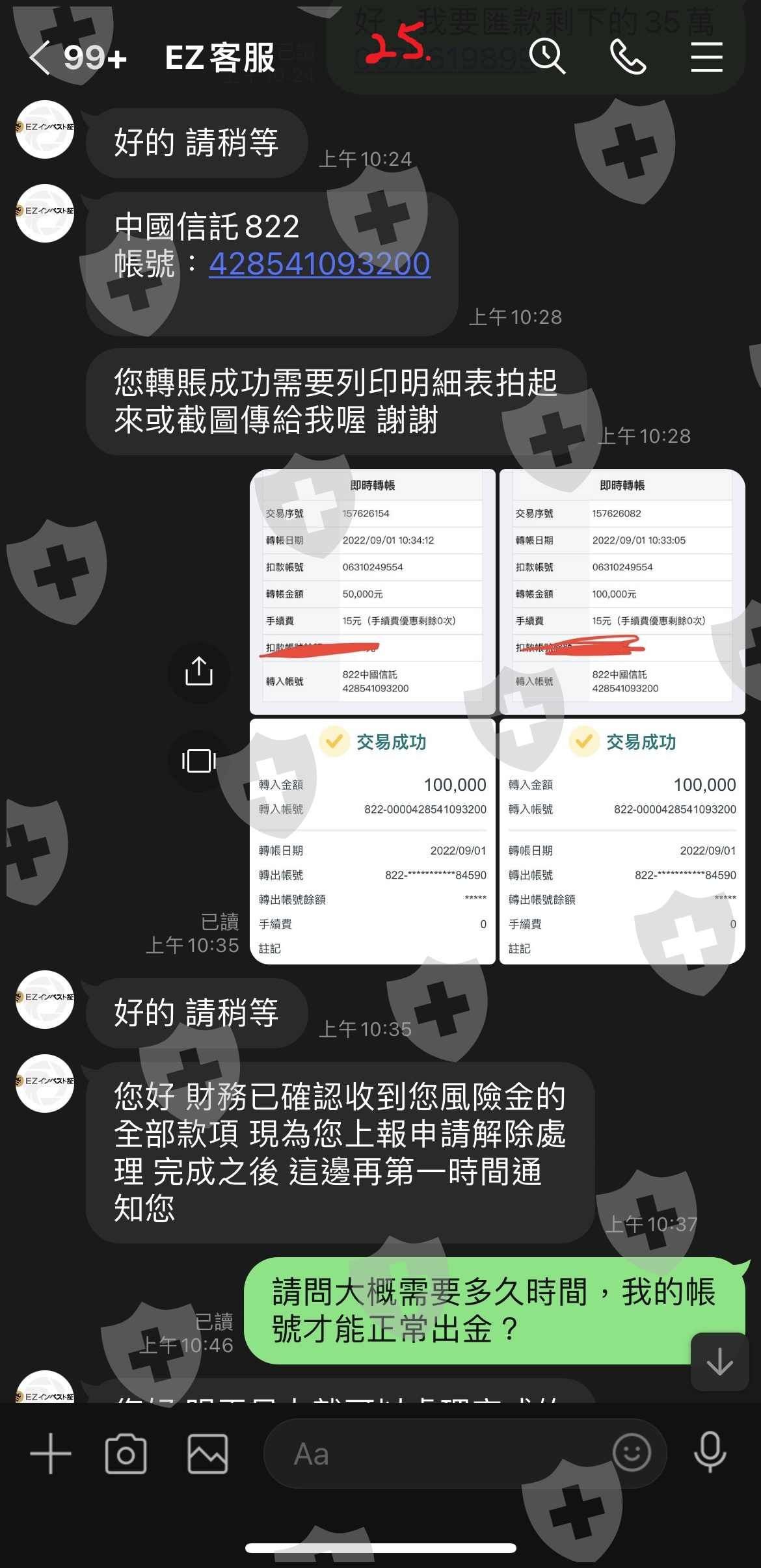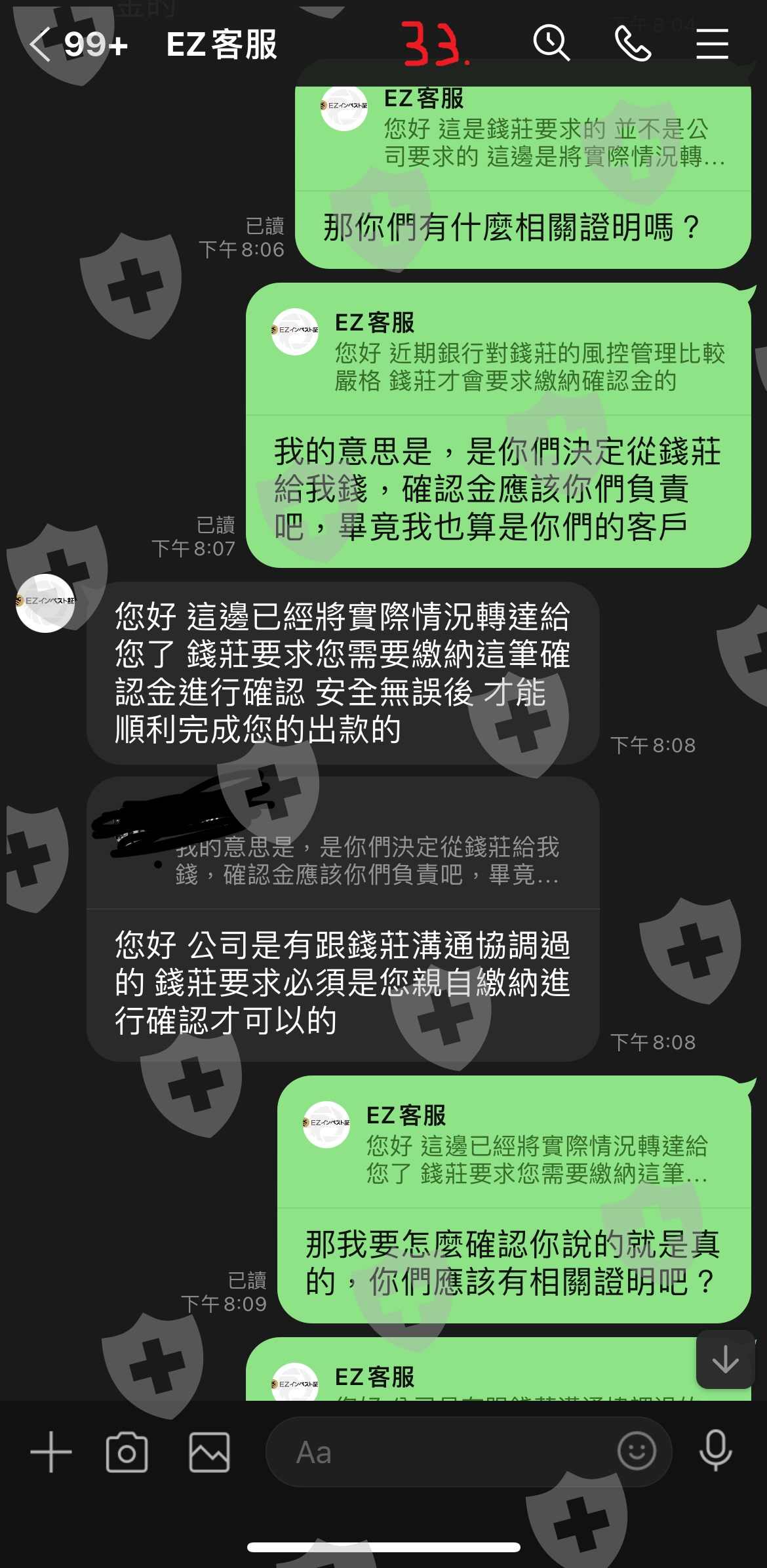 最初因為申辦帳戶VIP及解決凍結帳戶問題已繳一大筆錢,之後又說是我的帳戶有問題無法出金我所需要的金額,需要先出清所有帳戶內款項並擅自交由錢莊匯款,後來又說錢莊要求繳交確認金才能匯款,最後詢問繳交問題卻都已讀不回
