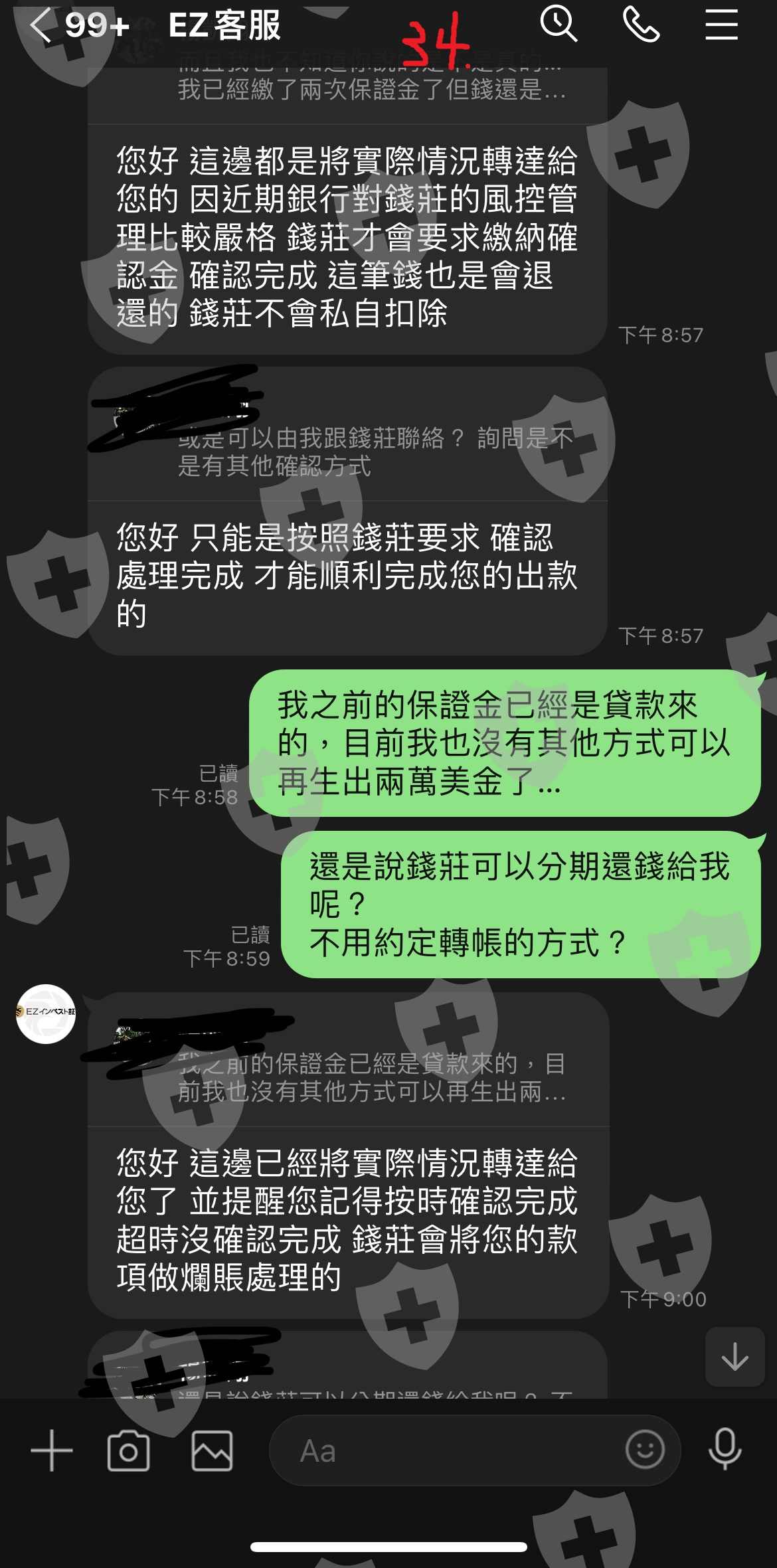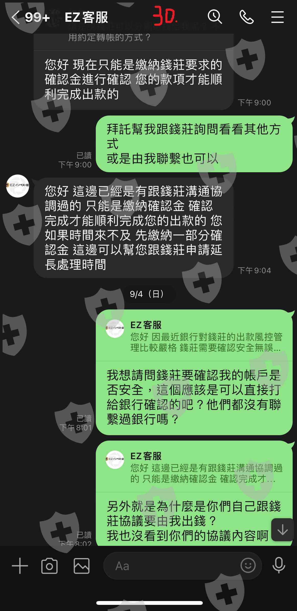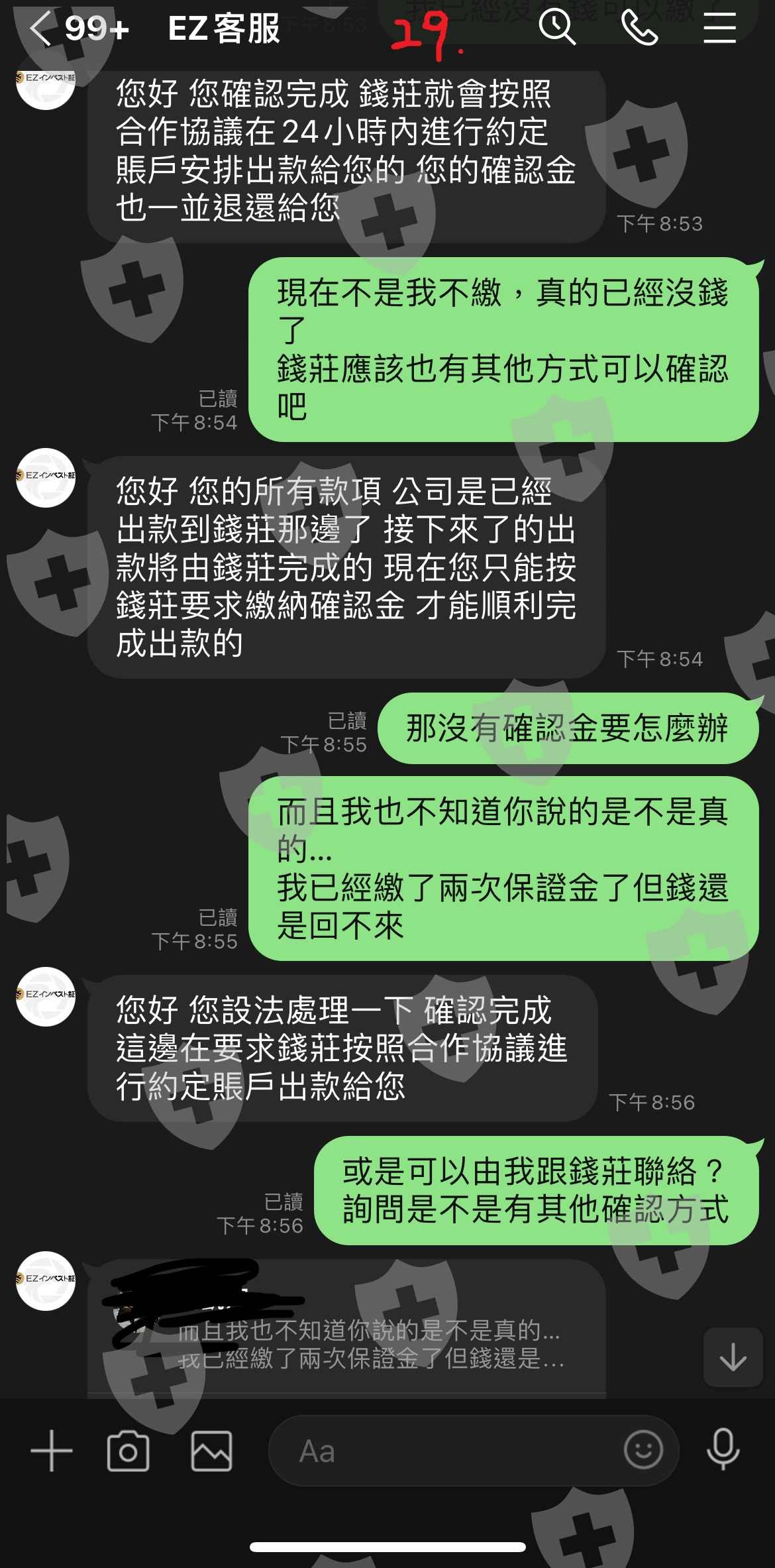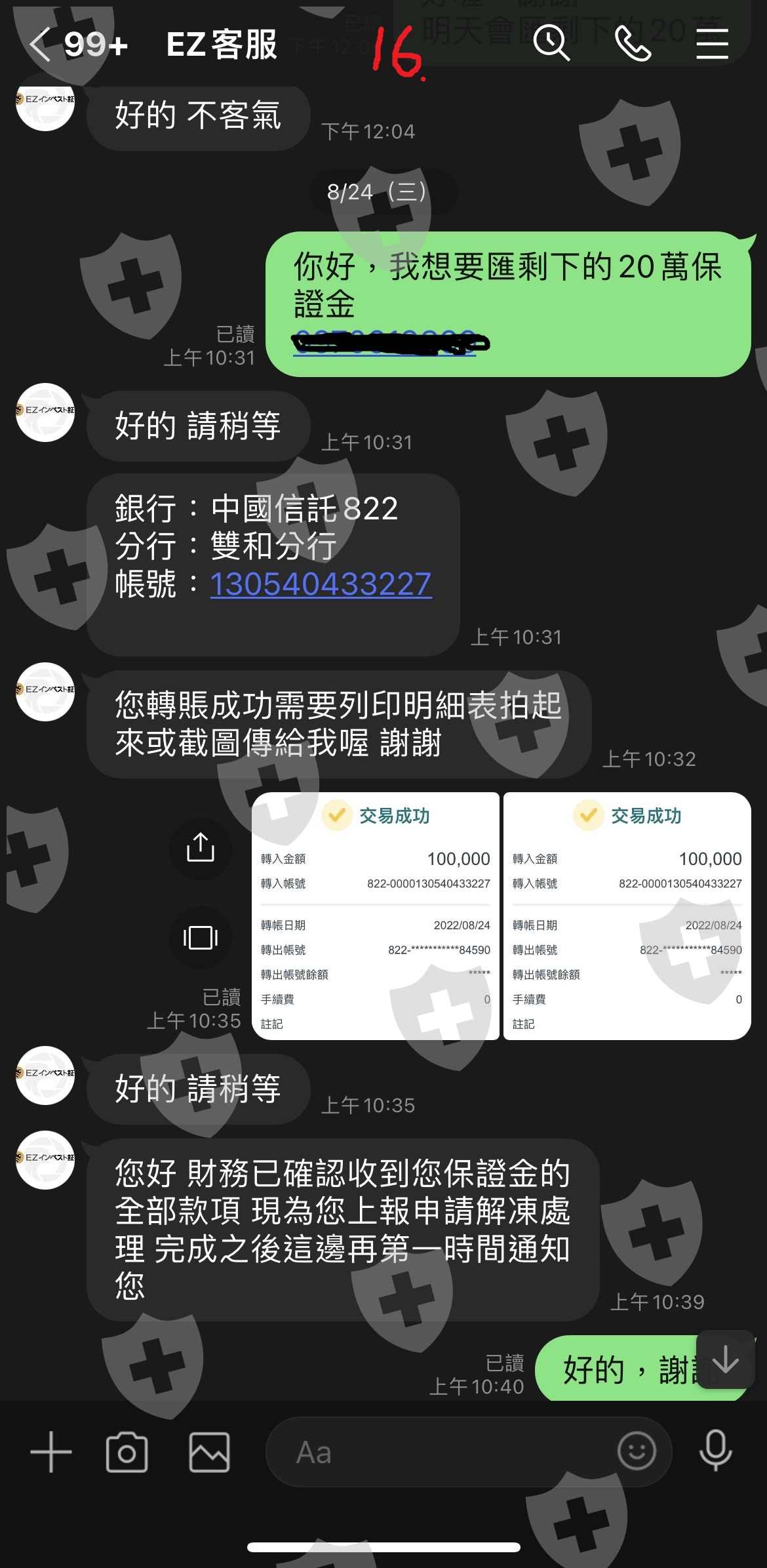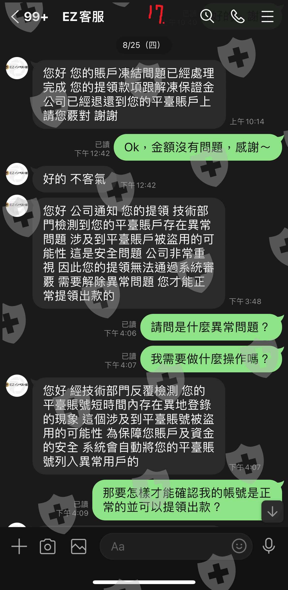 最初因為申辦帳戶VIP及解決凍結帳戶問題已繳一大筆錢,之後又說是我的帳戶有問題無法出金我所需要的金額,需要先出清所有帳戶內款項並擅自交由錢莊匯款,後來又說錢莊要求繳交確認金才能匯款,最後詢問繳交問題卻都已讀不回