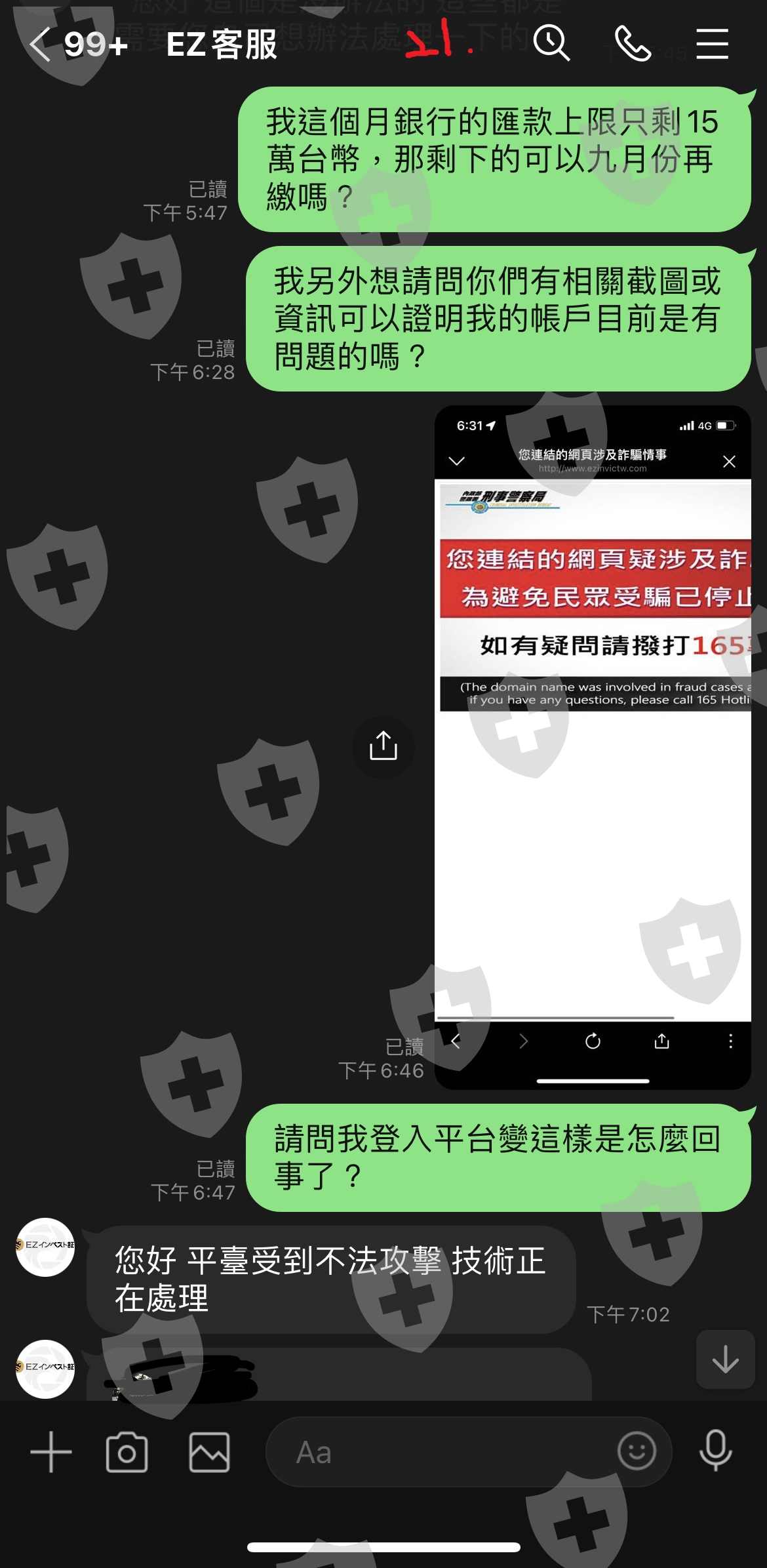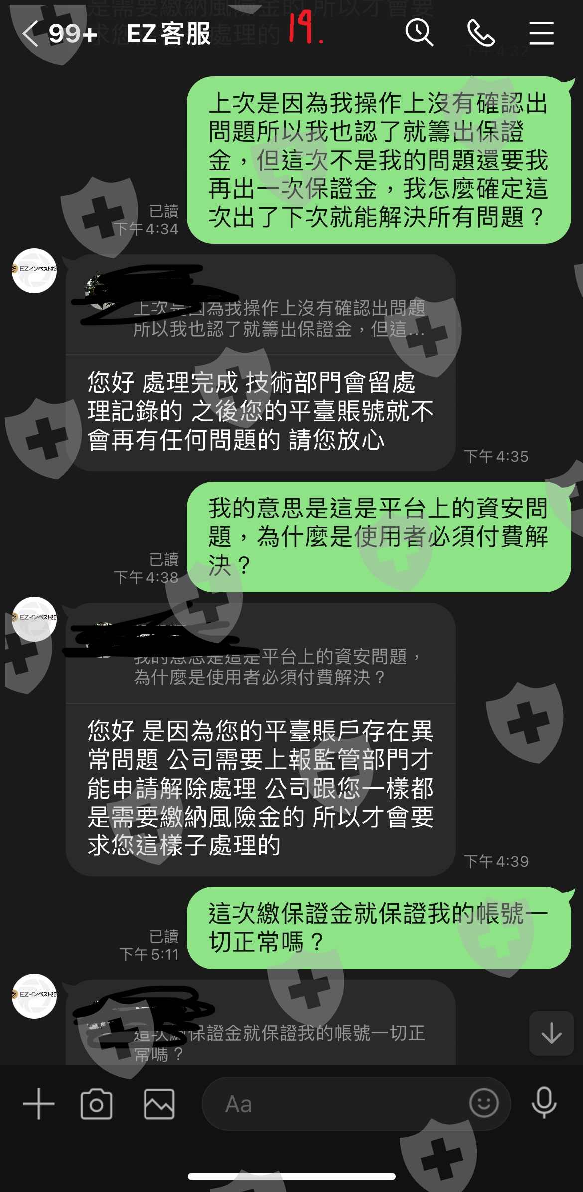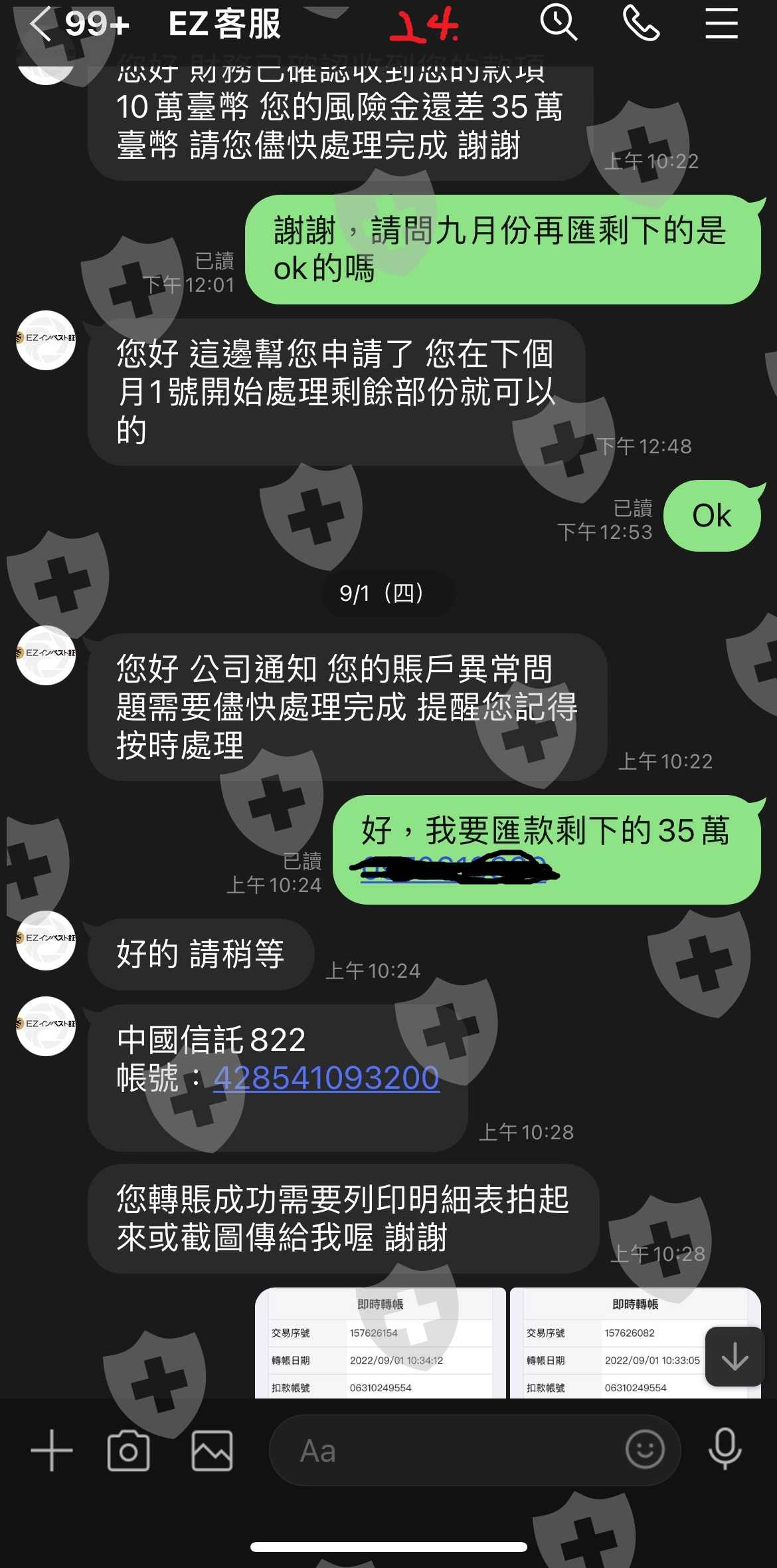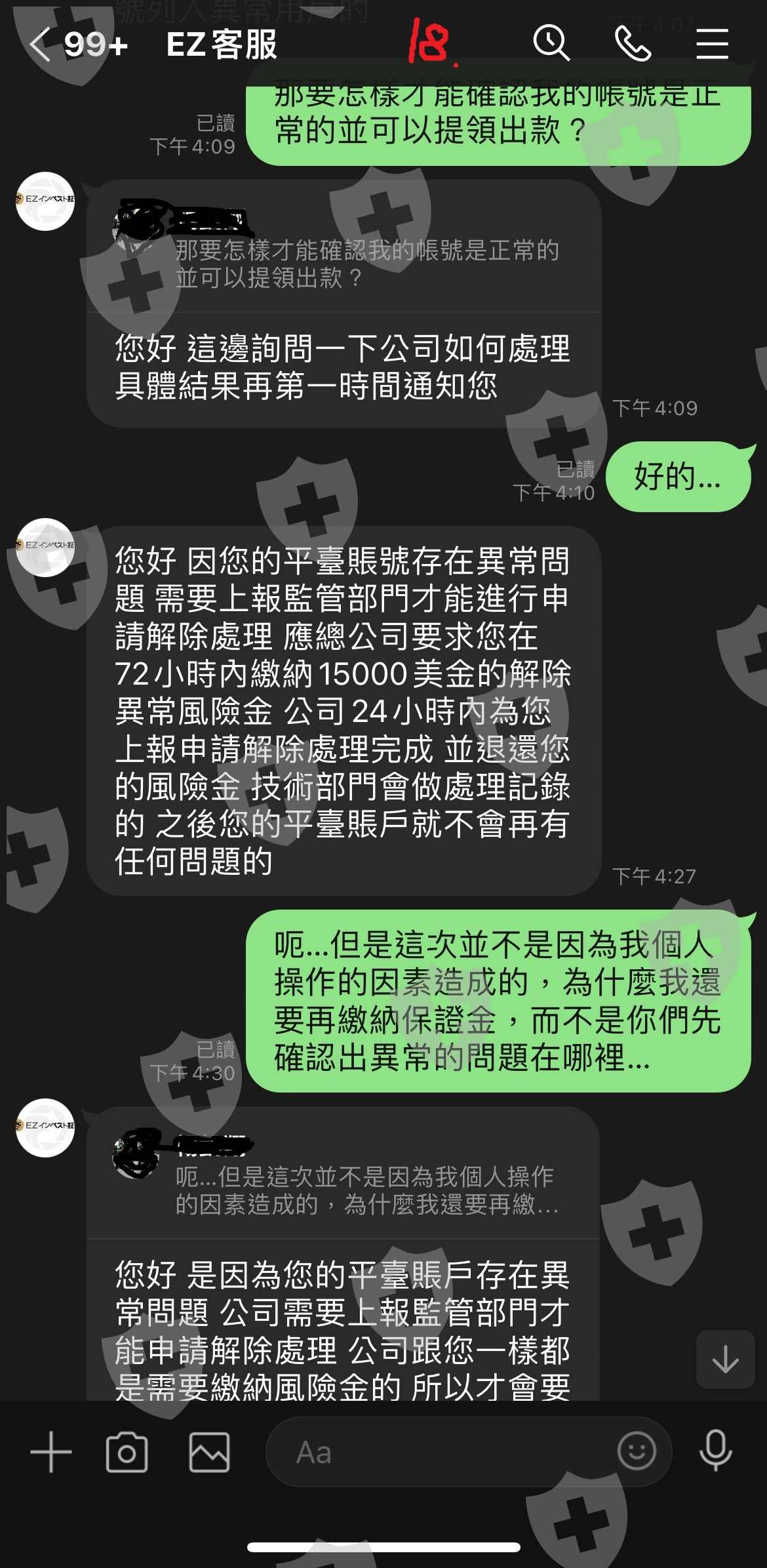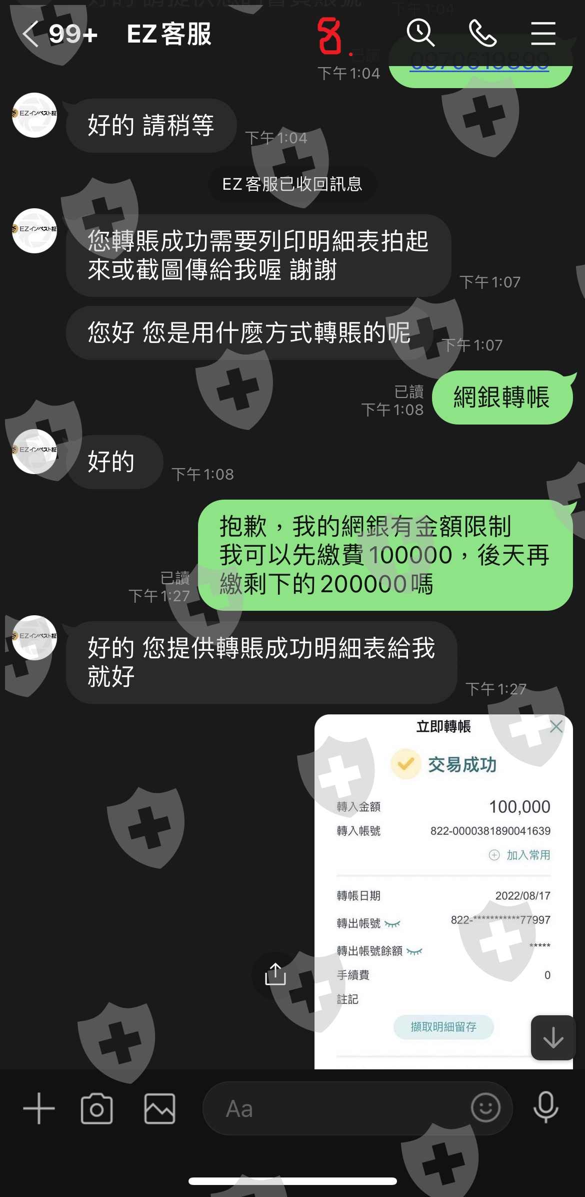 最初因為申辦帳戶VIP及解決凍結帳戶問題已繳一大筆錢,之後又說是我的帳戶有問題無法出金我所需要的金額,需要先出清所有帳戶內款項並擅自交由錢莊匯款,後來又說錢莊要求繳交確認金才能匯款,最後詢問繳交問題卻都已讀不回