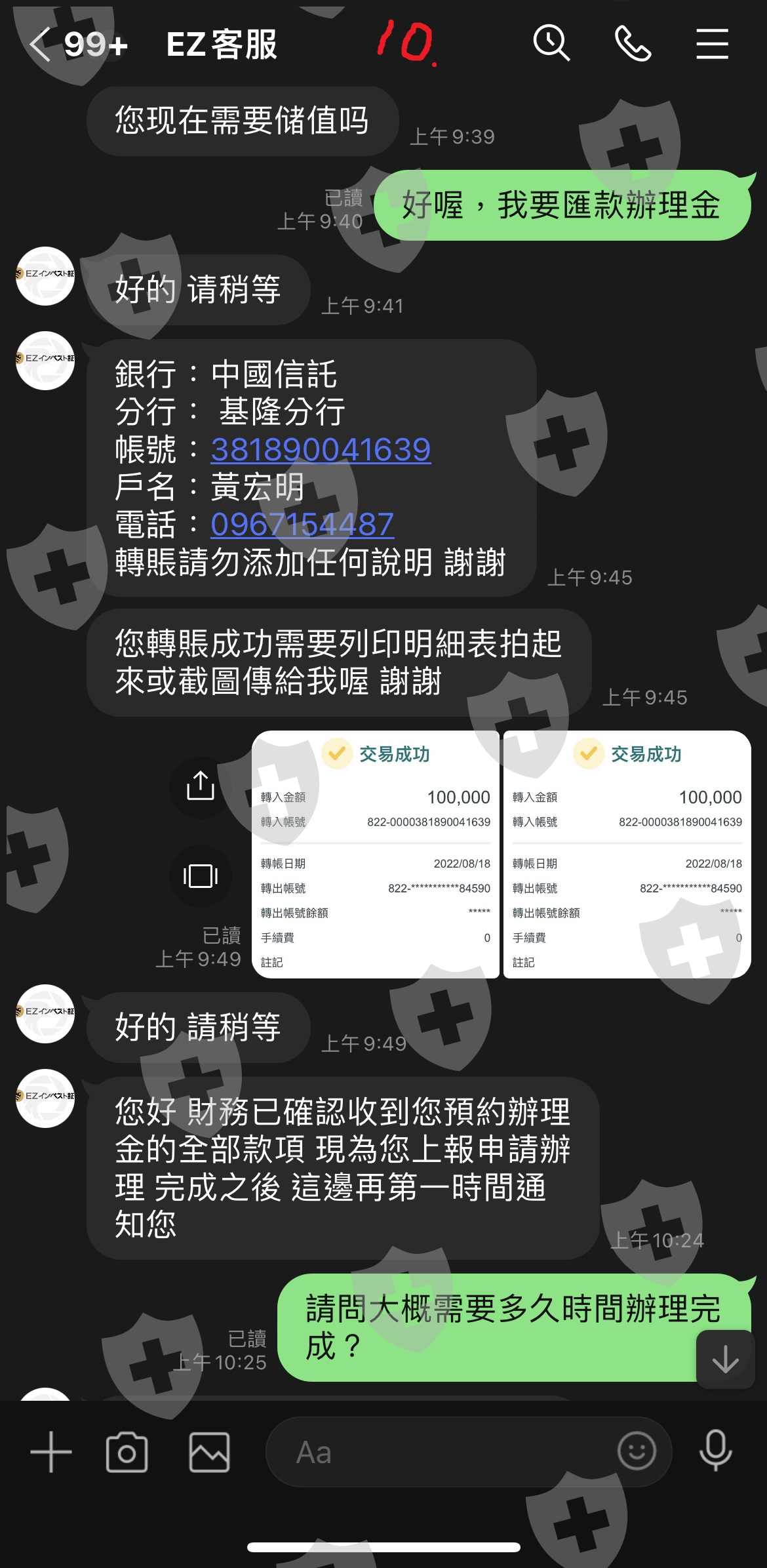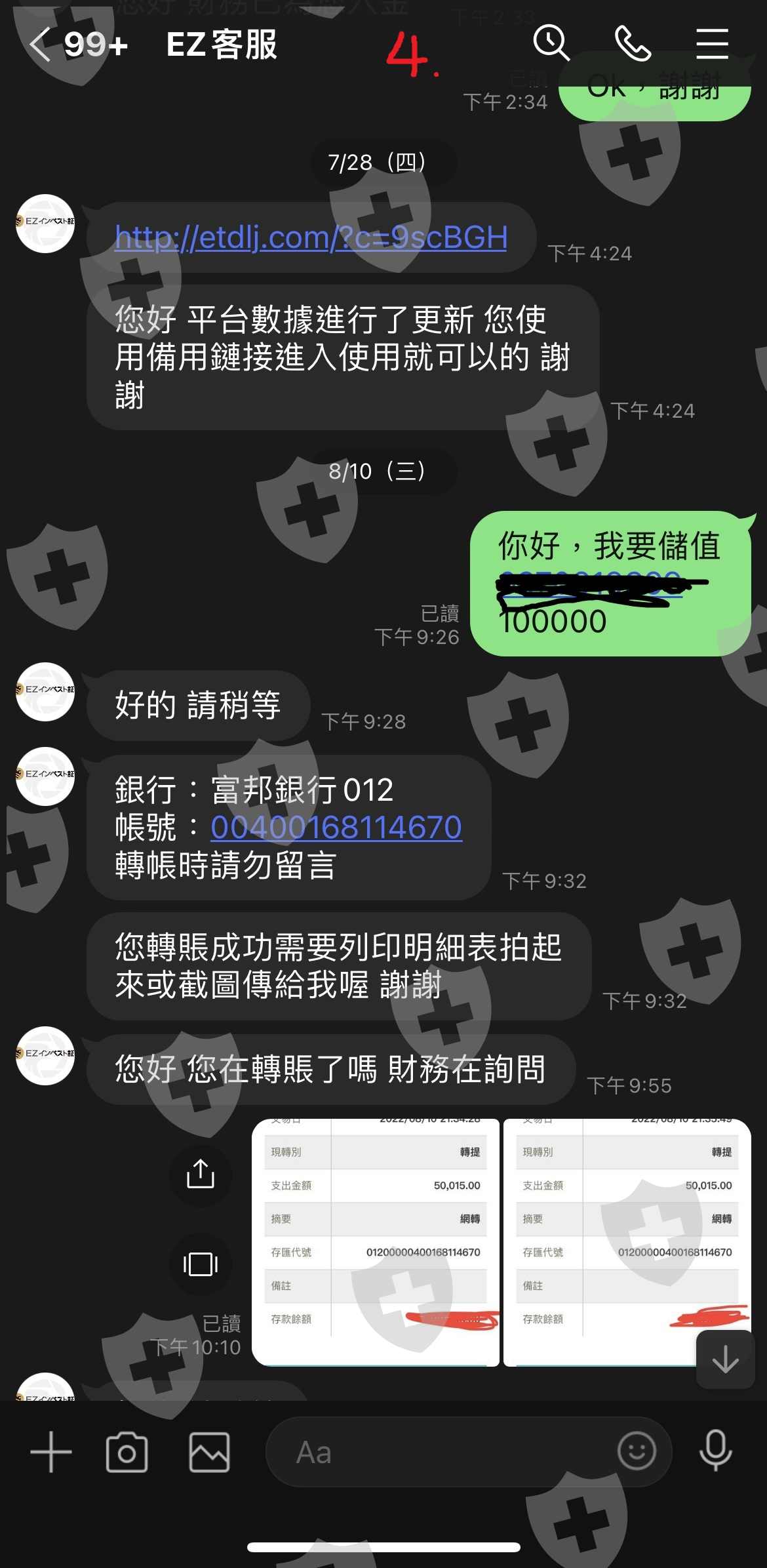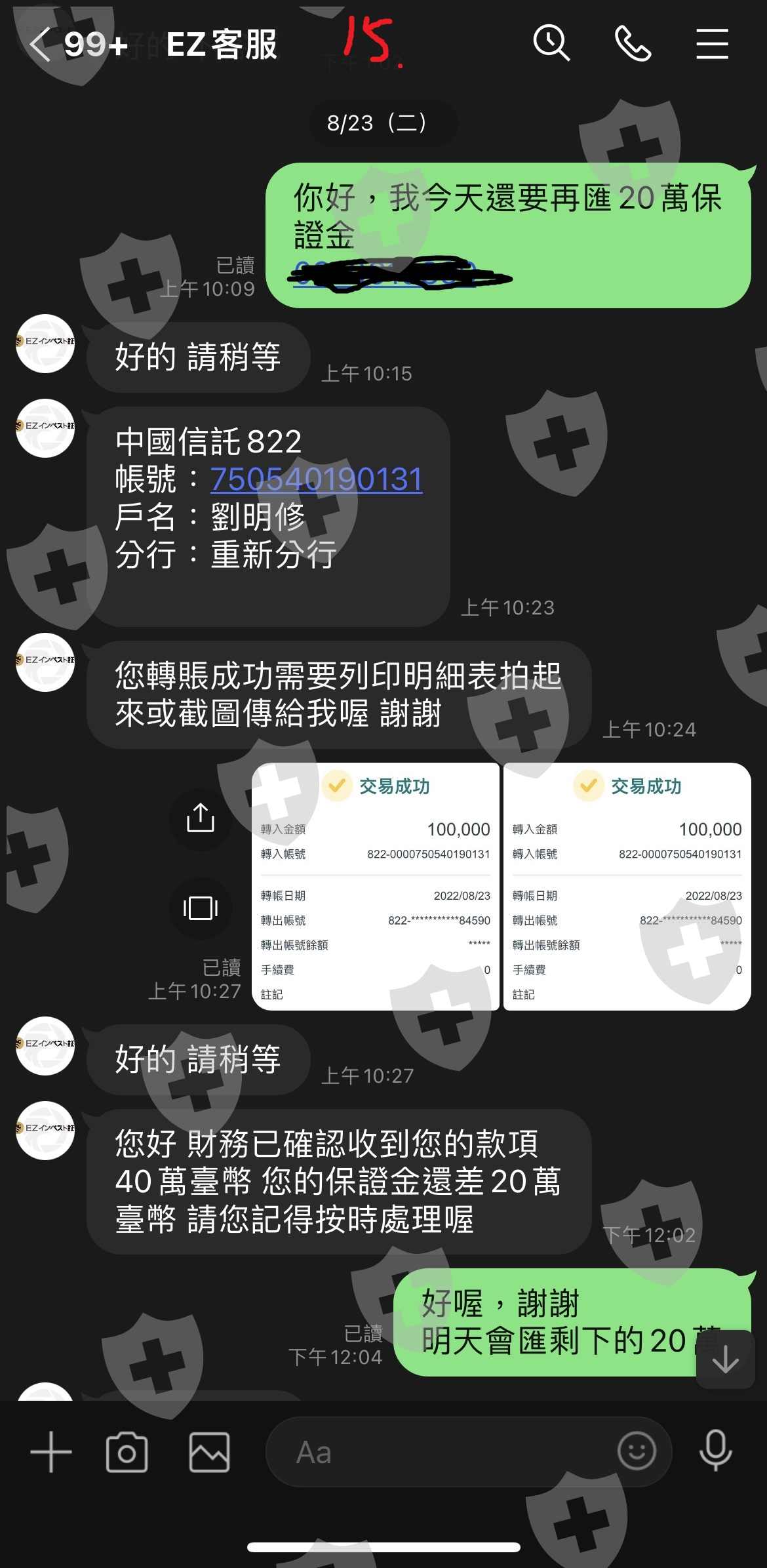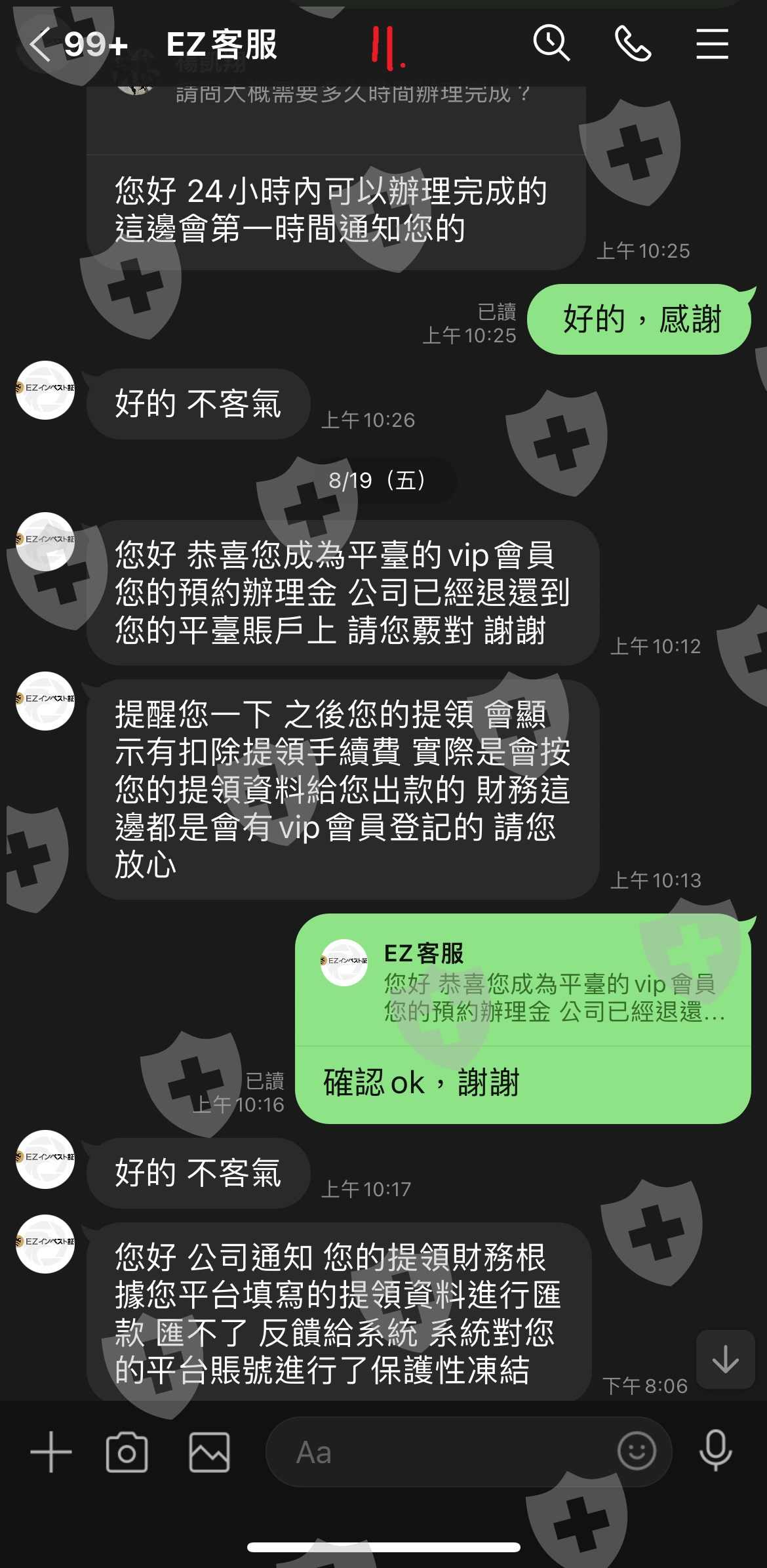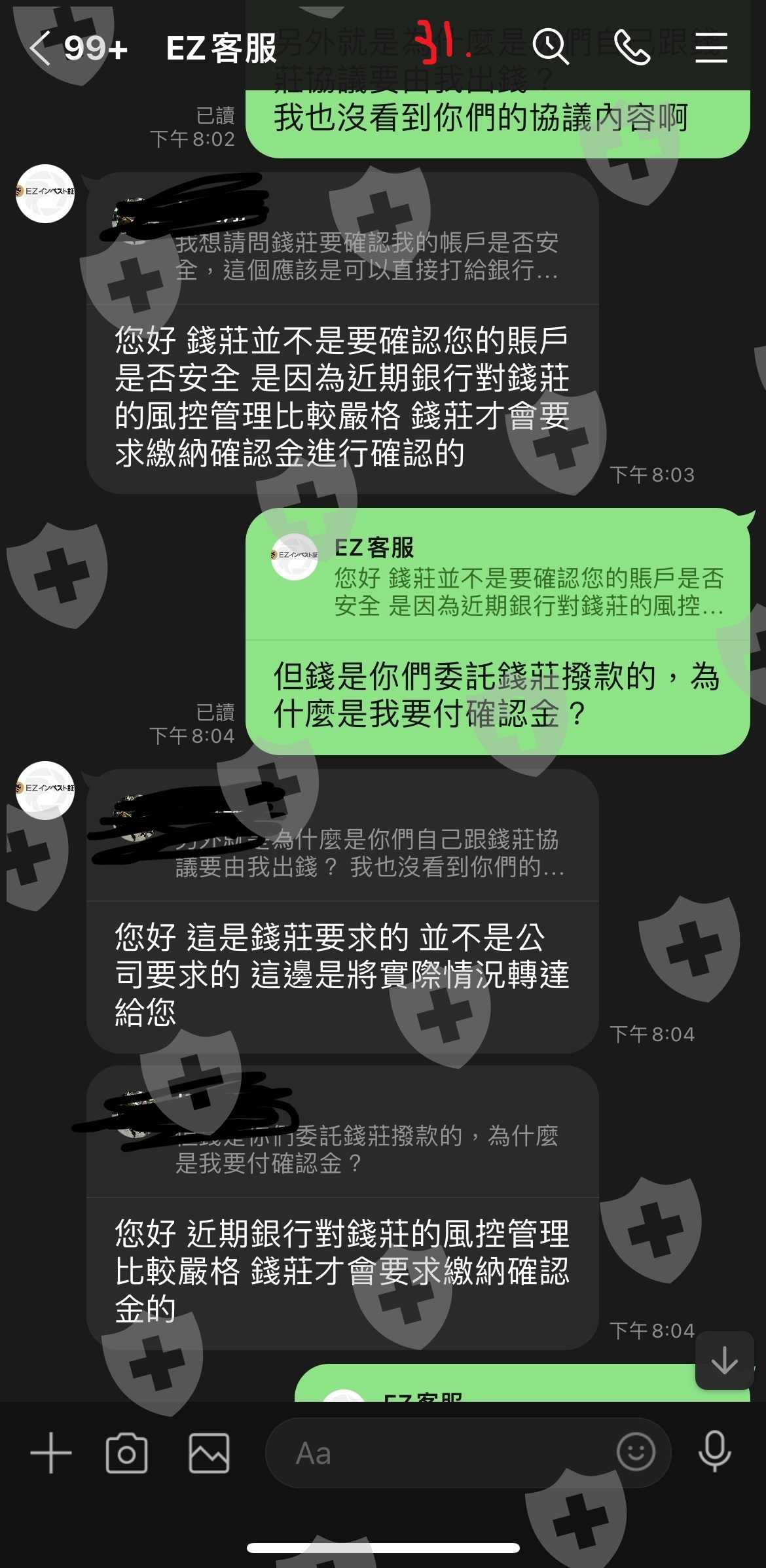 最初因為申辦帳戶VIP及解決凍結帳戶問題已繳一大筆錢,之後又說是我的帳戶有問題無法出金我所需要的金額,需要先出清所有帳戶內款項並擅自交由錢莊匯款,後來又說錢莊要求繳交確認金才能匯款,最後詢問繳交問題卻都已讀不回