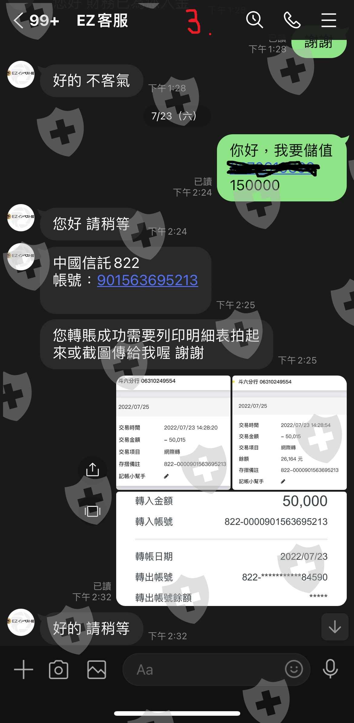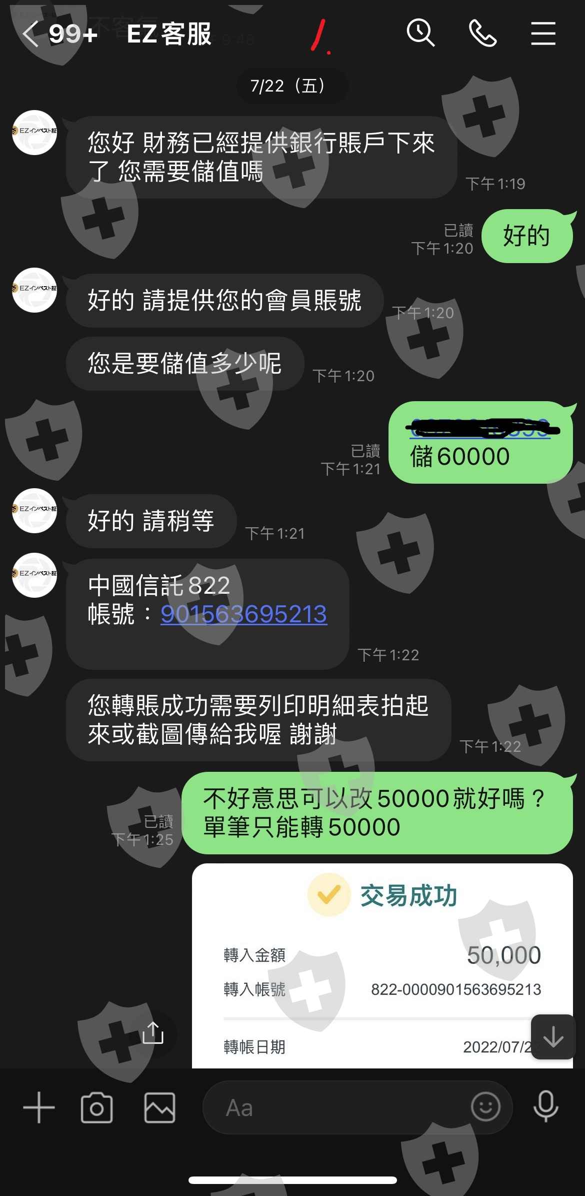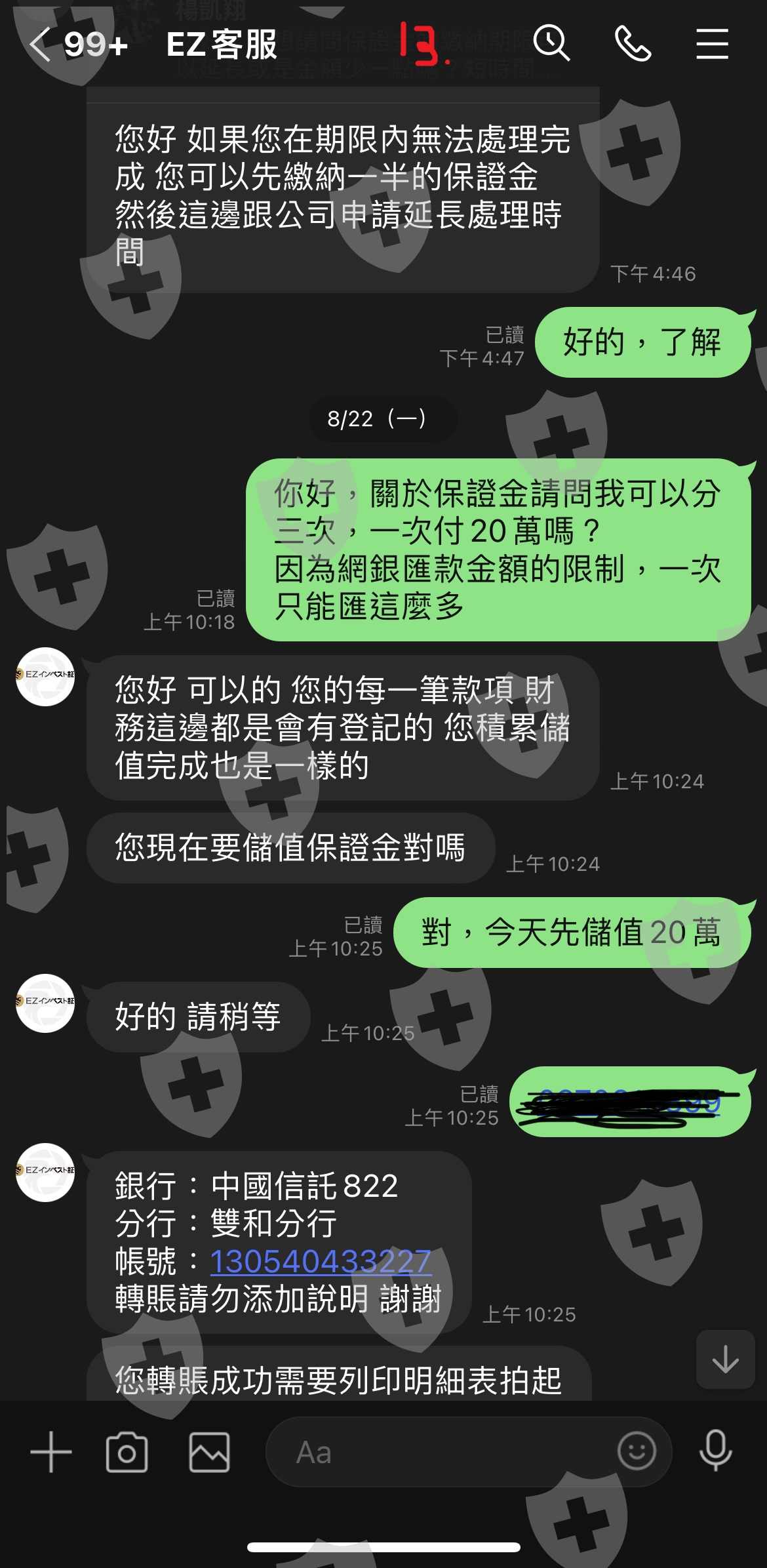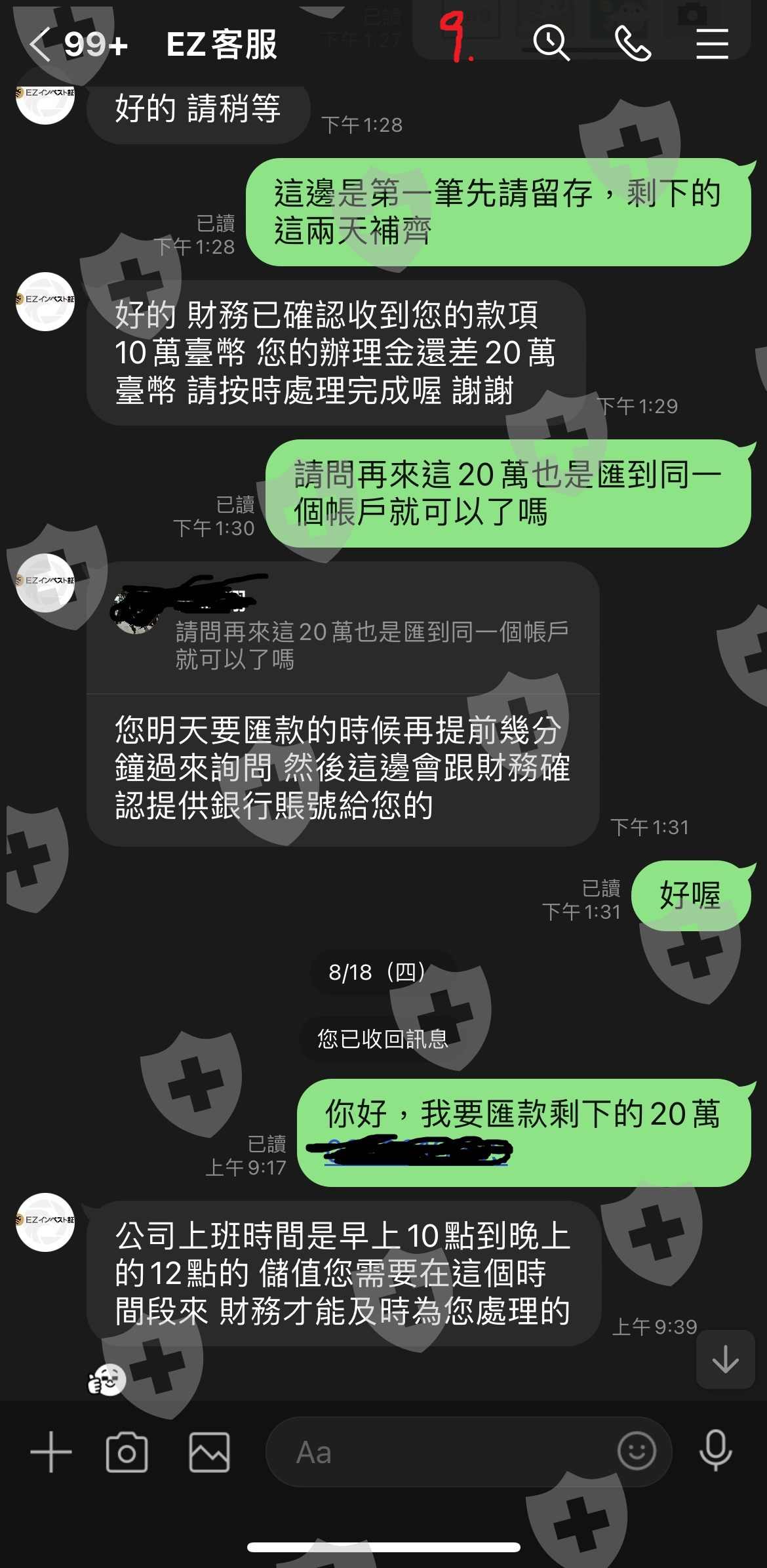 最初因為申辦帳戶VIP及解決凍結帳戶問題已繳一大筆錢,之後又說是我的帳戶有問題無法出金我所需要的金額,需要先出清所有帳戶內款項並擅自交由錢莊匯款,後來又說錢莊要求繳交確認金才能匯款,最後詢問繳交問題卻都已讀不回