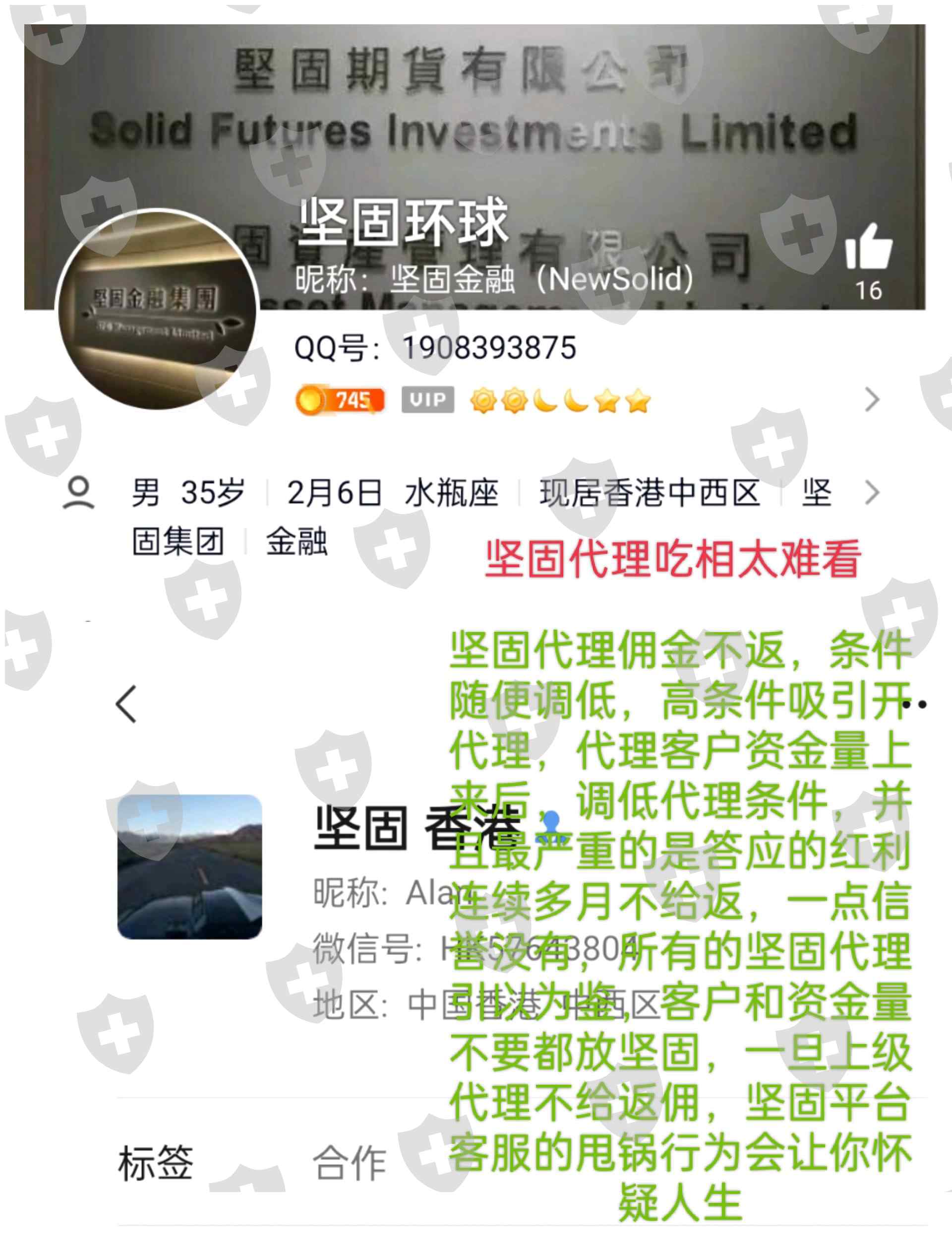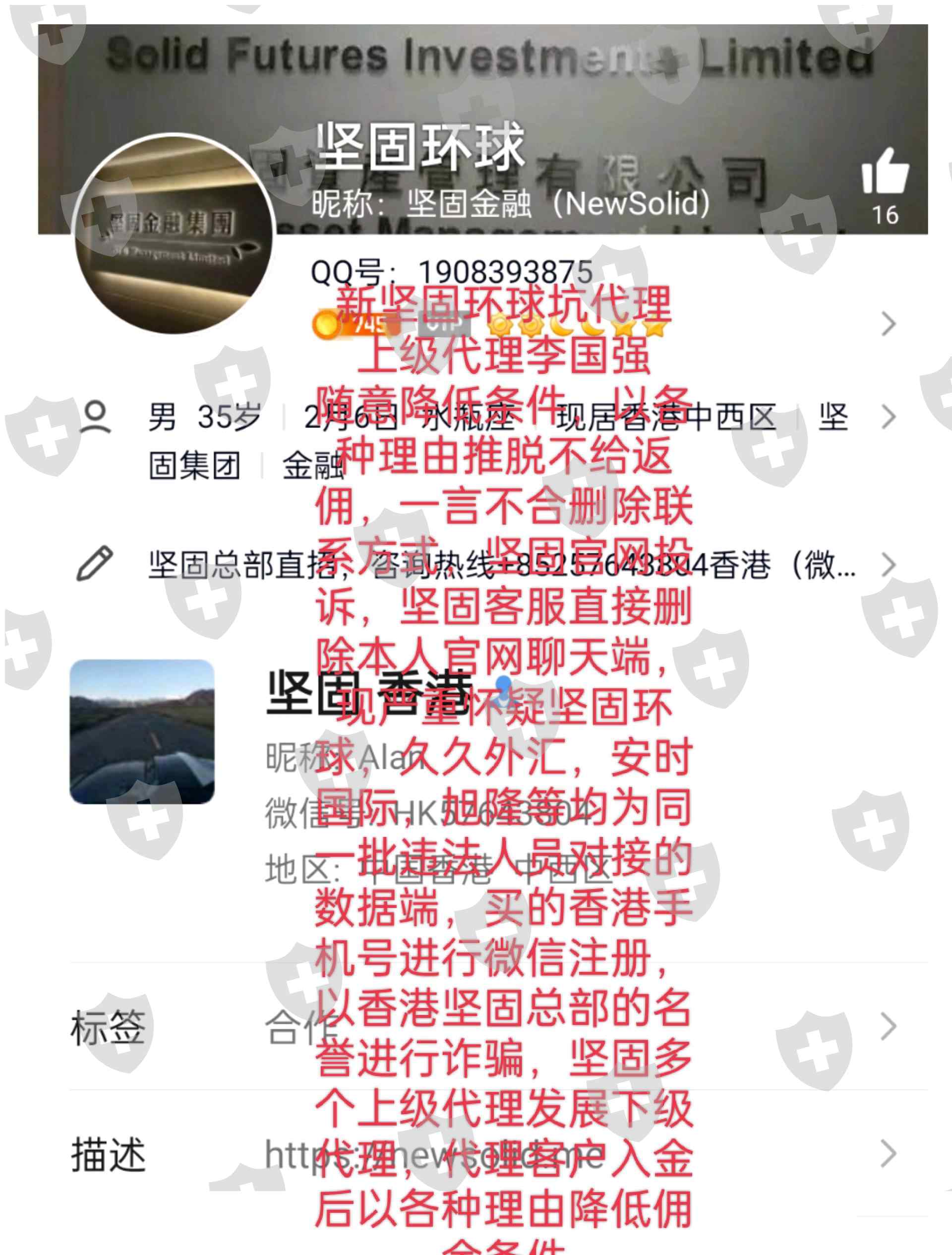 新坚固环球 打着香港环球的名誉,在大陆开展业务,坚固代理买来香港手机号用于注册微信,以高条件吸引代理开客户,客户资金进来后,以各种借口随意降低条件,严重怀疑新坚固环球,久久外汇,安时国际,旭隆国际为同一批人员搭建数据端,进行发展代理,后期直接不予以返佣,官网客服投诉,官网客服直接关闭本人聊天端,上级代理已删除所有的联系方式,在此曝光新坚固环球代理的恶行,