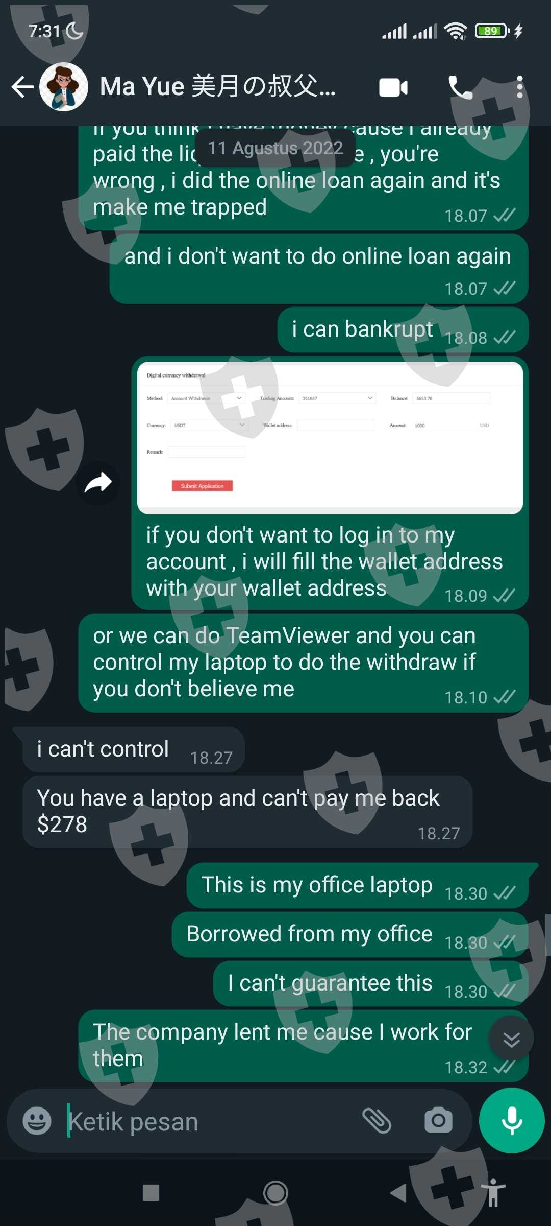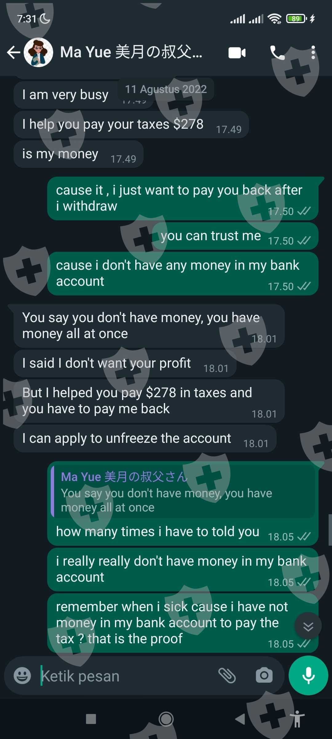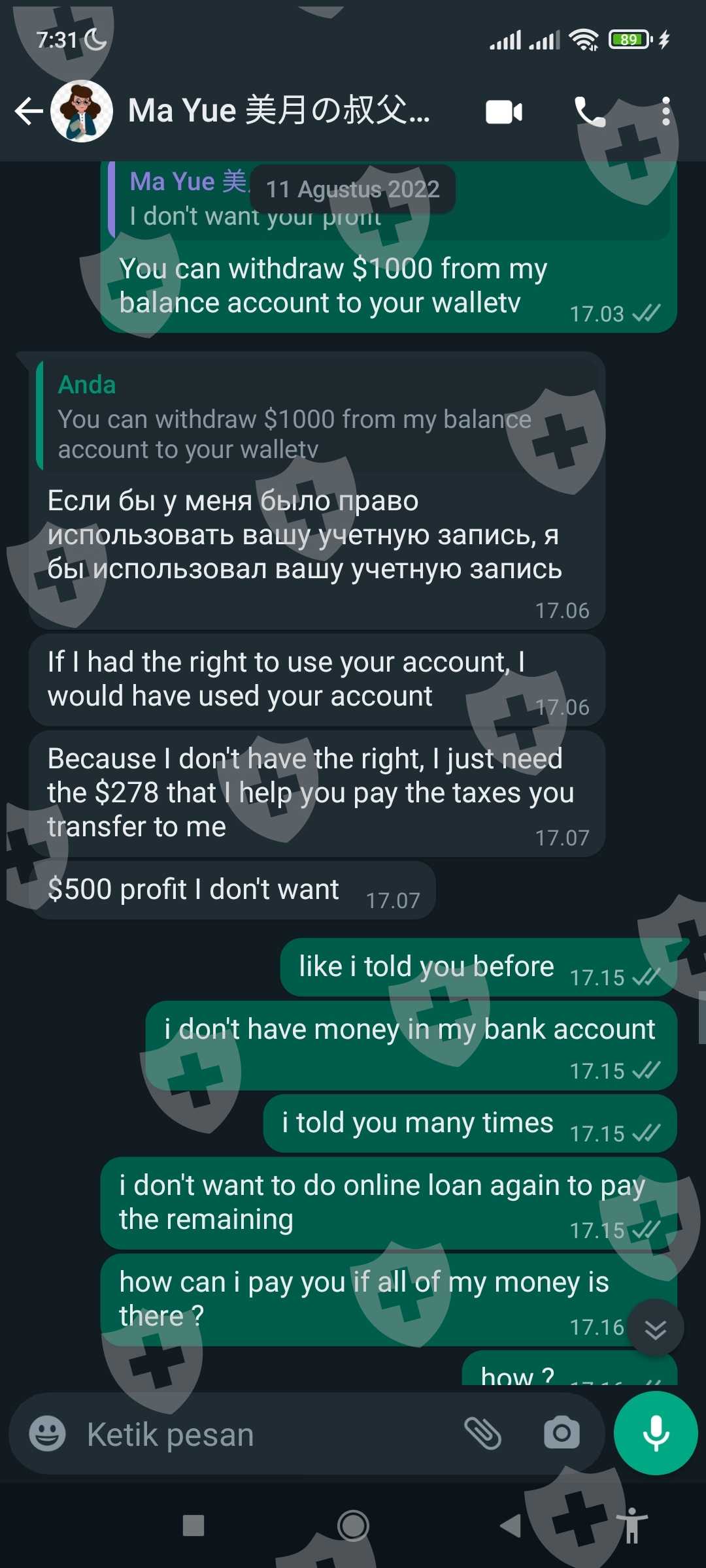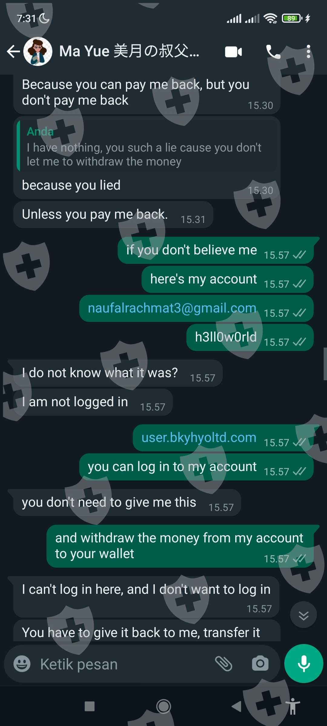 Kenal seorang wanita dari Tiktok, mengaku sebagai orang Jepang dan dia merayu saya dengan manis, kemudian ngajarin saya trading dgn broker BKYHYO, pertama saya deposit $65, kemudian deposit lagi jadi total dana saya $1054 , kemudian saya diajarkan trade dengan pamannya dan dapat untung sebesar $5056, tetapi setiap mendapat keuntungan saya harus membayar pajak ke pamannya sebesar 20% dari keuntungan, ketika ingin menarik uang, saya tidak bisa menarik uang dan harus bayar pajak, mereka mengharuskan saya bayar pajak sebesar $676 , kemudian saya bayar $400 dan di bantu dgn paman nya $276 , kemudian saya membayar lagi $227 untuk membayar denda harian karena saya tidak bayar pajak nya tepat waktu kata mereka, tetapi setelah itu pamannya ber bohong dan membekukan akun saya di BKYHYO dan saya harus membayar $276 , padahal sebelum nya saya sudah berjanji akan mengembalikan dana dia setelah sukses withdraw dan dia setuju, tapi kenyataannya saya ttp tidak bisa menarik dana saya, kemudian saya cek alamat web untuk dashboard BKYHYO domainnya menghilang dan berubah jadi alamat IP saya, dan tiba tiba akun saya di hapus, tolong saya, saya sudah bangkrut dan punya hutang karena terjun ke forex dan tidak tahu apa apa