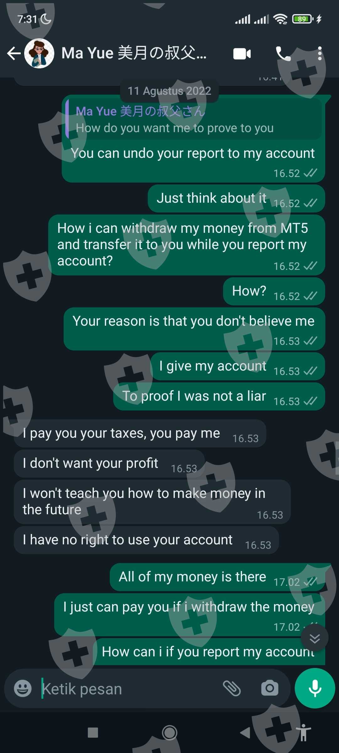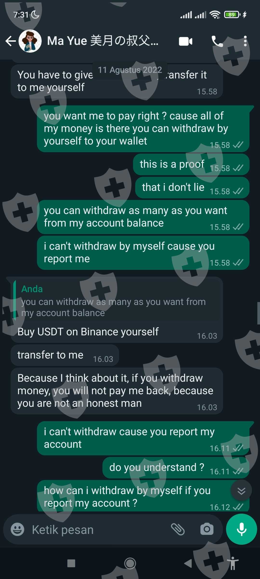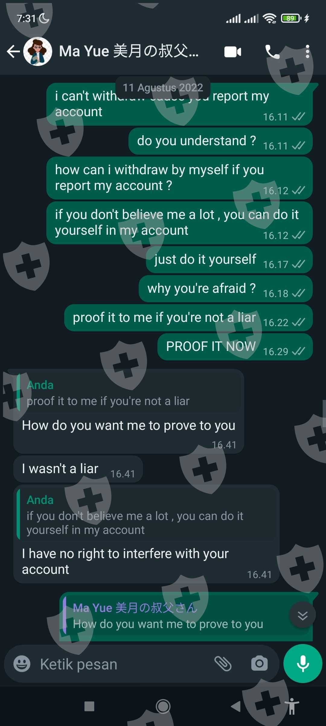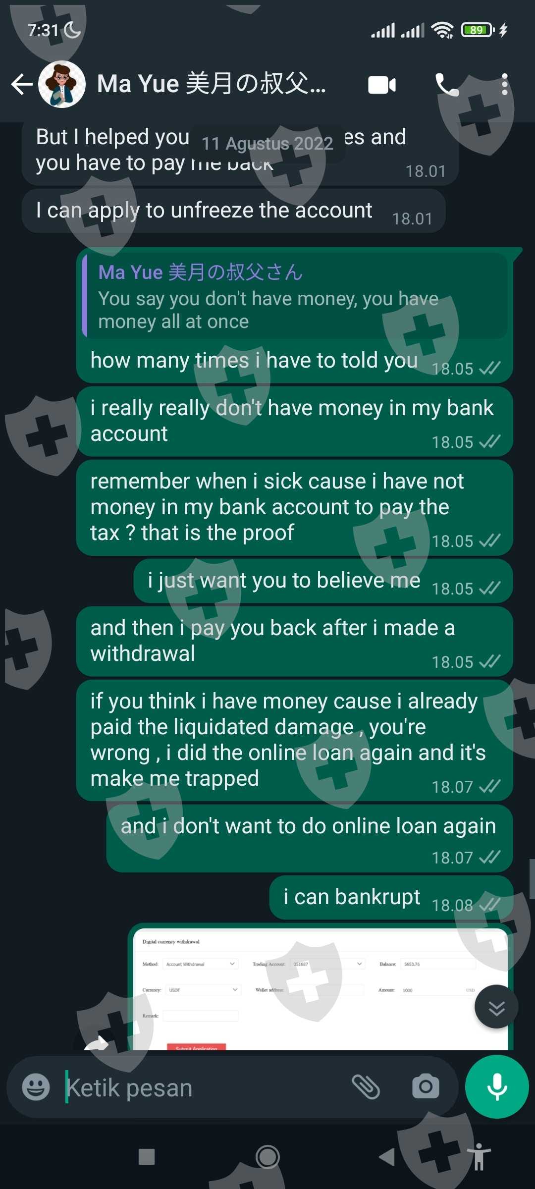 Kenal seorang wanita dari Tiktok, mengaku sebagai orang Jepang dan dia merayu saya dengan manis, kemudian ngajarin saya trading dgn broker BKYHYO, pertama saya deposit $65, kemudian deposit lagi jadi total dana saya $1054 , kemudian saya diajarkan trade dengan pamannya dan dapat untung sebesar $5056, tetapi setiap mendapat keuntungan saya harus membayar pajak ke pamannya sebesar 20% dari keuntungan, ketika ingin menarik uang, saya tidak bisa menarik uang dan harus bayar pajak, mereka mengharuskan saya bayar pajak sebesar $676 , kemudian saya bayar $400 dan di bantu dgn paman nya $276 , kemudian saya membayar lagi $227 untuk membayar denda harian karena saya tidak bayar pajak nya tepat waktu kata mereka, tetapi setelah itu pamannya ber bohong dan membekukan akun saya di BKYHYO dan saya harus membayar $276 , padahal sebelum nya saya sudah berjanji akan mengembalikan dana dia setelah sukses withdraw dan dia setuju, tapi kenyataannya saya ttp tidak bisa menarik dana saya, kemudian saya cek alamat web untuk dashboard BKYHYO domainnya menghilang dan berubah jadi alamat IP saya, dan tiba tiba akun saya di hapus, tolong saya, saya sudah bangkrut dan punya hutang karena terjun ke forex dan tidak tahu apa apa