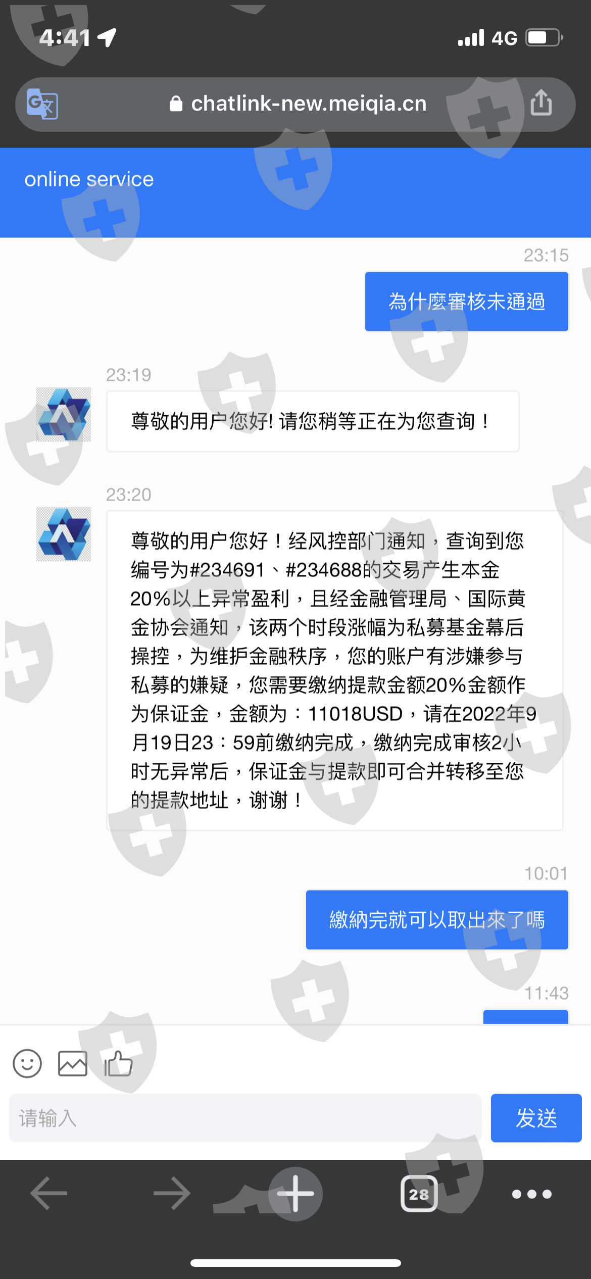 在ig上認識不知名男性 先關心你的工作你的心情 順勢問金錢方面的問題 說可以帶著我做額外收入 甚至還傳照片給我看 好讓我相信他 第一次入金時可以順利取出 後續要在取出時卻一直所求保證金 設法讓我一直加資金進去 現在卻說有私募公司進入搗亂市場 懷疑我也是私募公司內部的人 要求我給予提款金額的20%保證金