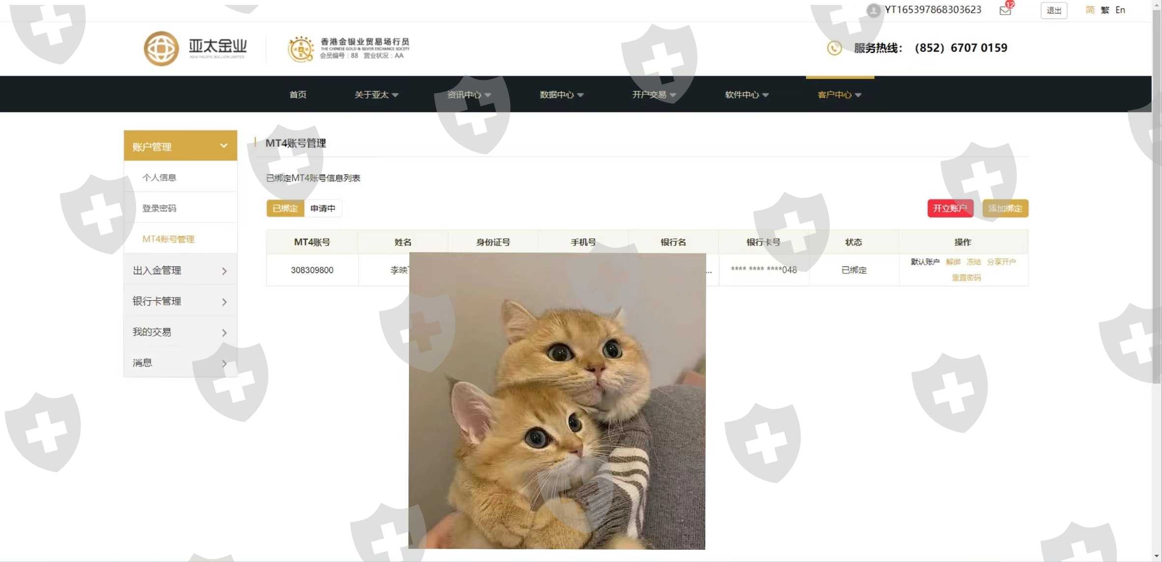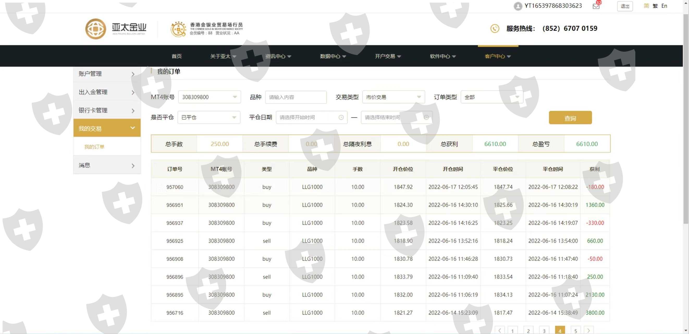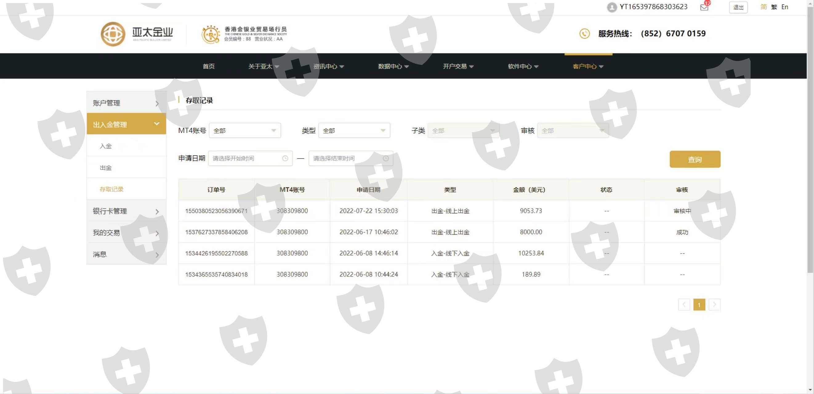 我在香港金银业贸易场88号会员亚太金业公司开户并入金10443.73美金进行交易,我的交易账户是308309800。一个多月的时间,我只盈利6610美金,我在2022年7月22日申请9053.73美金出金,直到今天,仍然没有收到我的出金,后台出金状态一直都是审核中,出金一直没有进展也没有答复,请求维权。