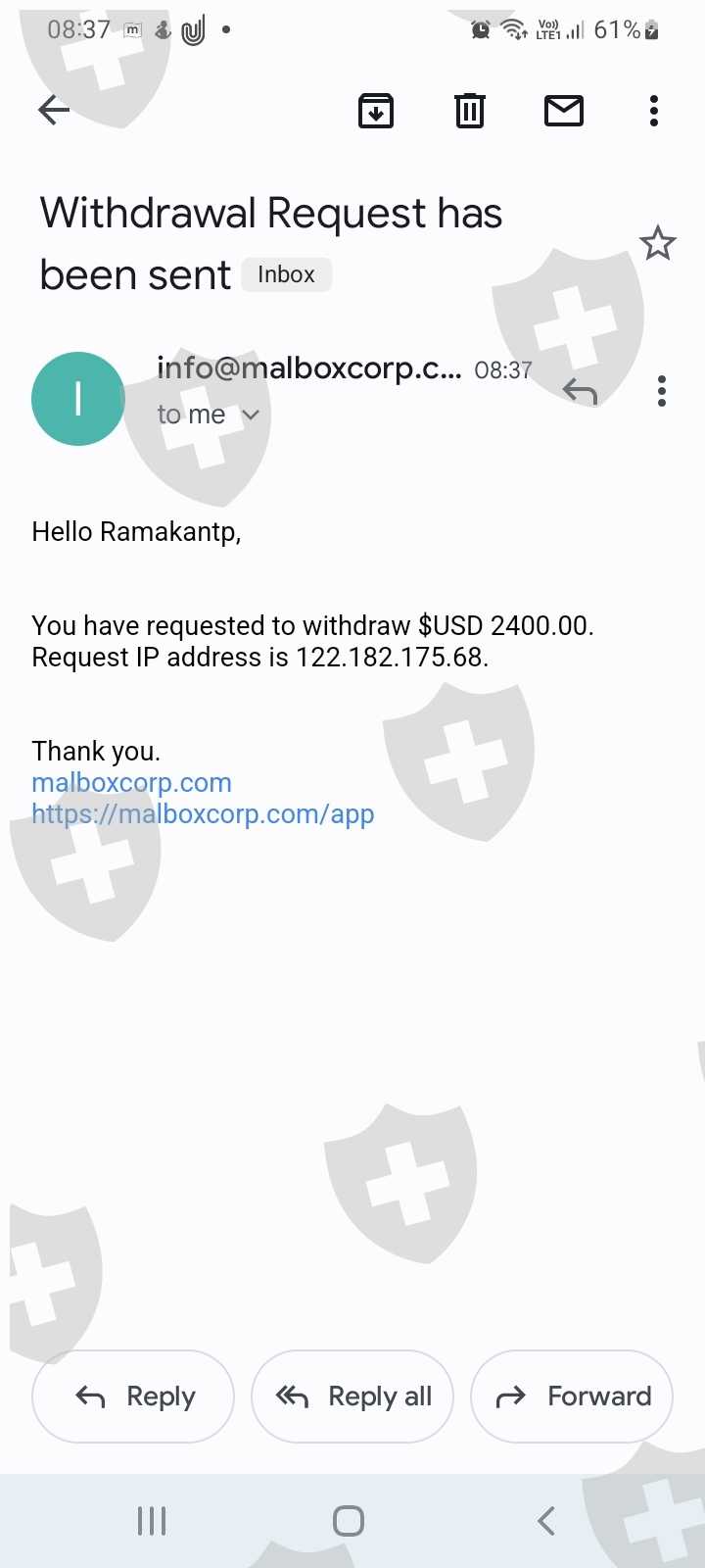 这是一家诈骗平台,我一个月前投资了300美元,他们24小时后提供15%的回报,但我无法提取利润,他们通过要求存入更多的税款来阻止提款,不要把你辛苦赚来的钱投入到骗局中,我名为Elina Darzina的上线似乎是这个诈骗平台的一部分,因为她坚持要我通过推荐其他人来投入更多的钱,